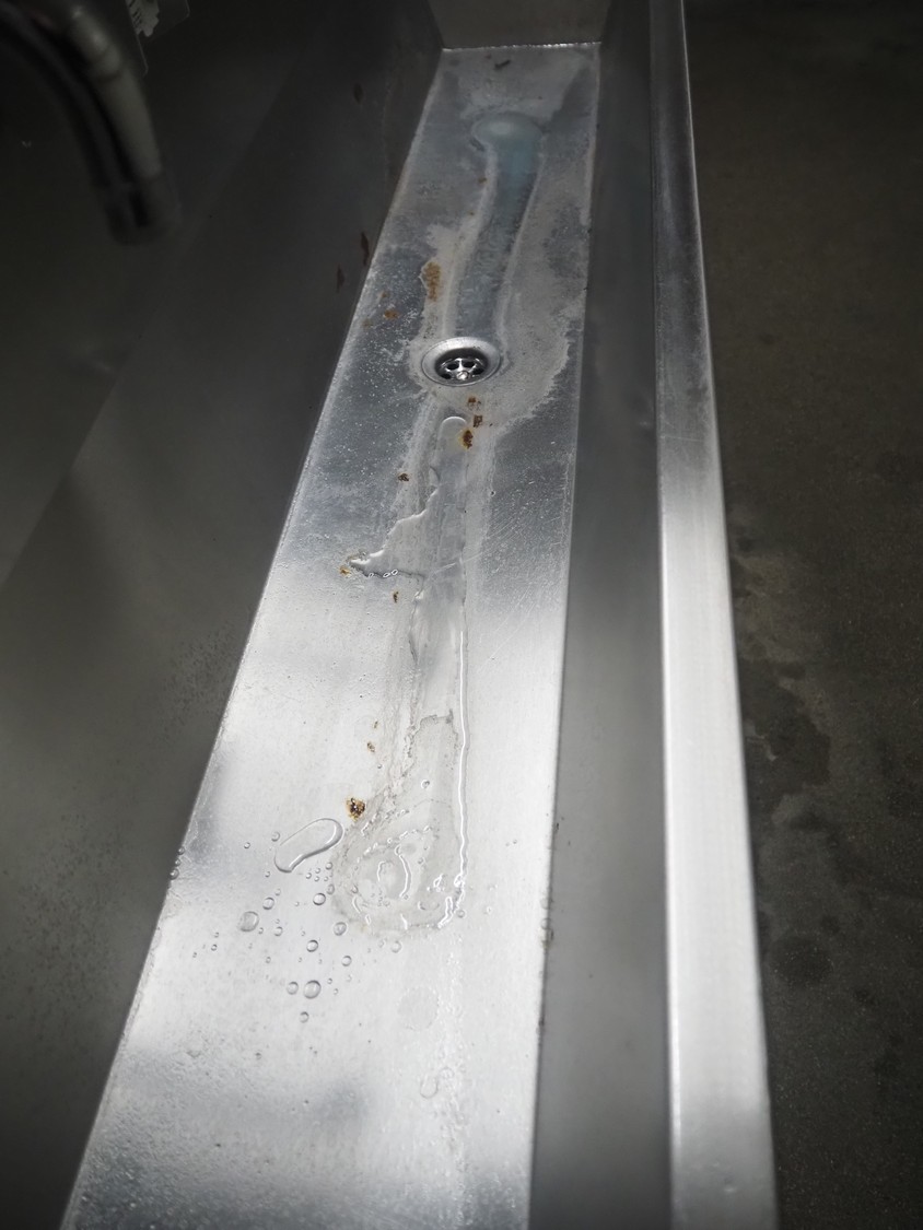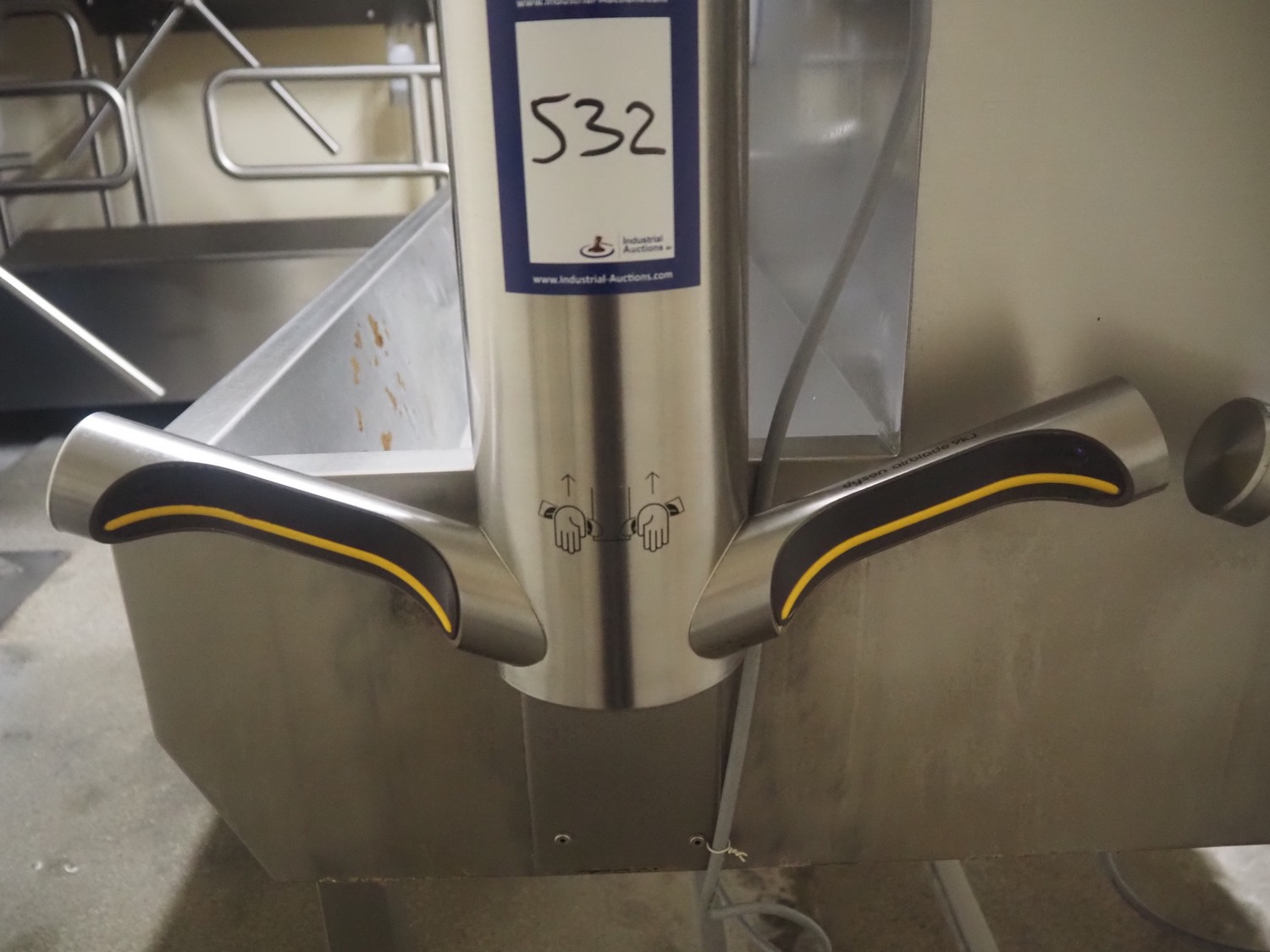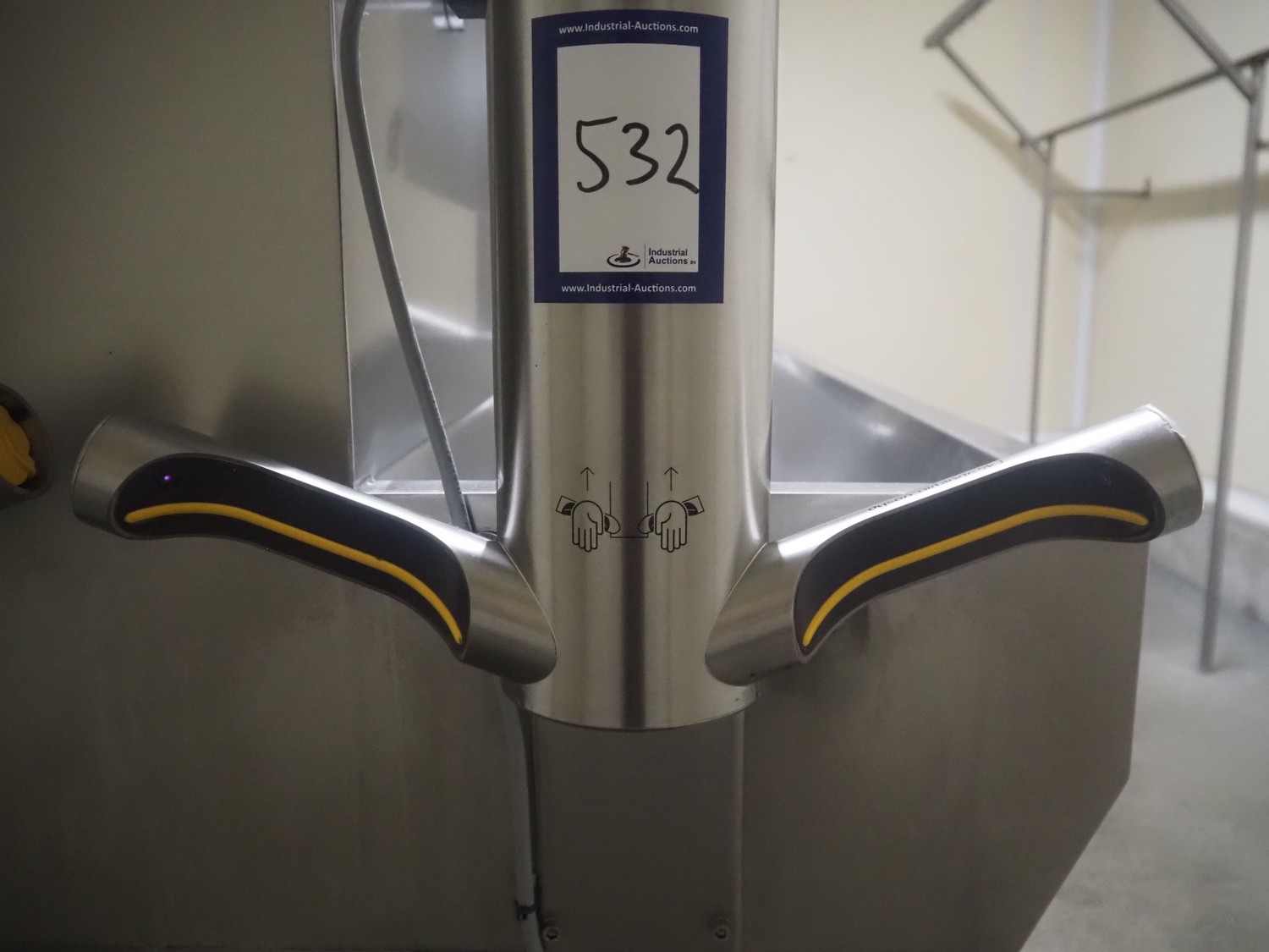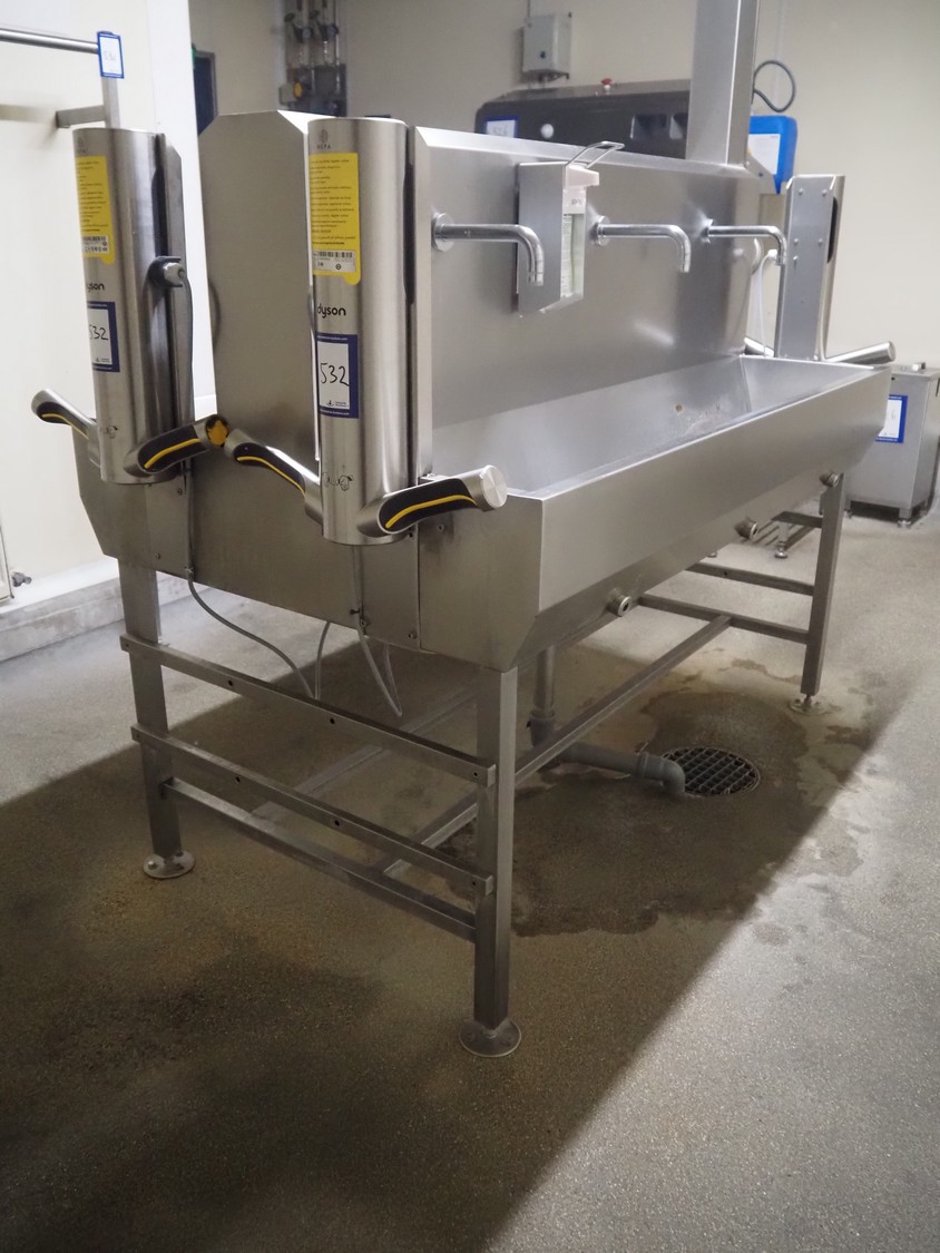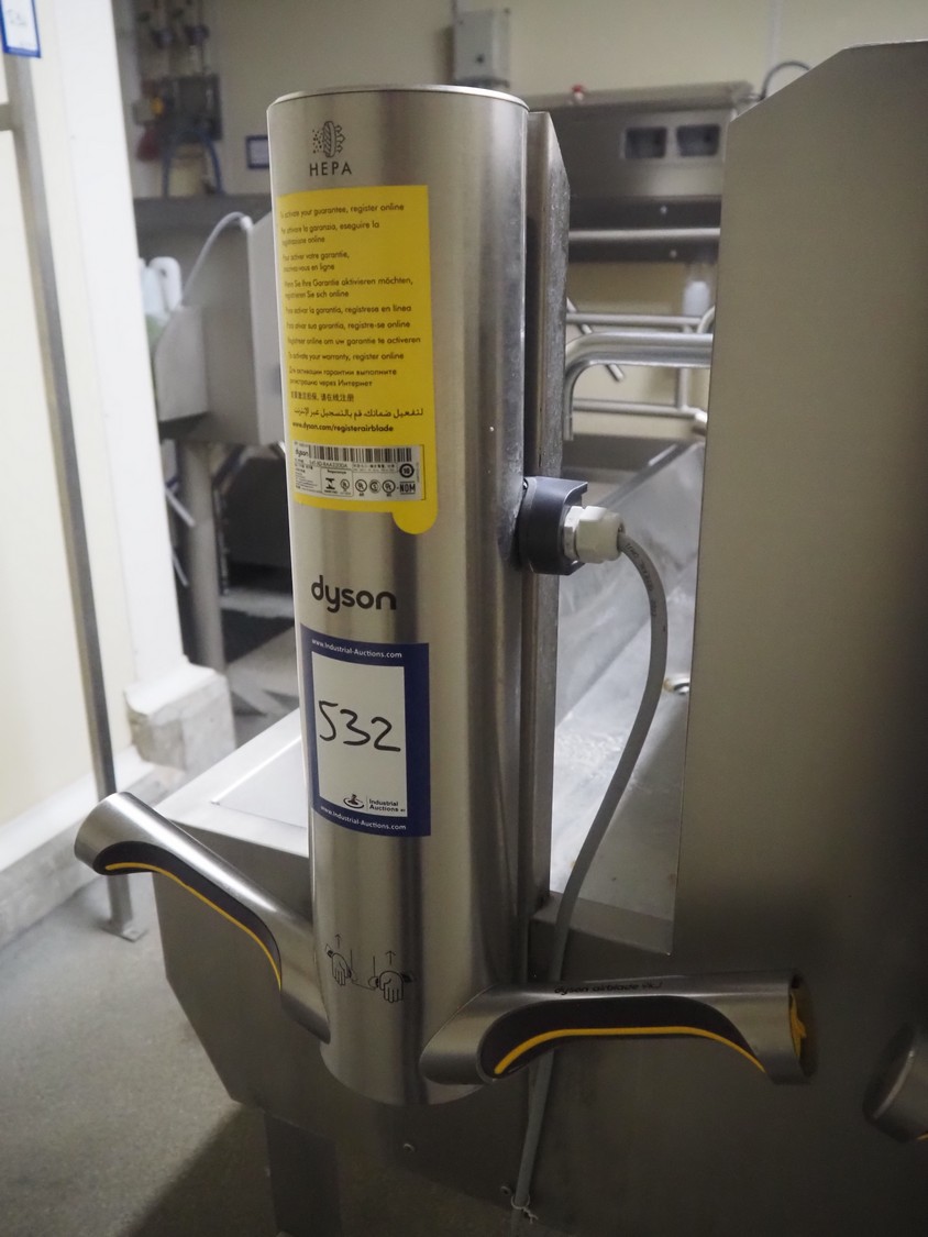 S/s sink with 6 faucets and 4 Dyson hand dryers, type hand dryers: (4x) HU03 HV, number: E4T-XD-MMA0335A, E4T-XD-RAA3200A, E4T-XD-NGA0334A, E4T-XD-RGA7091A, 200/240 V, 50/60 Hz, 900 W, 24 Ip, total dimensions: 1850 mm x 980 mm x 1360 mm.
