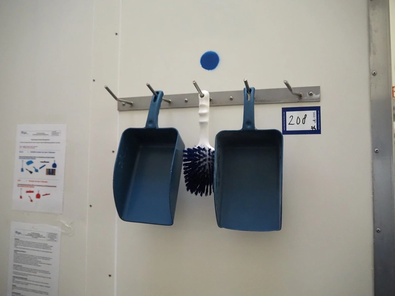 2 s/s pegs with 2 plastic squeegees, hand brush and 2 scoops, length peg: 450 mm and 650 mm, s/s hose reel, dimensions: 400 mm x 300 mm x 600 mm.