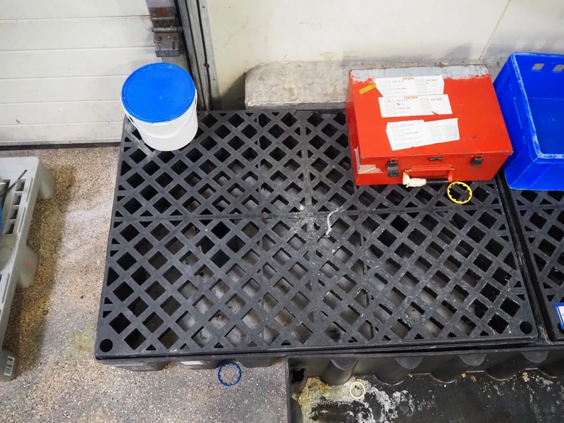 3 Denios plastic drip trays, dimensions: (3x) 1200 mm x 830 mm x 350 mm. 1 is missing top cover.
