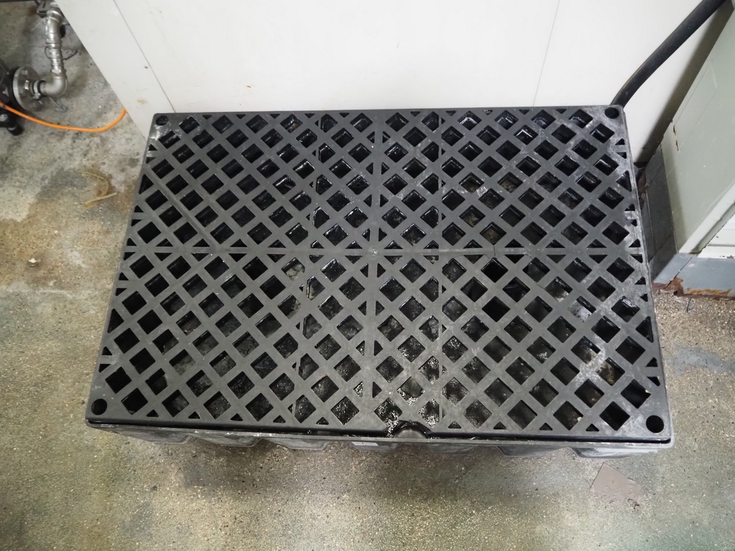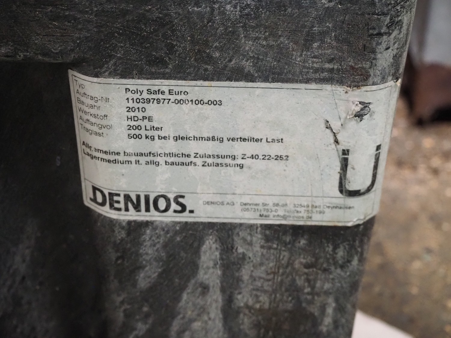 Denios plastic drip tray, type: Poly Safe Euro, year of construction: 2010, volume: 200 liter, capacity: 500 kg, dimensions: 1230 mm x 830 mm x 370 mm.