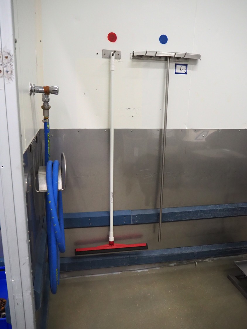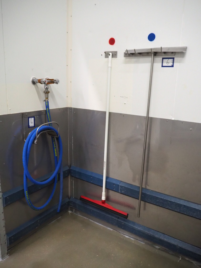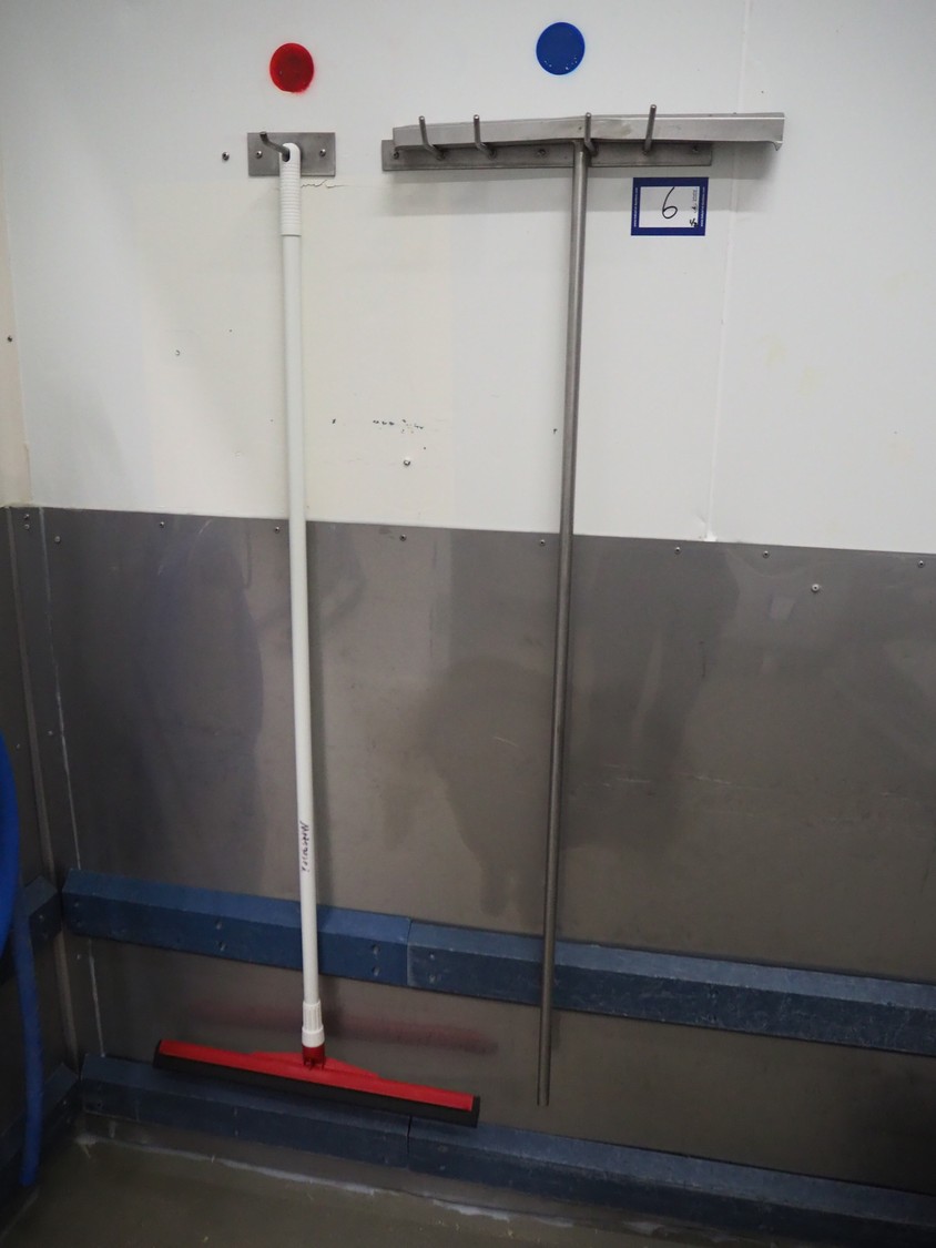 2 s/s pegs with s/s shovel and plastic broom, length pegs: 600 mm and 150 mm, s/s hose reel with hose, dimensions hose reel: 500 mm x 300 mm x 400 mm.