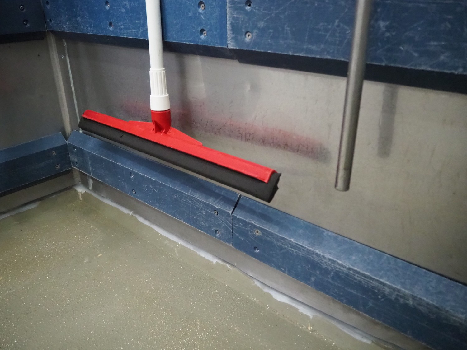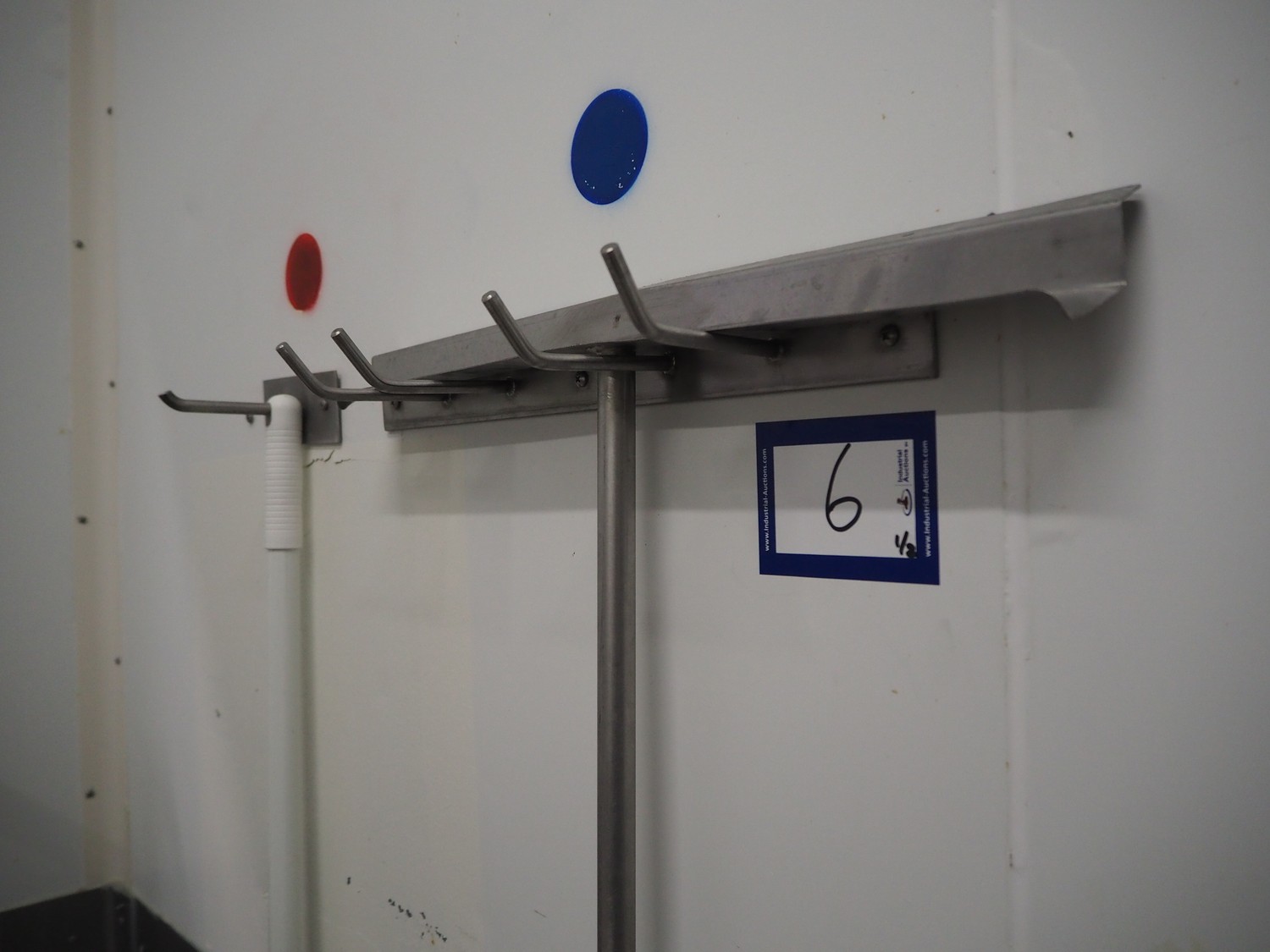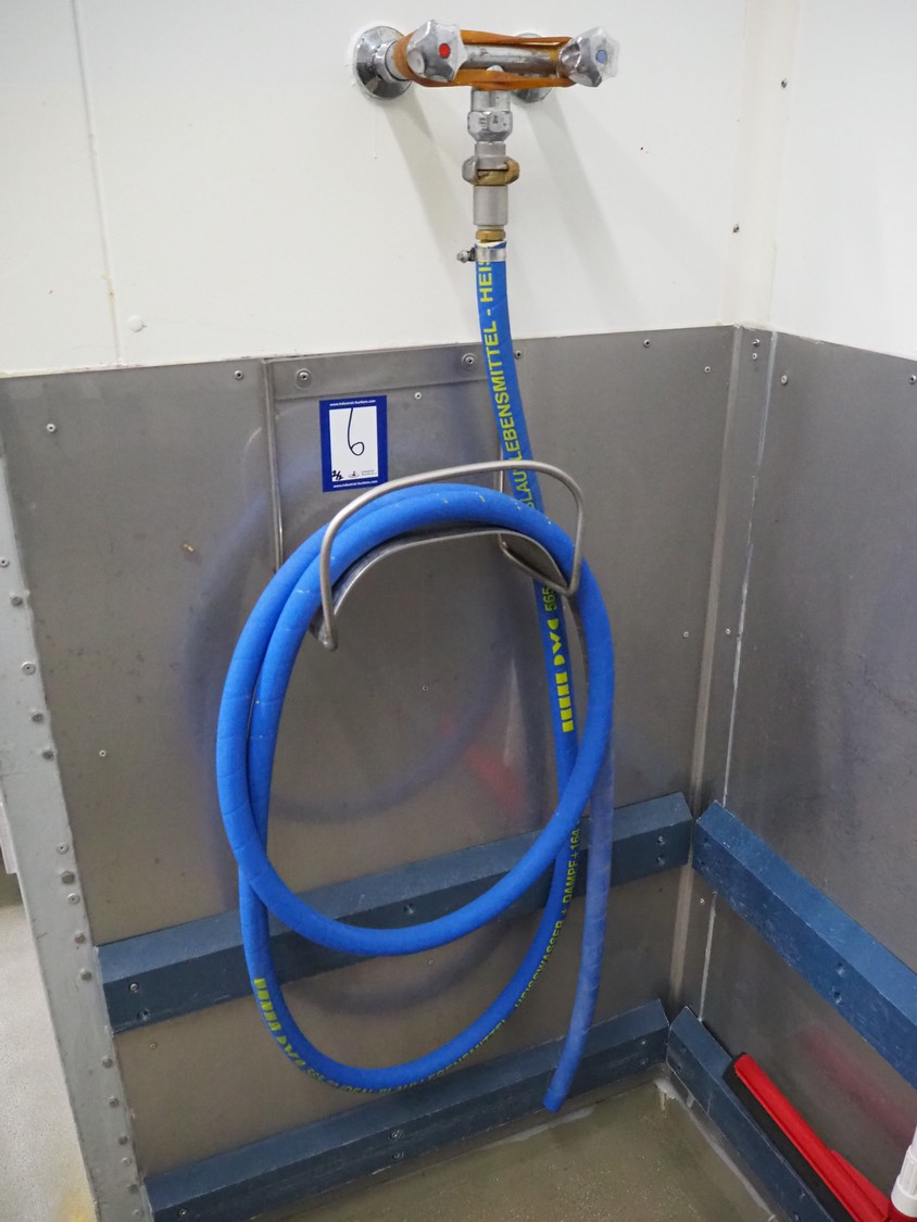 2 s/s pegs with s/s shovel and plastic broom, length pegs: 600 mm and 150 mm, s/s hose reel with hose, dimensions hose reel: 500 mm x 300 mm x 400 mm.