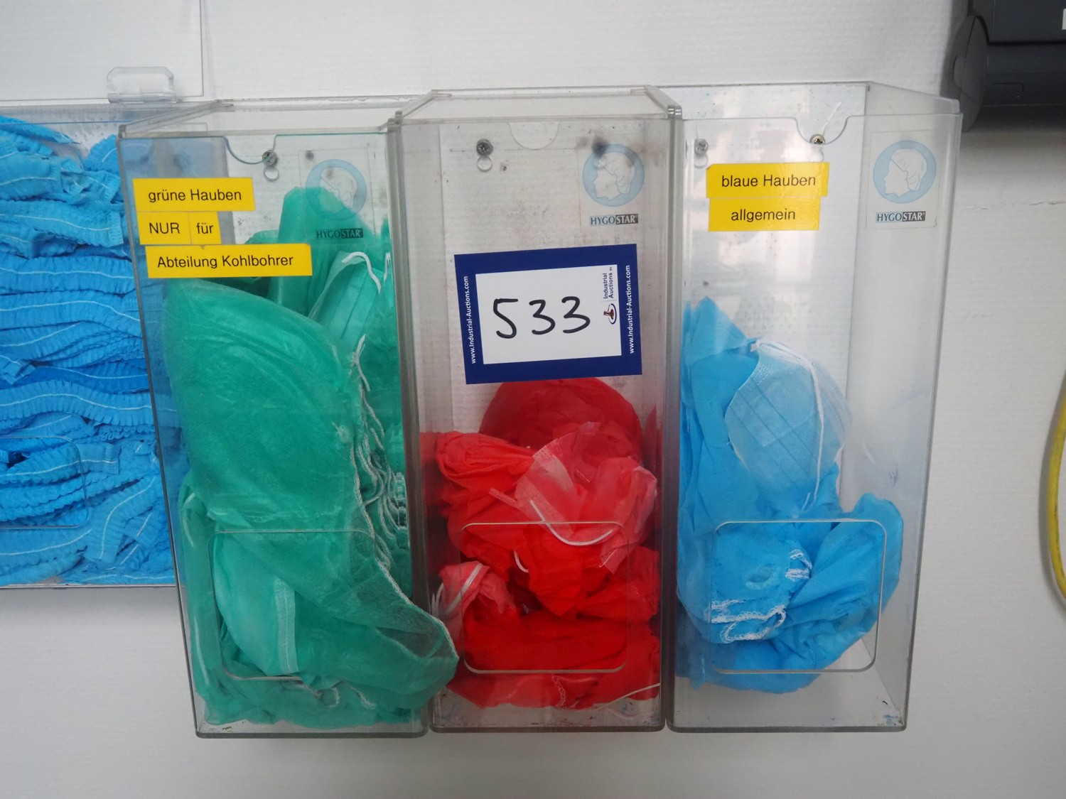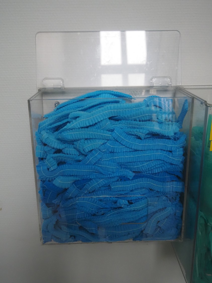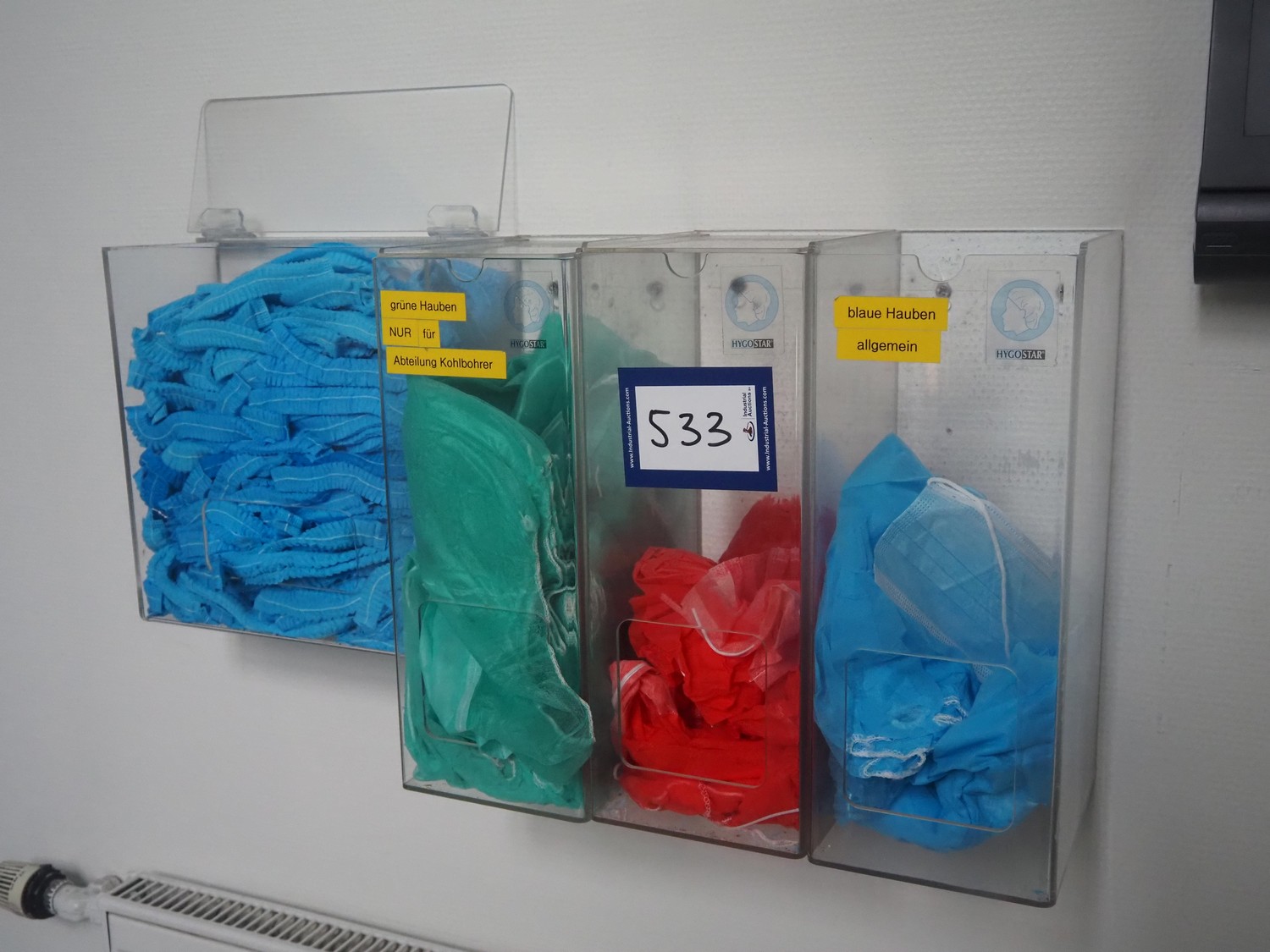 4 plastic cabinets for hair nets, dimensions: (3x) 200 mm x 150 mm x 380 mm, (1x) 300 mm x 130 mm x 320 mm.