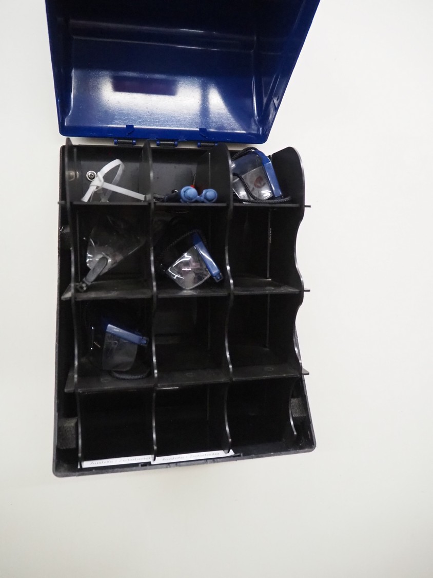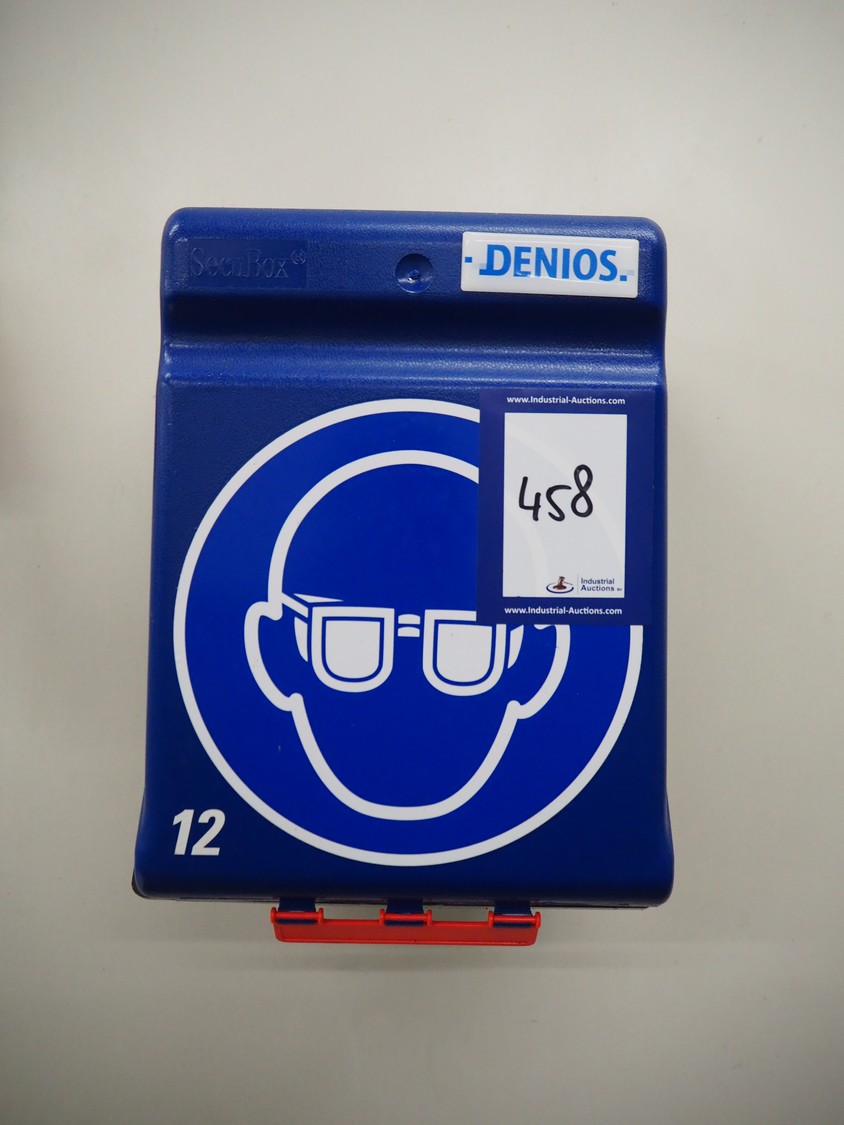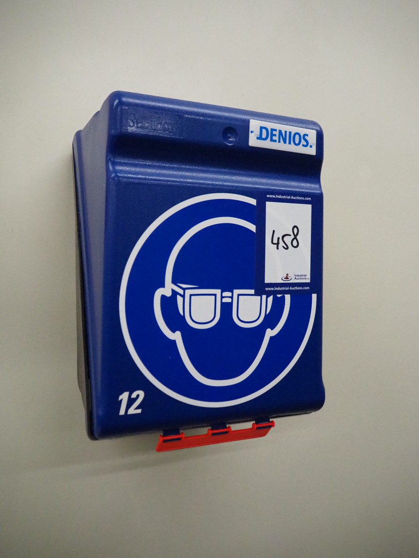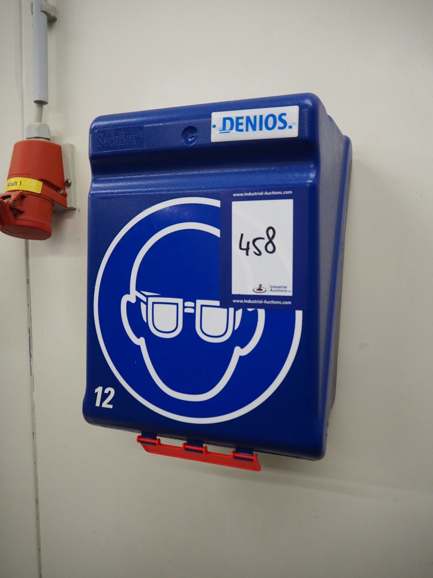 Denios plastic eye protection cabinet with 12 places, dimensions: 240 mm x 200 mm x 300 mm. Including 5 safety glasses.