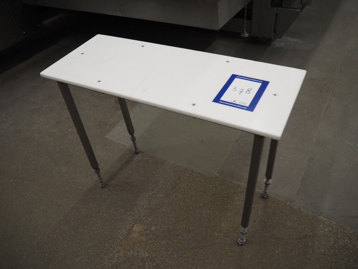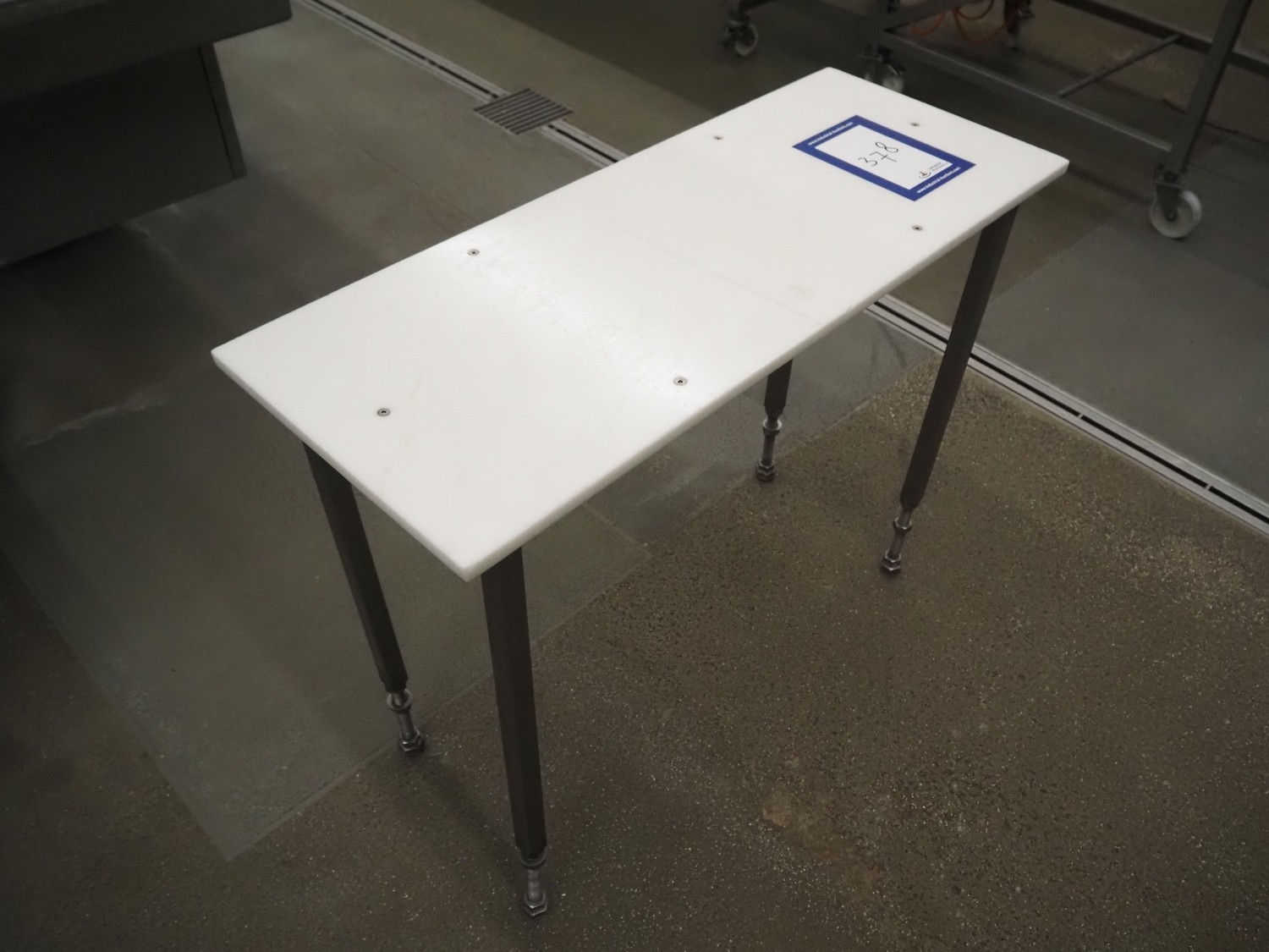 S/s table with plastic worktop, thickness worktop: 35 mm, total dimensions: 600 mm x 400 mm x 800 mm.