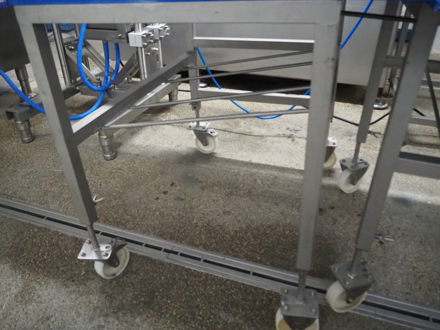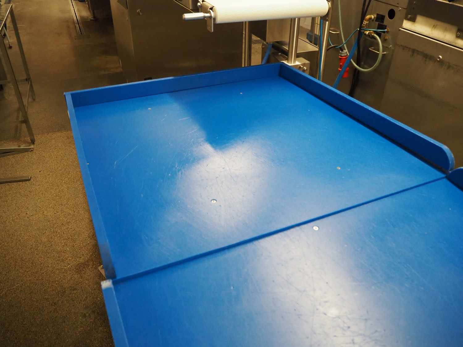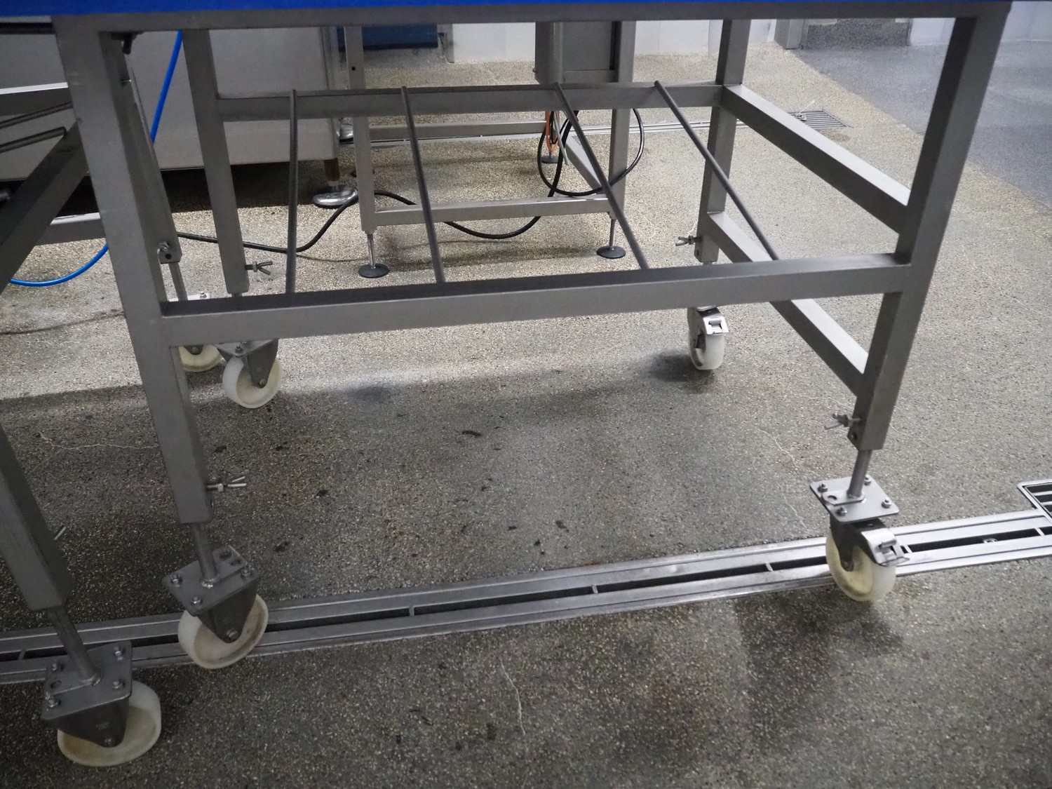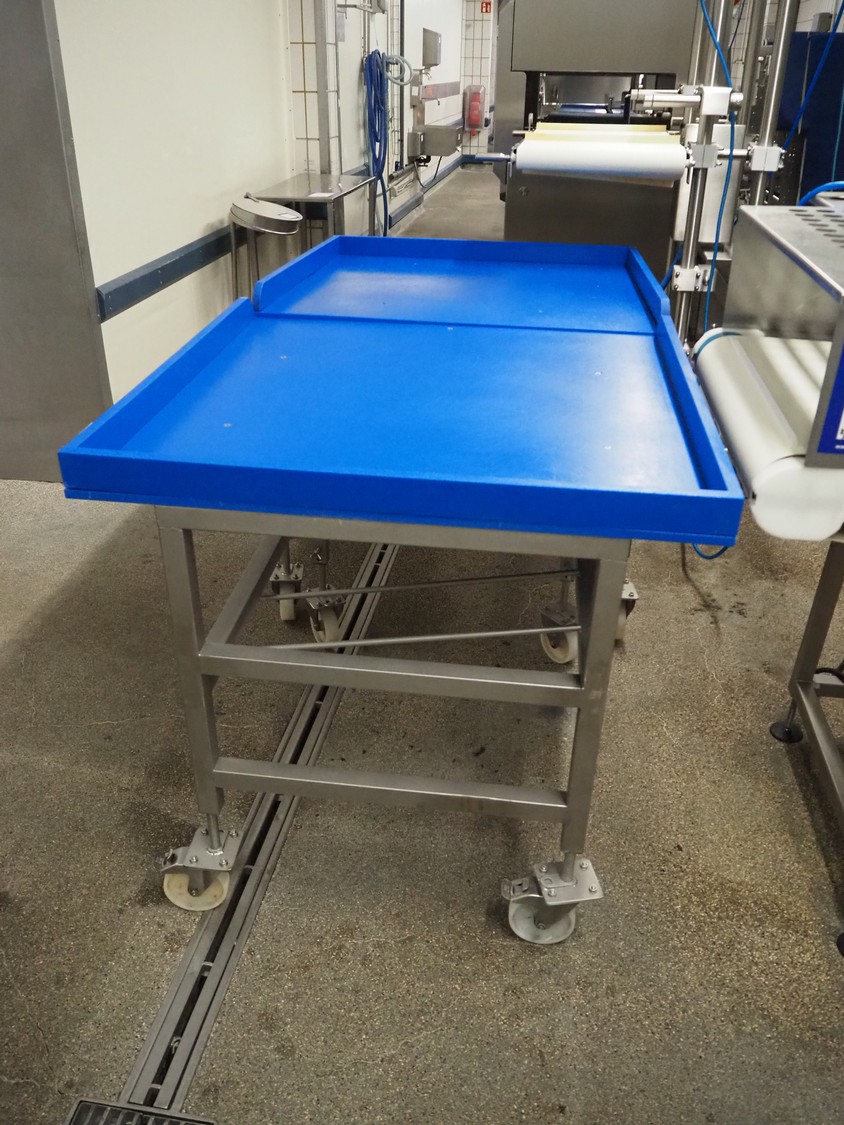 2 mobile tables, s/s frame, plastic top, dimensions: (2x) 1000 mm x 1000 mm x 950 mm.