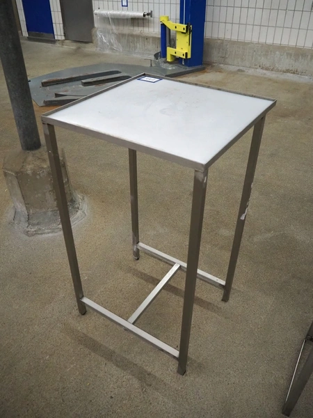S/s table with plastic worktop, dimensions: 650 mm x 650 mm x 1120 mm.