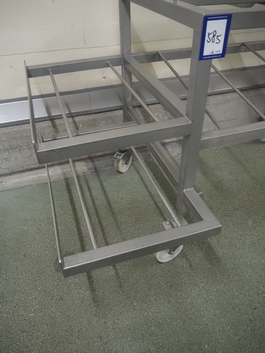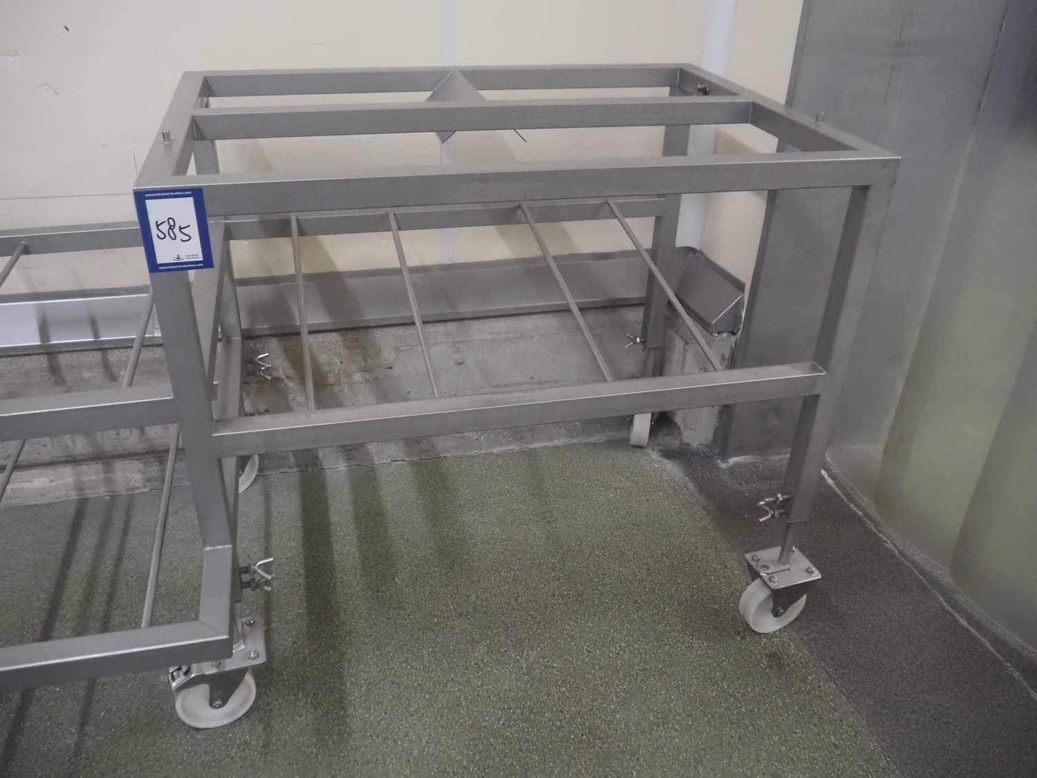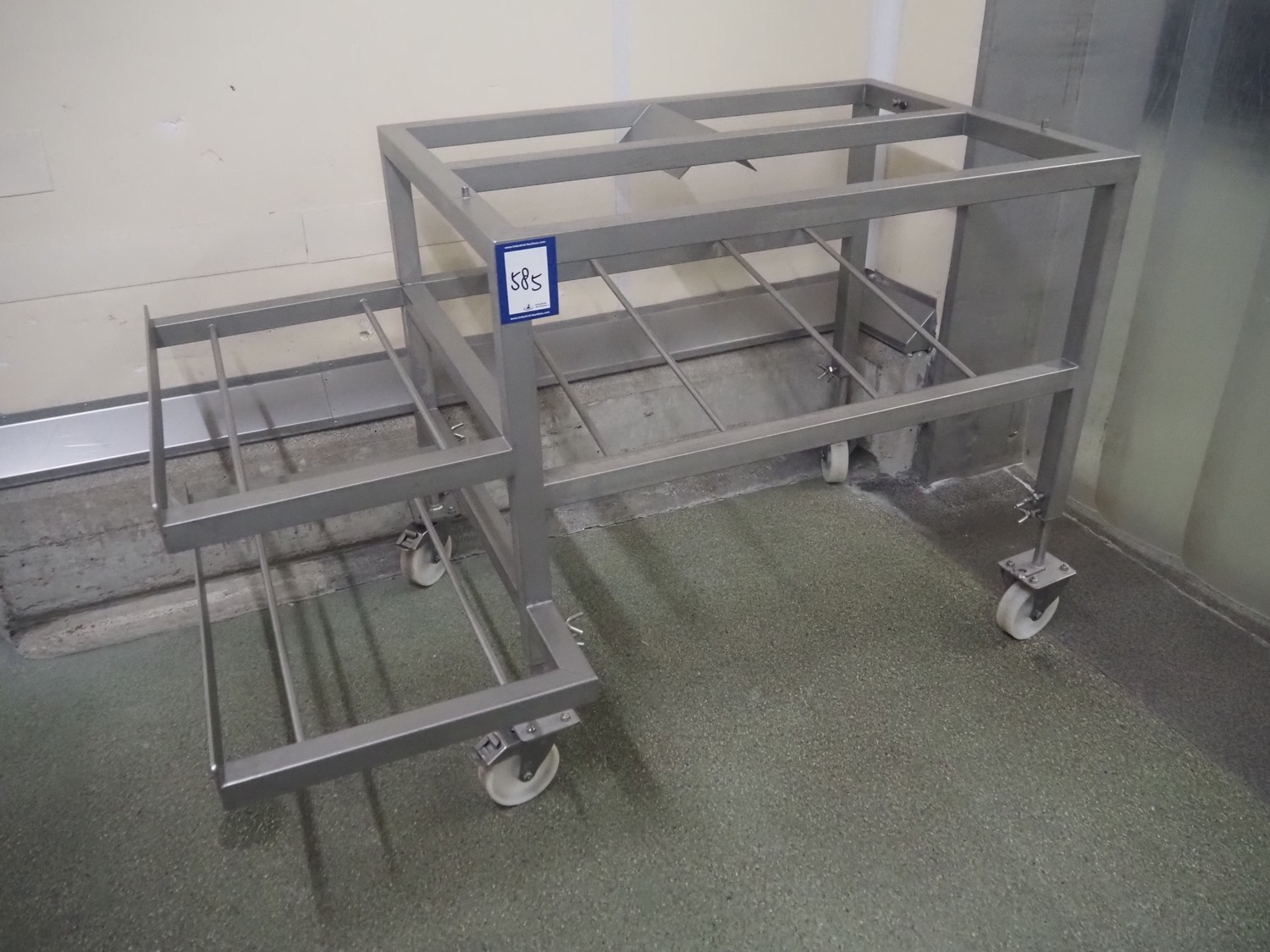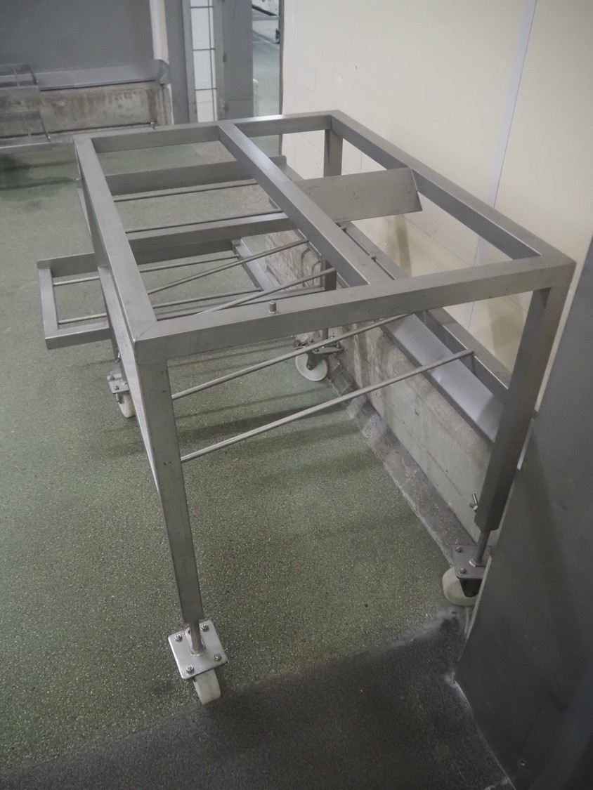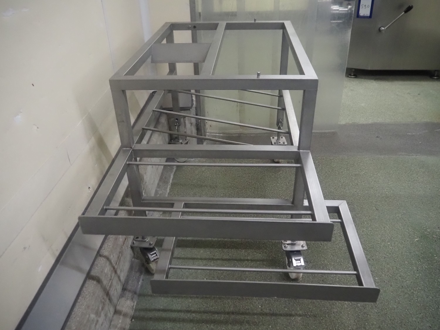 S/s mobile frame with holder for 2x E2-crates, dimensions: 1420 mm x 880 mm x 800 mm. Missing plastic worktop.