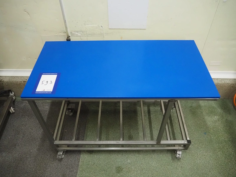 S/s mobile table, plastic top, dimensions: 1200 mm x 600 mm x 830 mm.