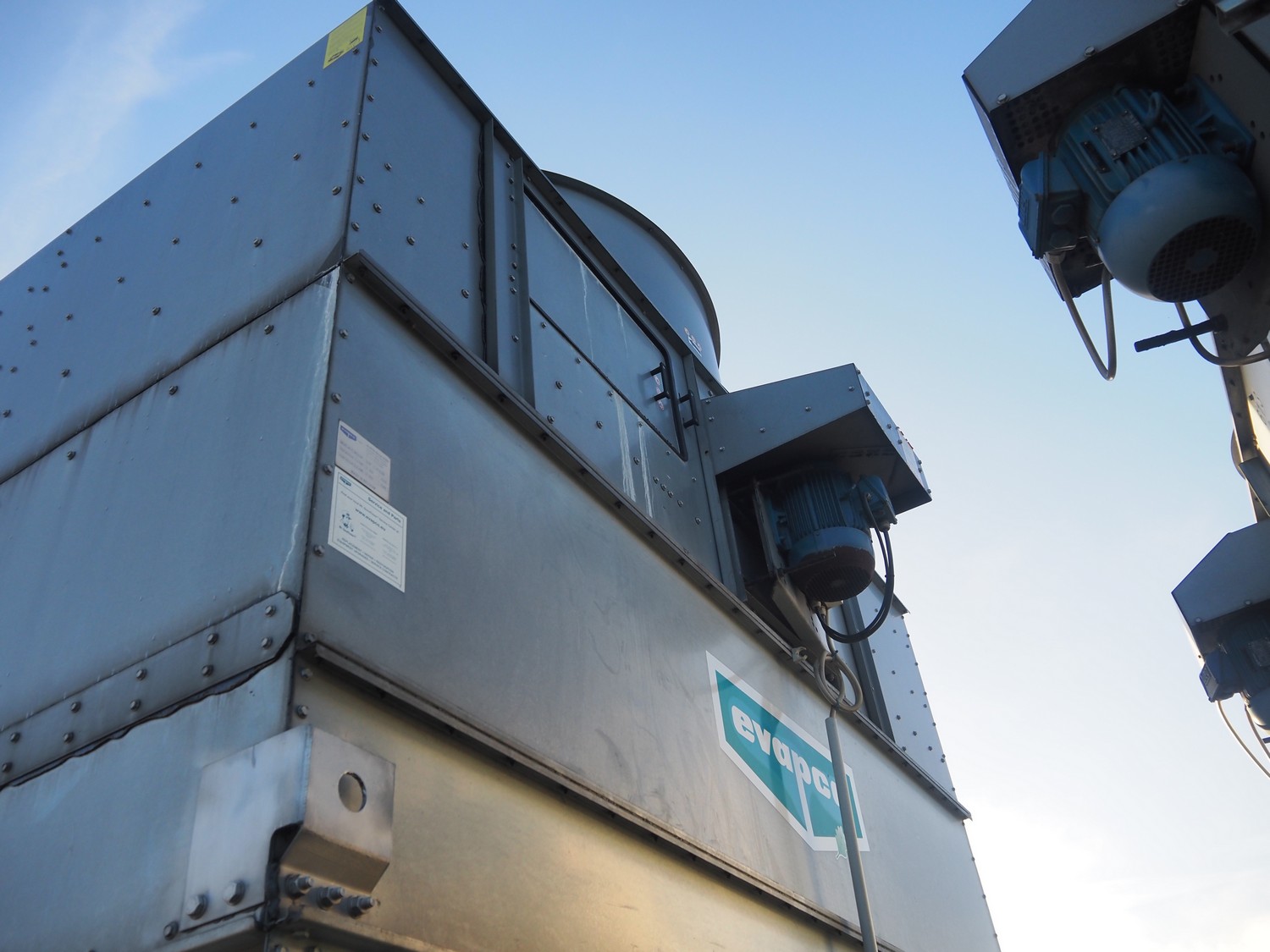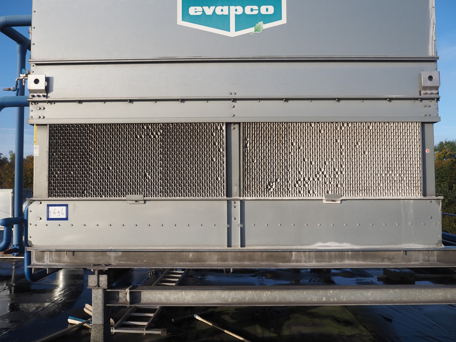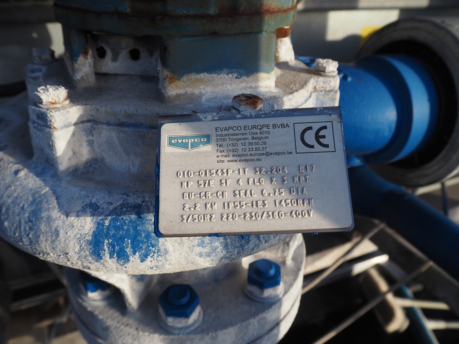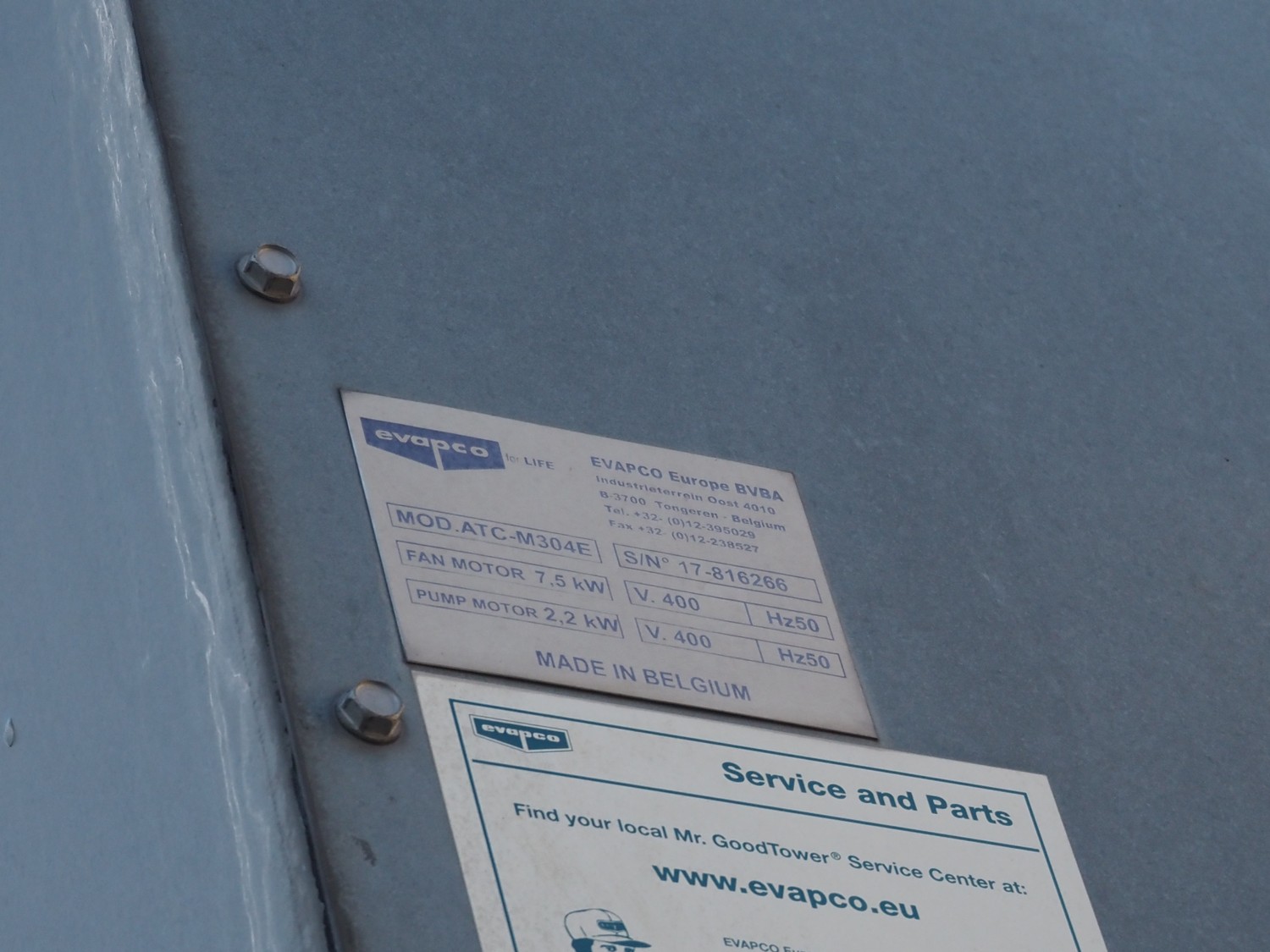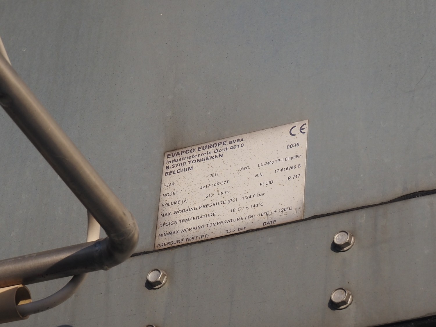 Evapco Europe BVBA evaporative condenser, model: 4x12-10R/37T, serial number: 17-816266-B, year of construction: 2017, 1 fan, volume: 613 liters, fluid: R-717, working pressure: -1/24.0 bar, design temperature: -10°C to +140°C, minimum/maximum working temperature: -10°C to +120°C, dimensions: 3650 mm x 2400 mm x 4500 mm.