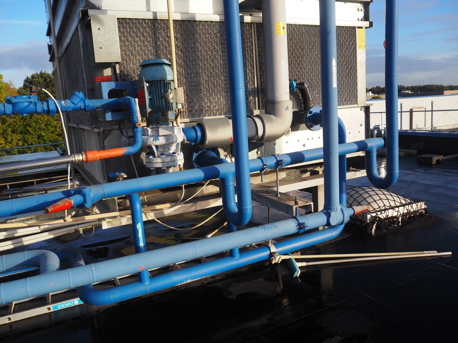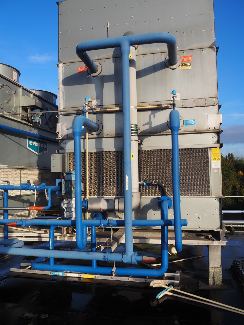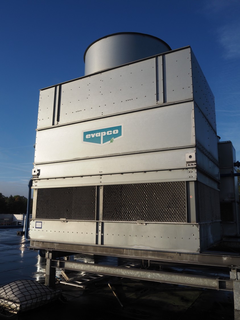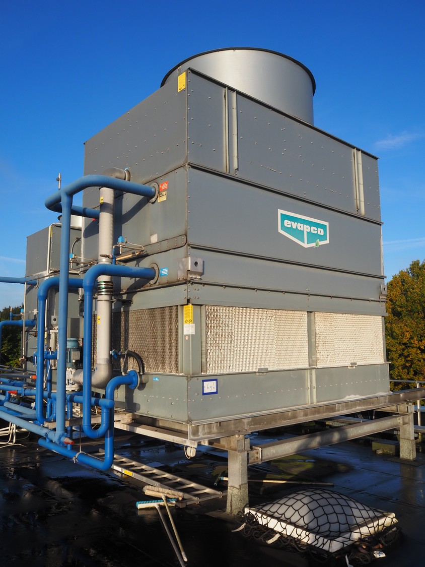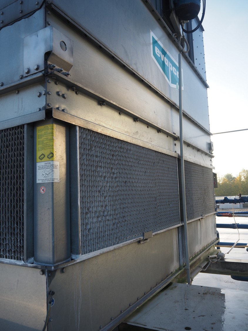 Evapco Europe BVBA evaporative condenser, model: 4x12-10R/37T, serial number: 17-816266-B, year of construction: 2017, 1 fan, volume: 613 liters, fluid: R-717, working pressure: -1/24.0 bar, design temperature: -10°C to +140°C, minimum/maximum working temperature: -10°C to +120°C, dimensions: 3650 mm x 2400 mm x 4500 mm.