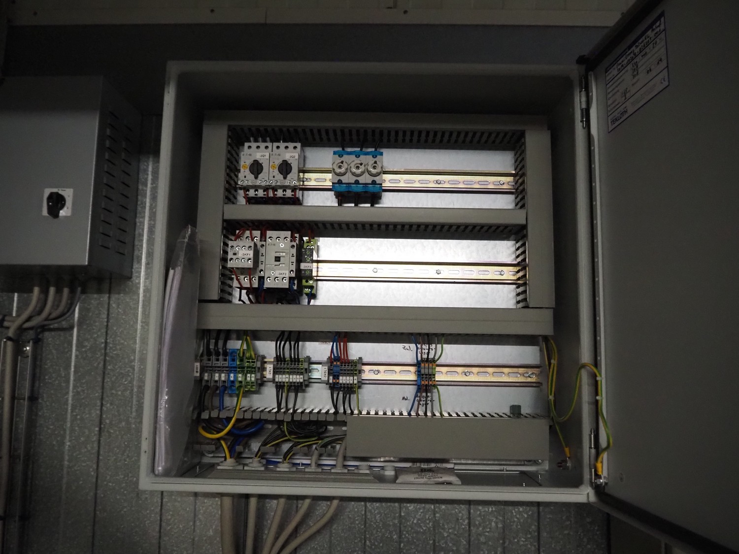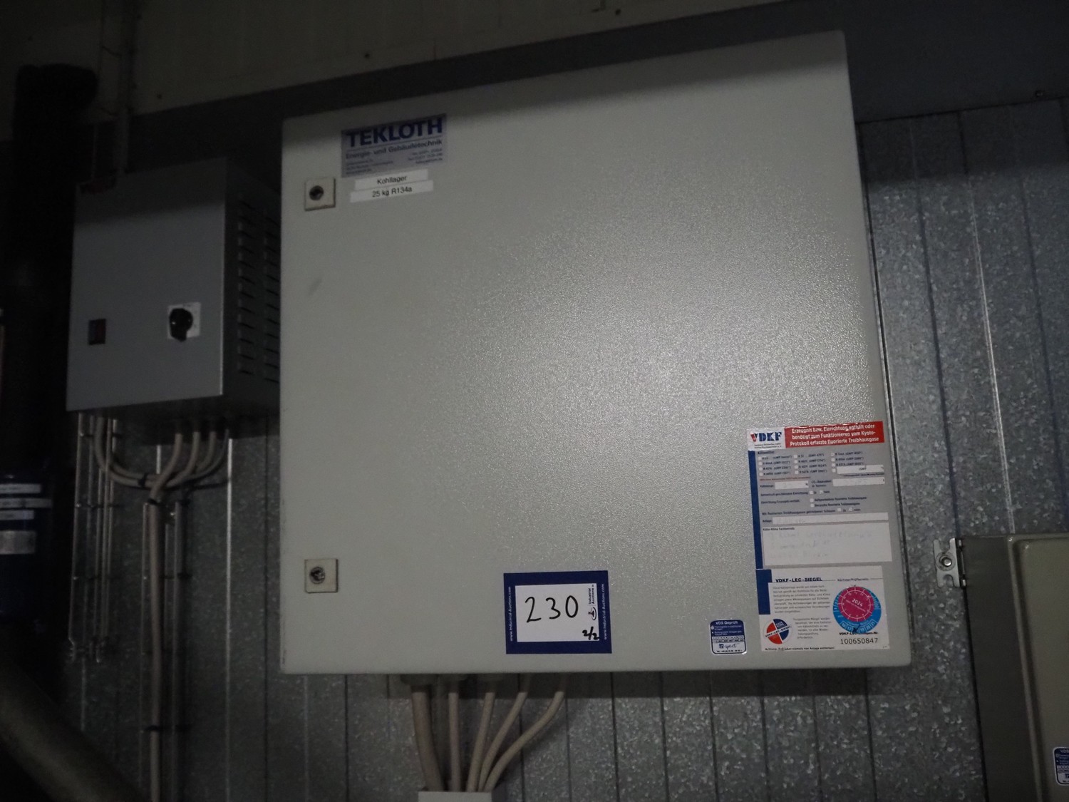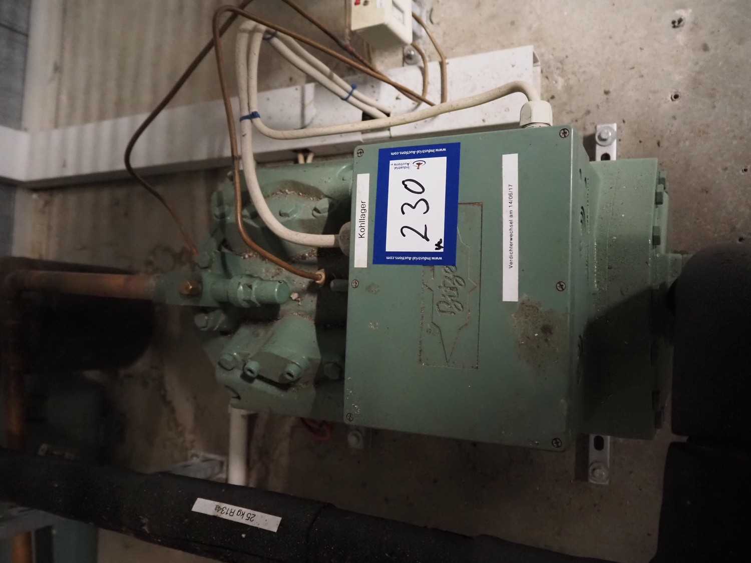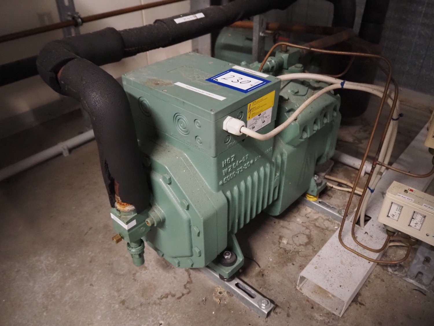 Bitzer Kühlmaschinenbau GmbH cooling compressor, type: 4NES-12Y-40P, serial number: 1692510508, 380-420 V, 50/70 Hz, 15.9/25.2 A, capacity: 56.2/79.5 m³ per hour, dimensions: 600 mm x 300 mm x 500 mm, switch cabinet, dimensions: 600 mm x 250 mm x 600 mm.