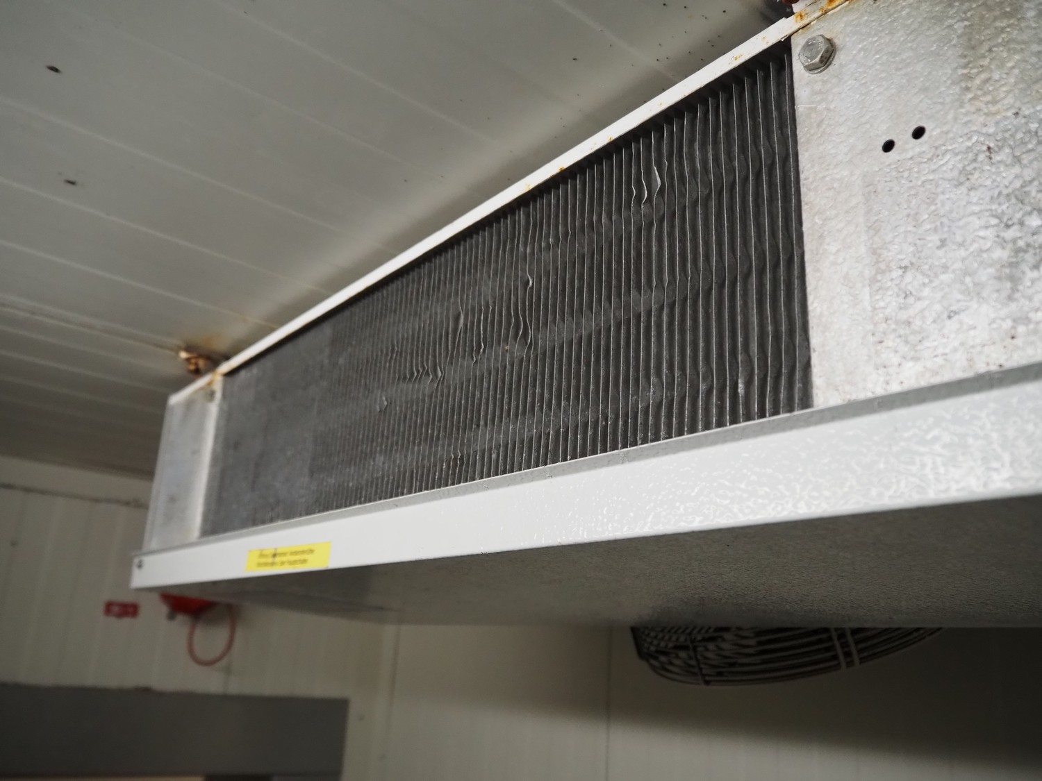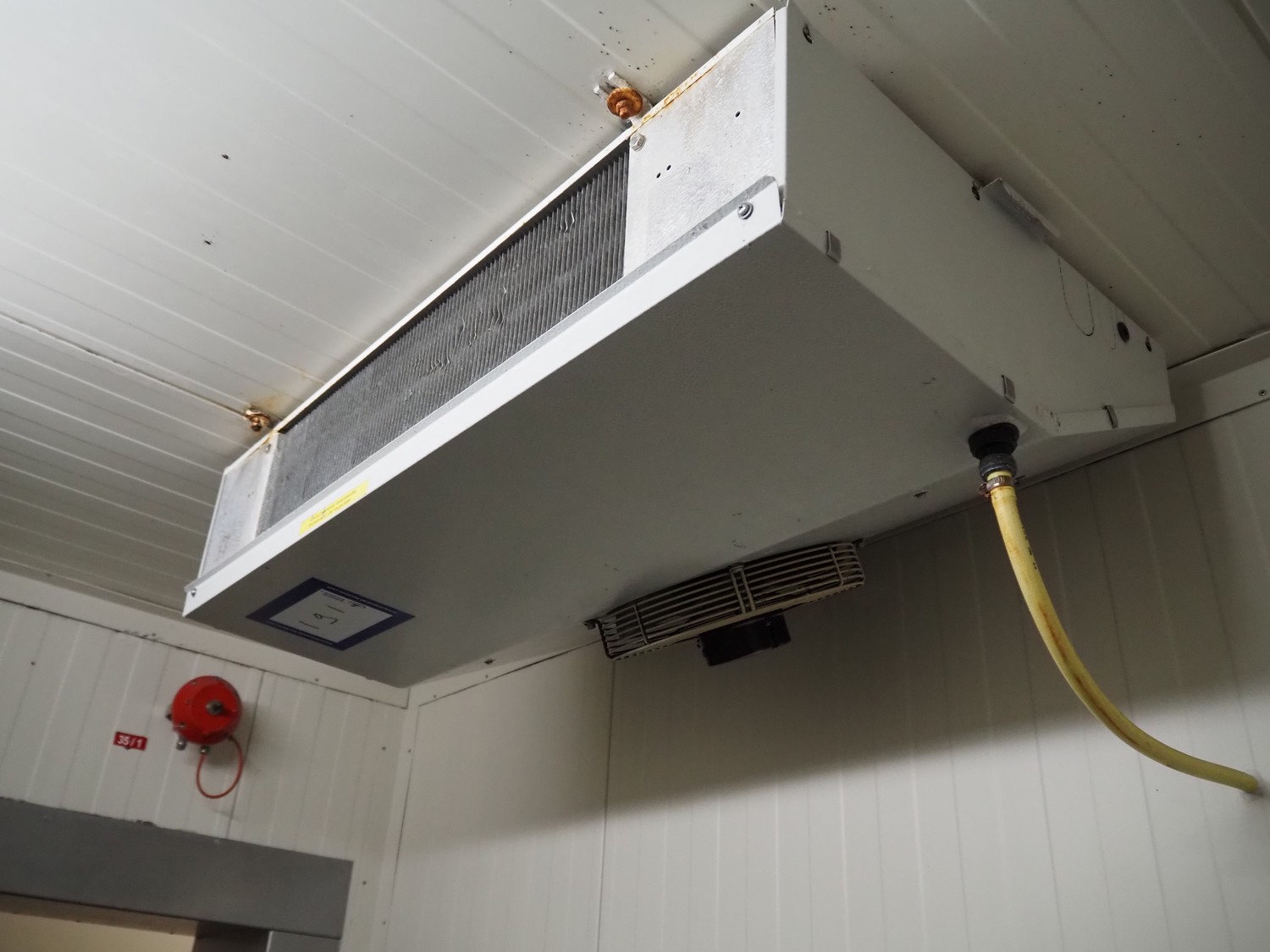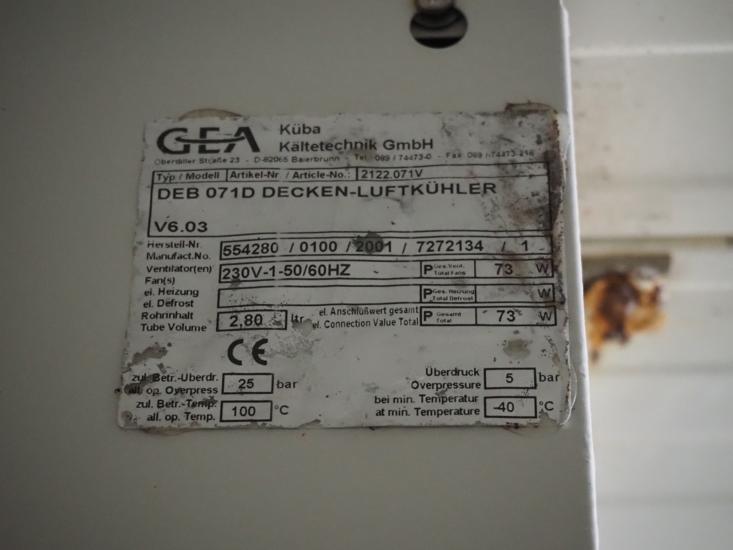 GEA Küba Kältetechnik GmbH evaporator, type: DEB 071D DECKEN-LUFTKÜHLER, fabrication number: 554280 / 0100 / 2001 / 7272134 / 1, 230 V, 1 Ph, 50/60 Hz, 73 W, volume: 2.8 liter, temperature range: 100/-40°C, dimensions: 1050 mm x 750 mm x 250 mm.
