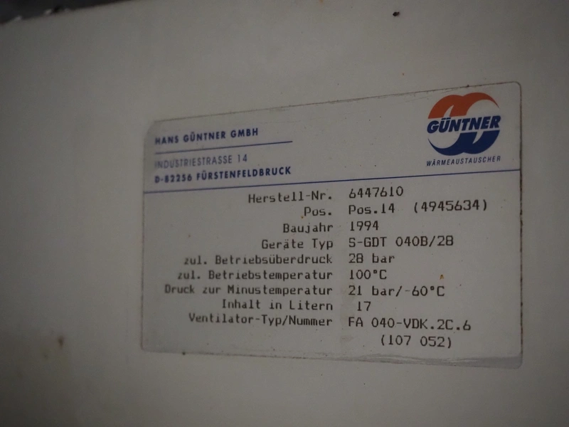 Güntner GmbH & Co. KG evaporator, type: S-GDT 040B / 2B, production number: 6447610, year of construction: 1994, maximum working pressure: 28 bar, maximum working temperature: 100˚C, volume: 17 liter, 2 fans, dimensions: 1200 mm x 1000 mm x 600 mm.