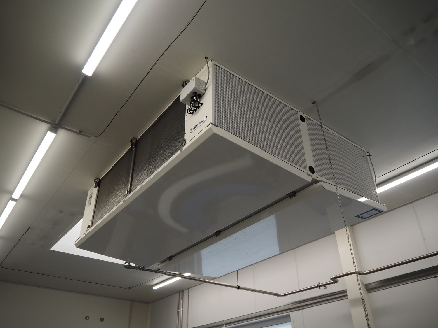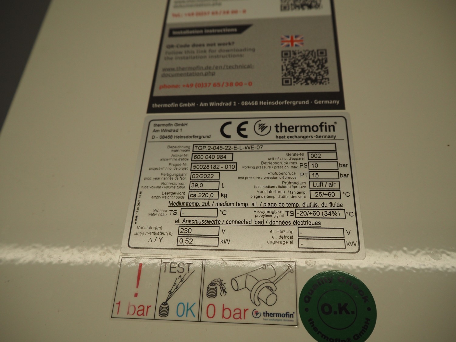 Thermofin GmbH evaporator, model: TGP.2-045-22-E-L-WE-07, unit number: 002, year of construction: 2022, 230 V, 0.52 kW, maximum working pressure: 15 bar, medium temperature allowable - propylene glycol: TS - 20/+60 (34%) 60˚C, empty weight: 220 kg, dimensions: 2400 mm x 2000 mm x 800 mm.