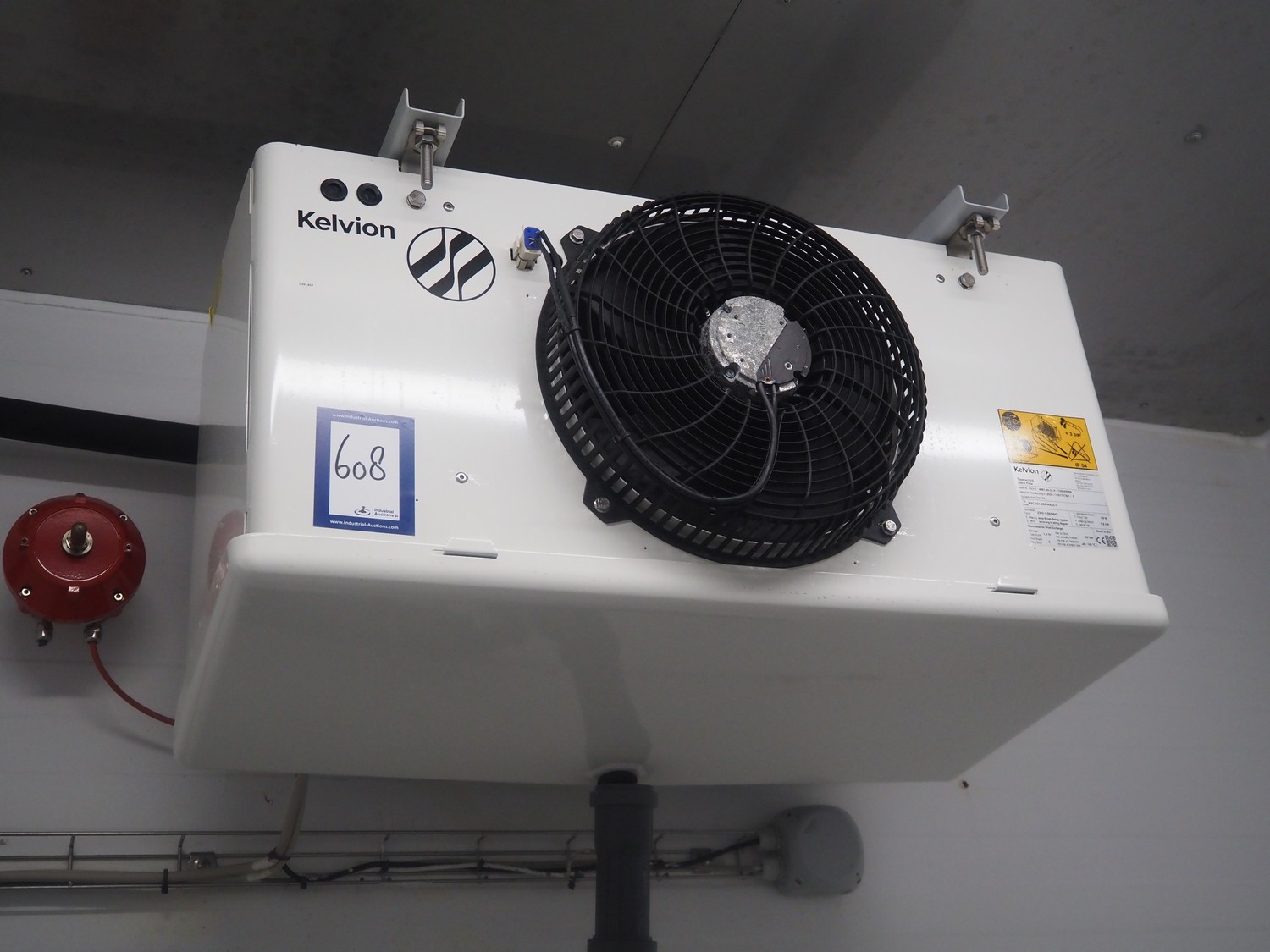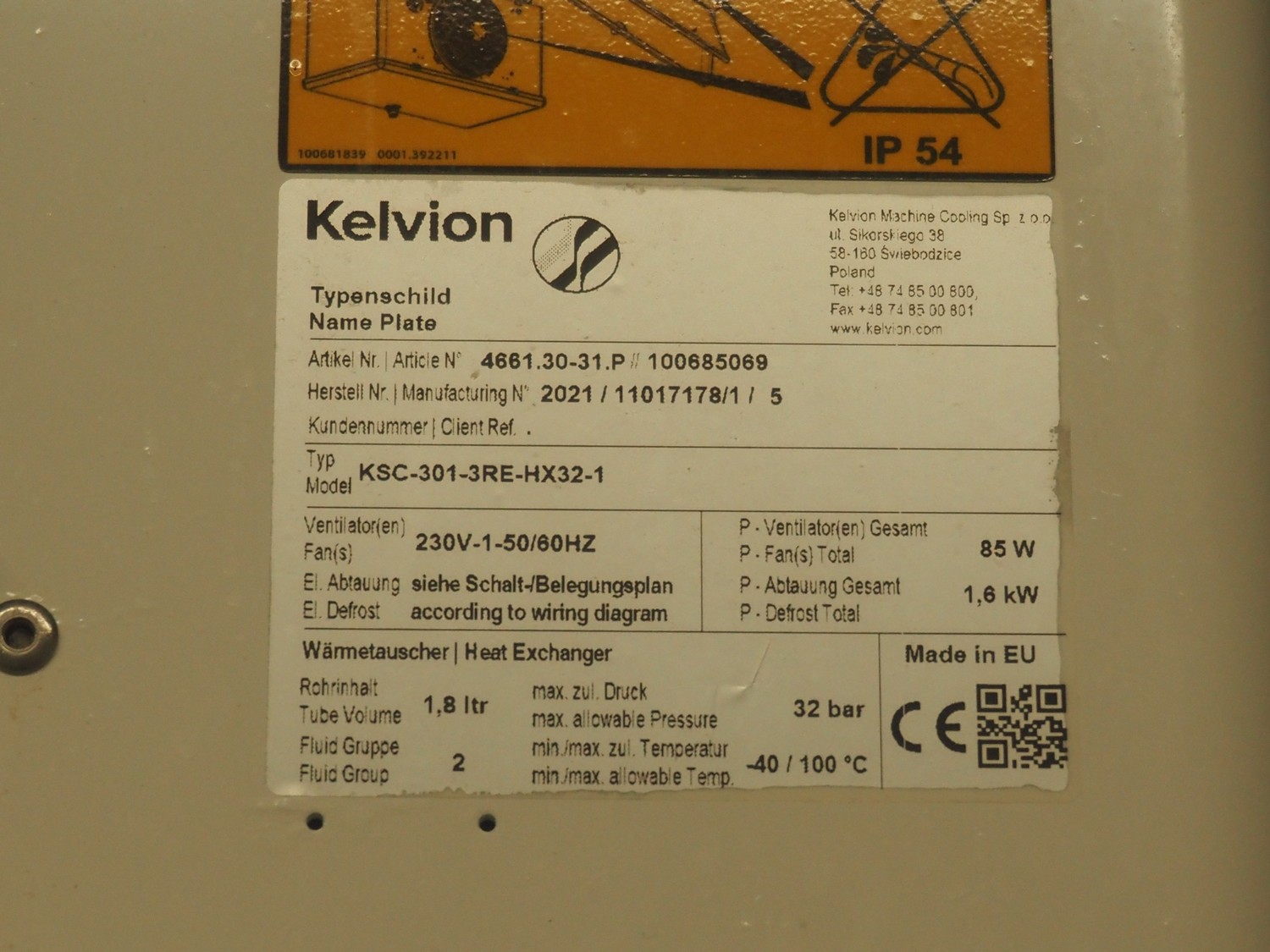 Kelvion evaporator, 1 fan, type/model: KSC-301-3RE-HX32-1, number: 4661.30-31.P, year of construction: 2021, 230 V, 1 Ph, 50/60 Hz, 1.6 kW, volume: 1.8 liter, dimensions: 800 mm x 450 mm x 400 mm.