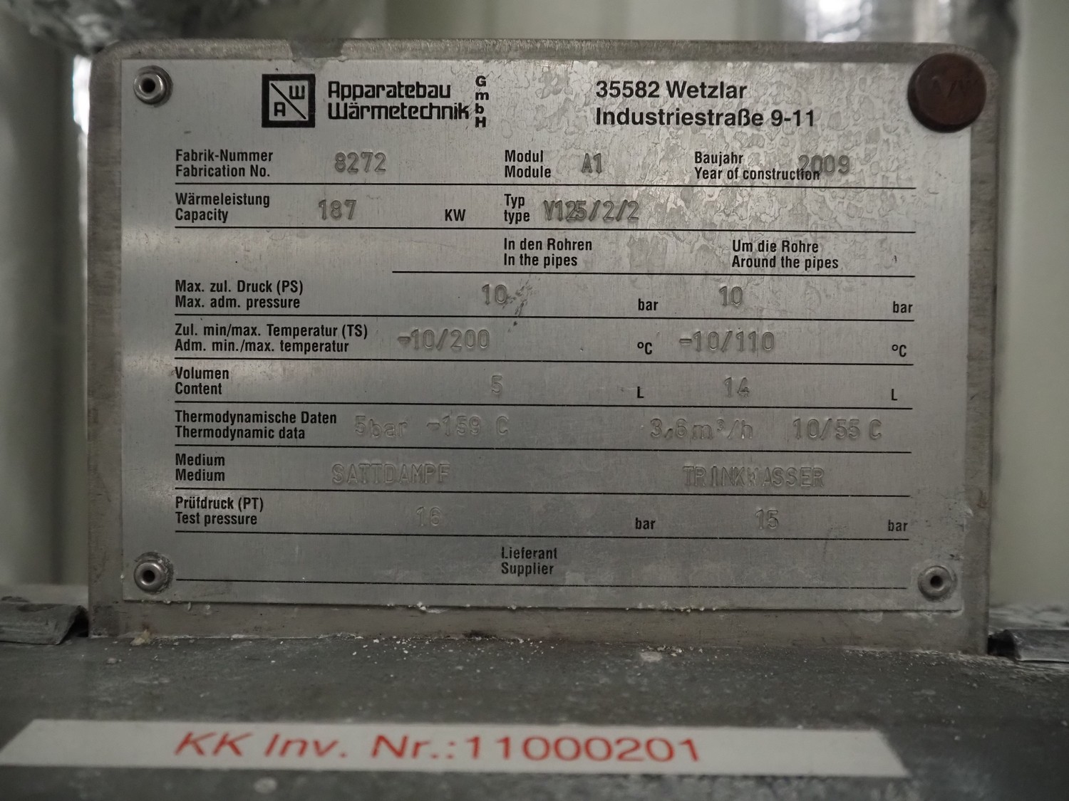 2 Apparatebau Wärmetechnik GmbH heat exchangers, type: V125/2/2, number: 8272, year of construction: 2009, maximum pressure: 10 bar, volume: 5/14 liter, dimensions: (2x) 1600 mm x 550 mm x 350 mm.