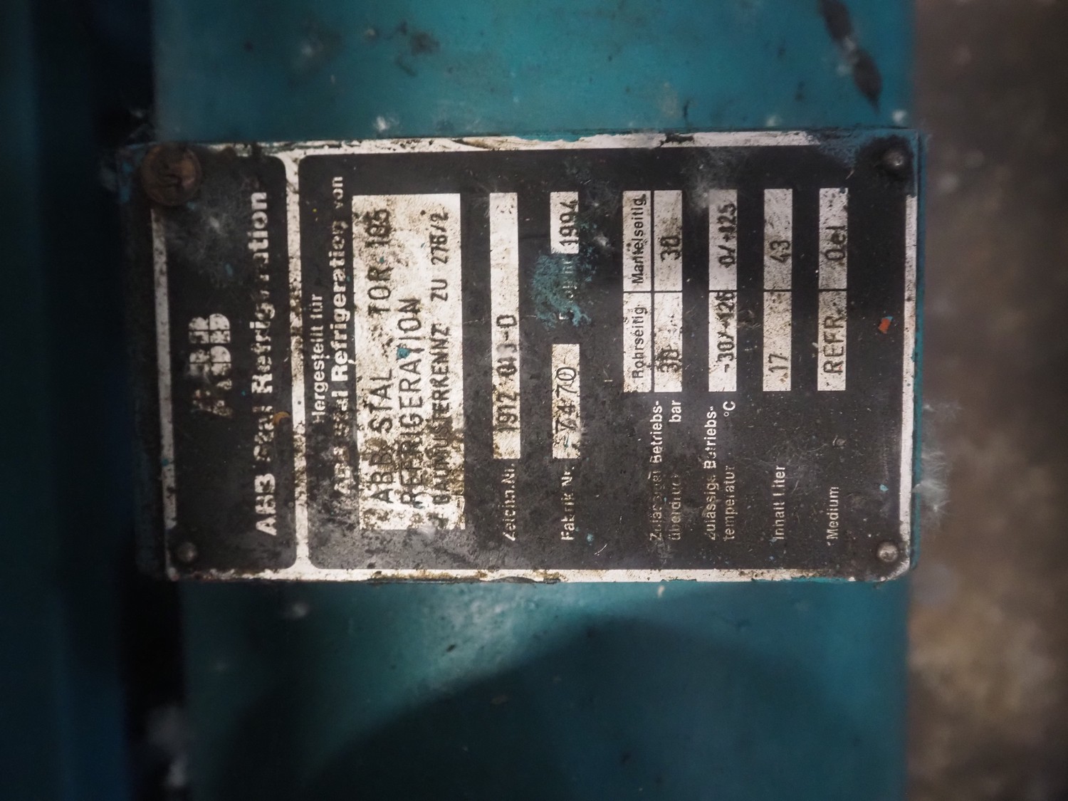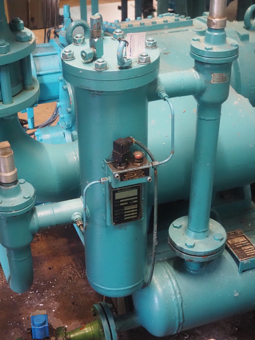 York Refrigeration screw cooling compressor, type: SAB 83, number: 118957, year of construction: 2001, volume: 1331 m³ per hour, refrigerant: R717 / NH3, nominal speed: 2950 RPM, dimensions: 3150 mm x 1300 mm x 1600 mm. Including pressure vessel, volume: 675 liter, dimensions vessel: 800 mm x 800 mm x 2150 mm.