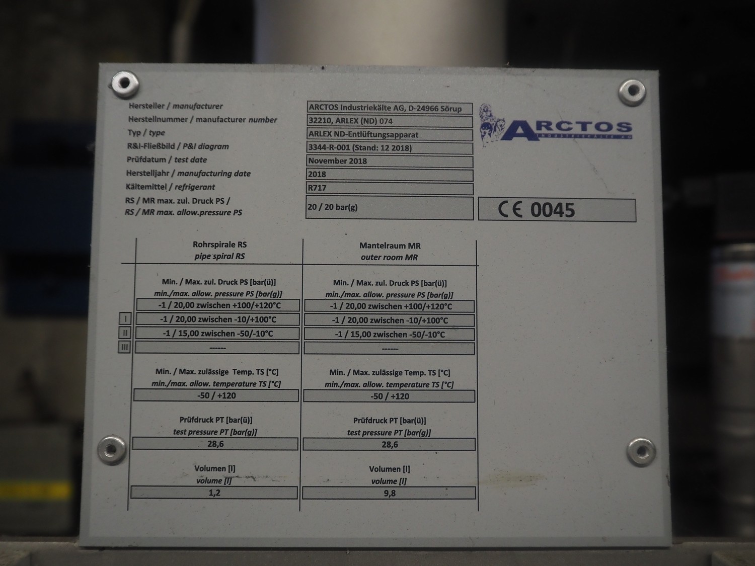 Arctos de-aerating device, type: ARLEX ND, manufacturer number: 32210, ARLEX (ND) 074, year of construction: 2018, refrigerant: R717, dimensions: 570 mm x 400 mm x 1100 mm.