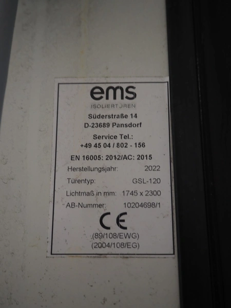 EMS refrigerated sliding door, type: GSL-120, number: 10204698/1, year of construction: 2022, thickness door: 220 mm, dimensions door: 1745 mm x 2300 mm, length rails: 3900 mm.