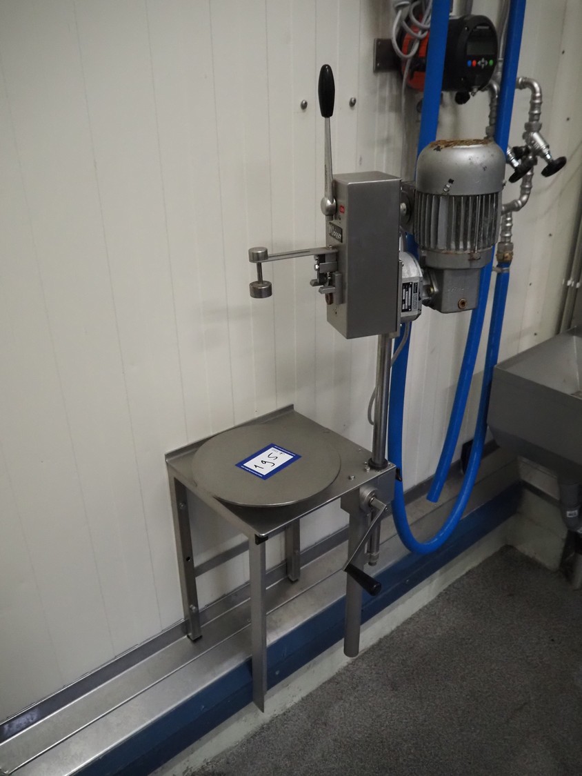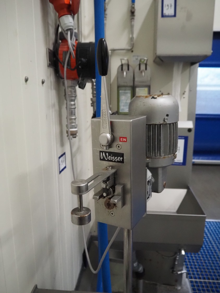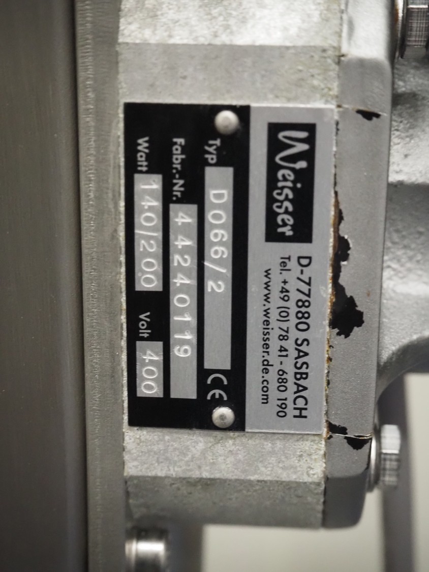 Weisser can opener, type: D066/2, fabrication number: 44240119, 400 V, 140/200 W, dimensions: 400 mm x 400 mm x 1350 mm.