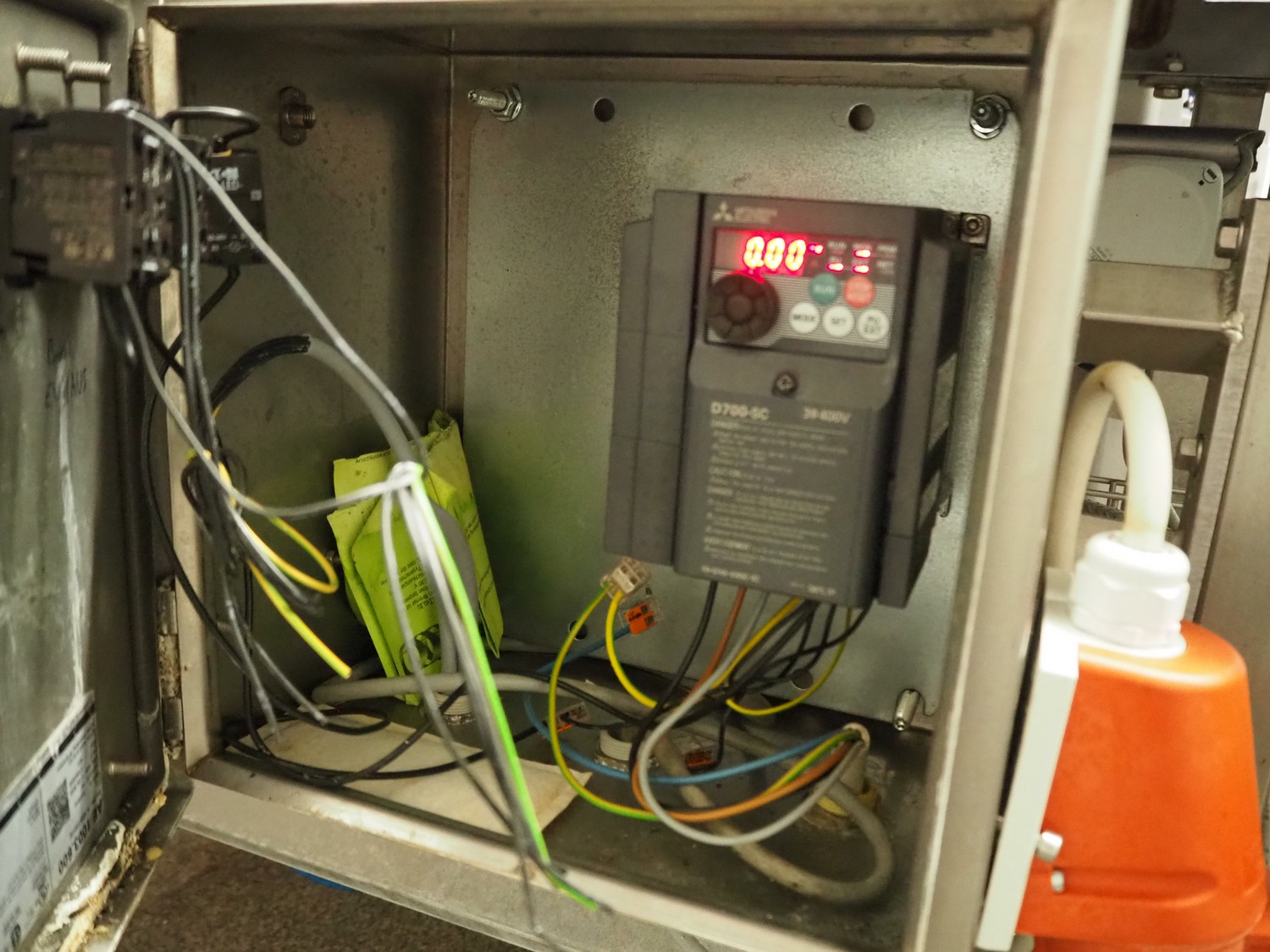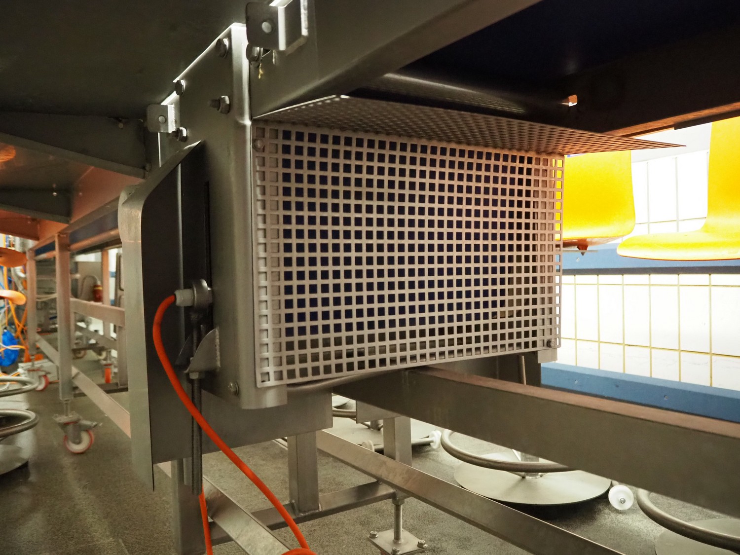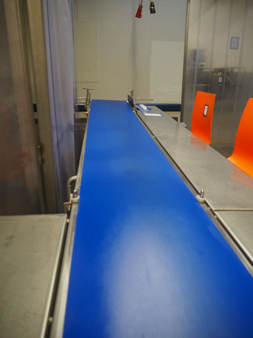 Sorting table, s/s frame, plastic belt, belt width: 400 mm, total dimensions: 9500 mm x 1050 mm x 900 mm.