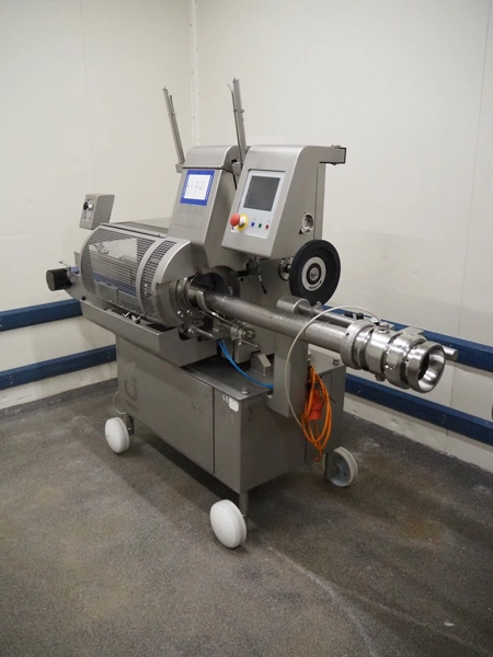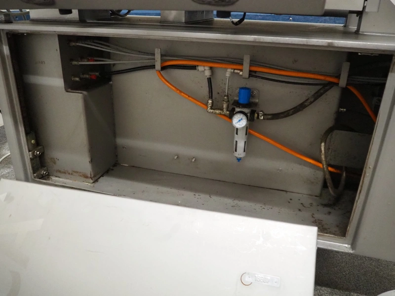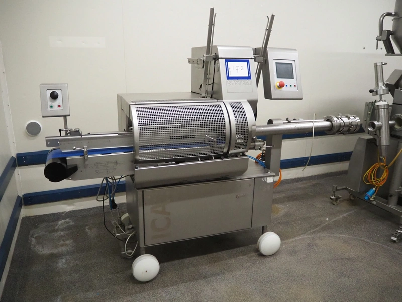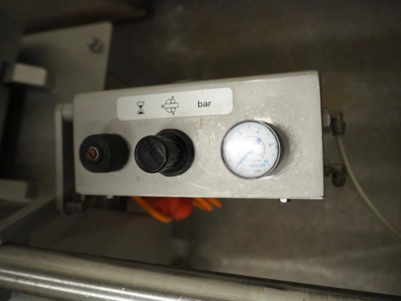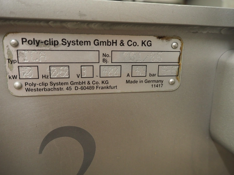 Poly-Clip System GmbH mobile double clipper, type: ICA, number: 701, year of construction: 2006, 400 V, 3 Ph, 50/60 Hz, 4.3 A, 4.0 kW, plastic outfeed belt, belt width: 180 mm, total dimensions: 2650 mm x 1000 mm x 1920 mm.