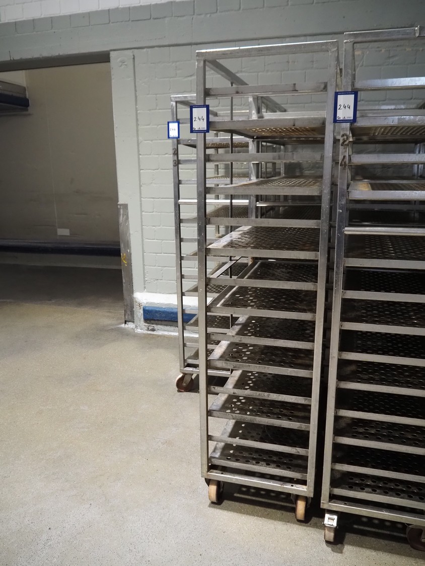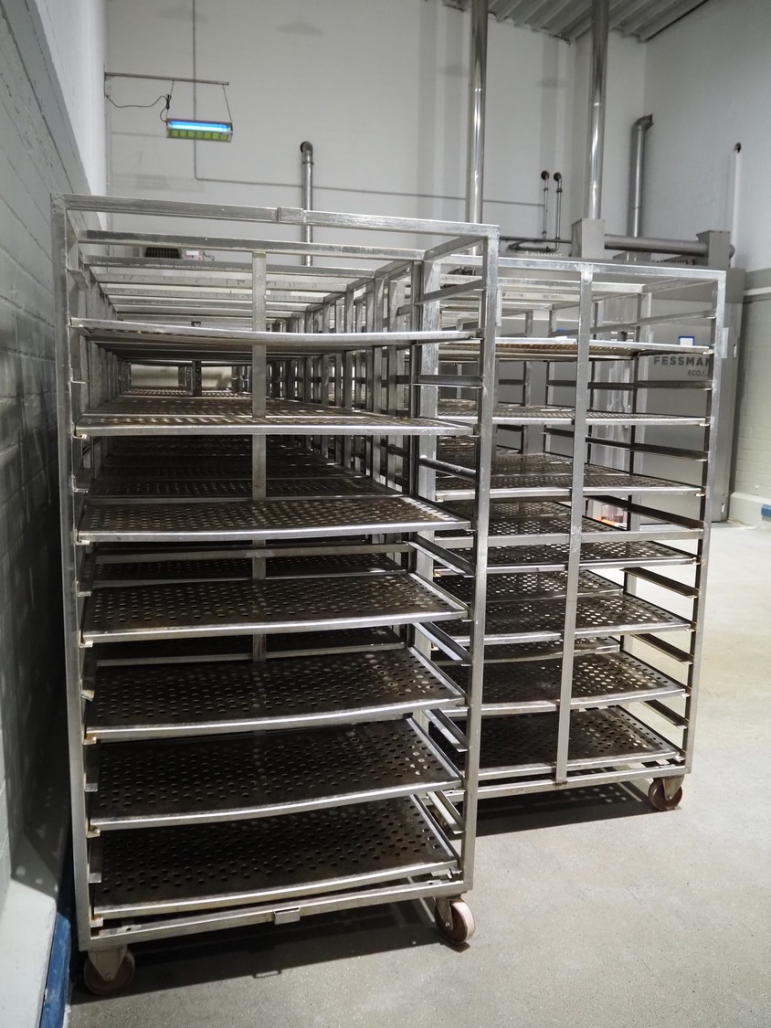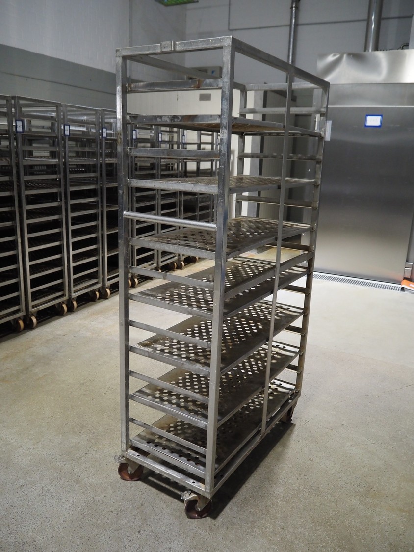 5 s/s cooking trolleys used for cabbage, 14 floors each, dimensions: (5x) 1040 mm x 500 mm x 1900 mm.
