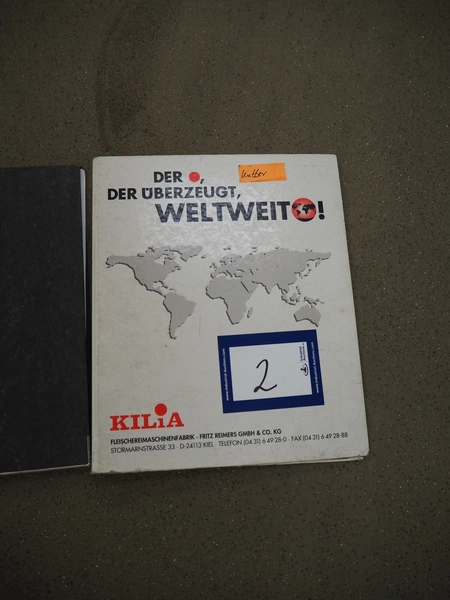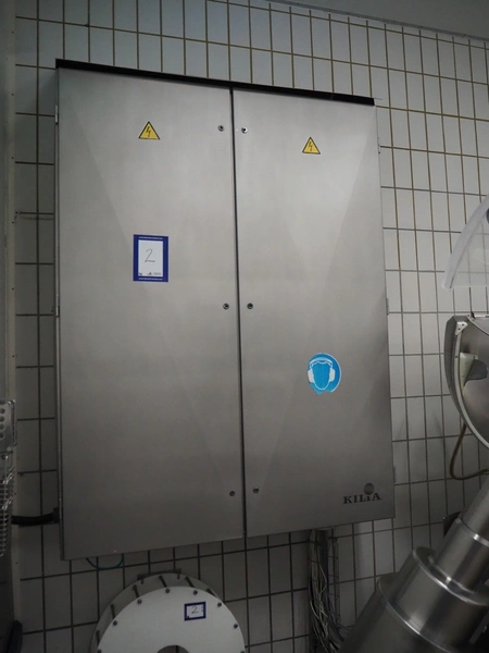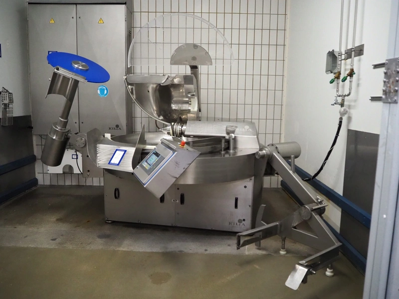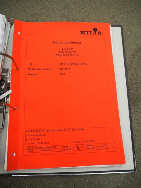 Kilia cutter with lifter for 200 liter meat bins and ejector, type: 325 L K 4000 Express AC, machine number: 89814074, year of construction: 1998, 400 V, 50 Hz, 250 A, 97 kW, machine weight: ca 5200 kg, volume bowl: 325 liter, total dimensions: 2700 mm x 3600 mm x 2600 mm, s/s switch cabinet, dimensions: 1480 mm x 500 mm x 2000 mm, pallet with additional knives.