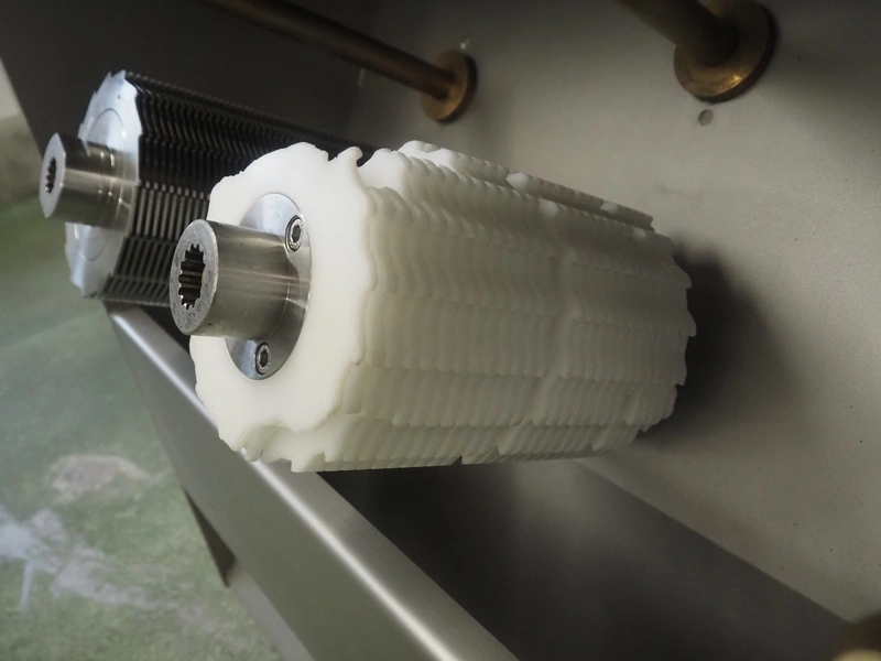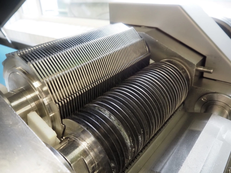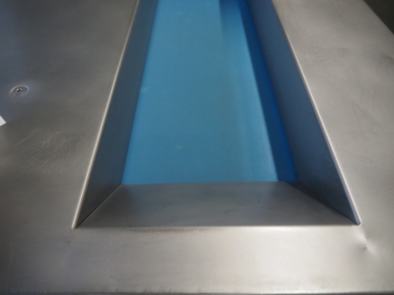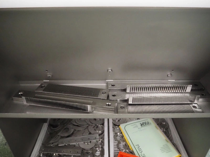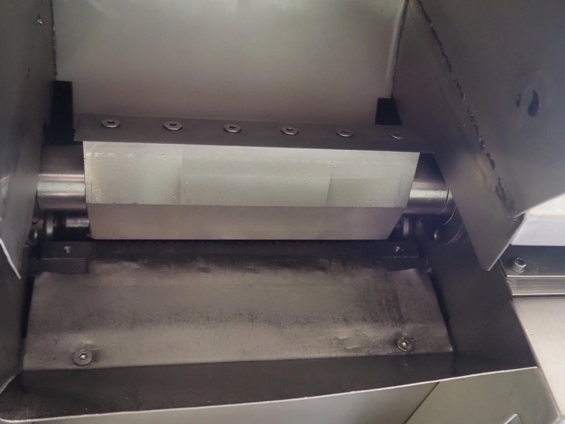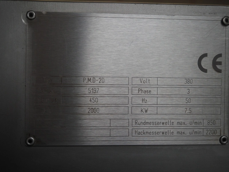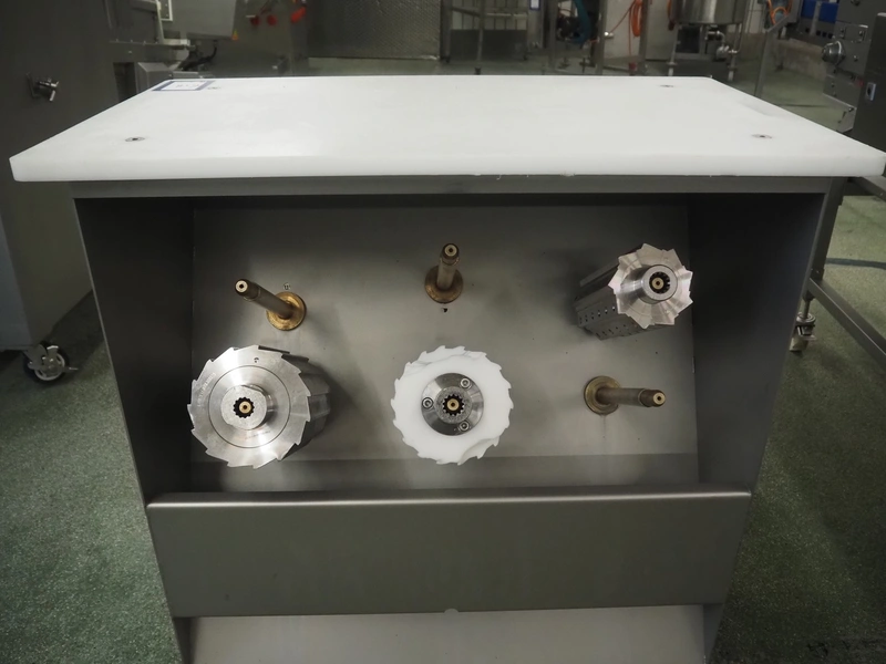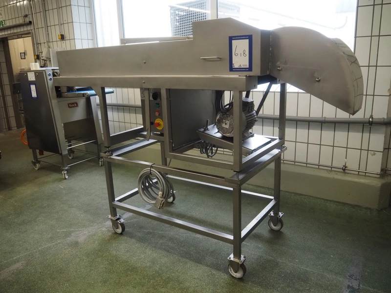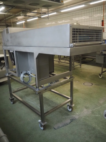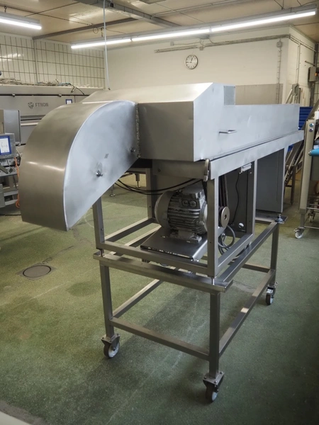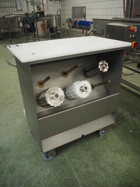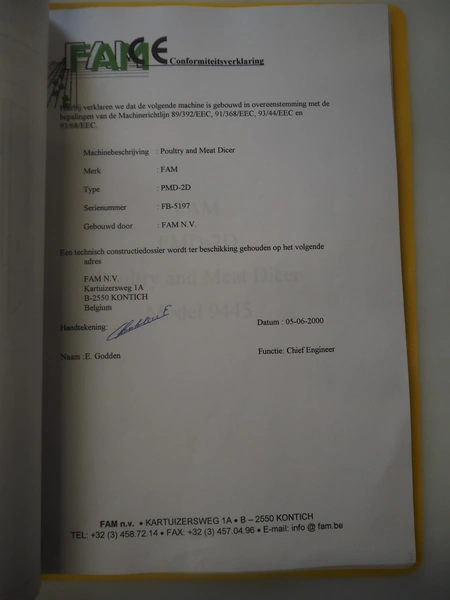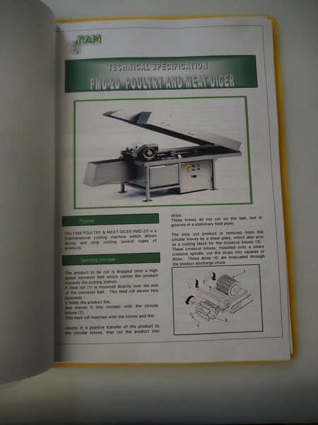 FAM mobile dicer, type: P.M.D-2D, number: 5197, year of construction: 2000, 380 V, 3 Ph, 50 Hz, 7.5 kW, weight: 450 kg, plastic belt, belt width: 270 mm, 29 knives, distance between knives: 7 mm, total dimensions: 2400 mm x 850 mm x 1680 mm. Including s/s tool trolley, dimensions trolley: 900 mm x 550 mm x 970 mm.