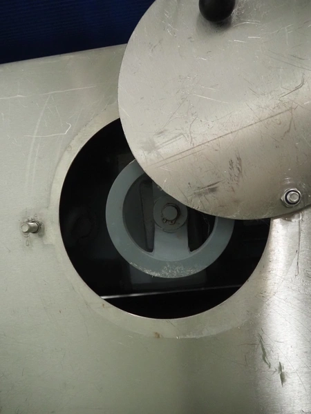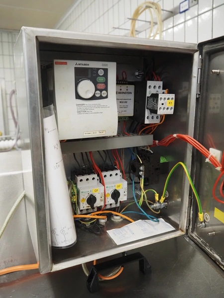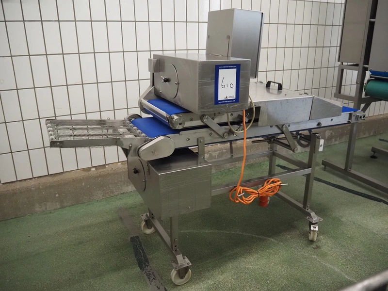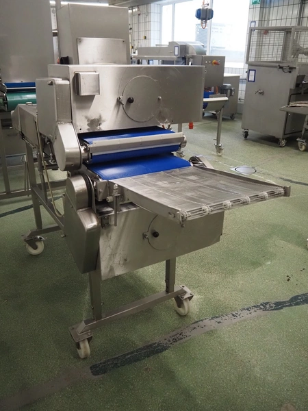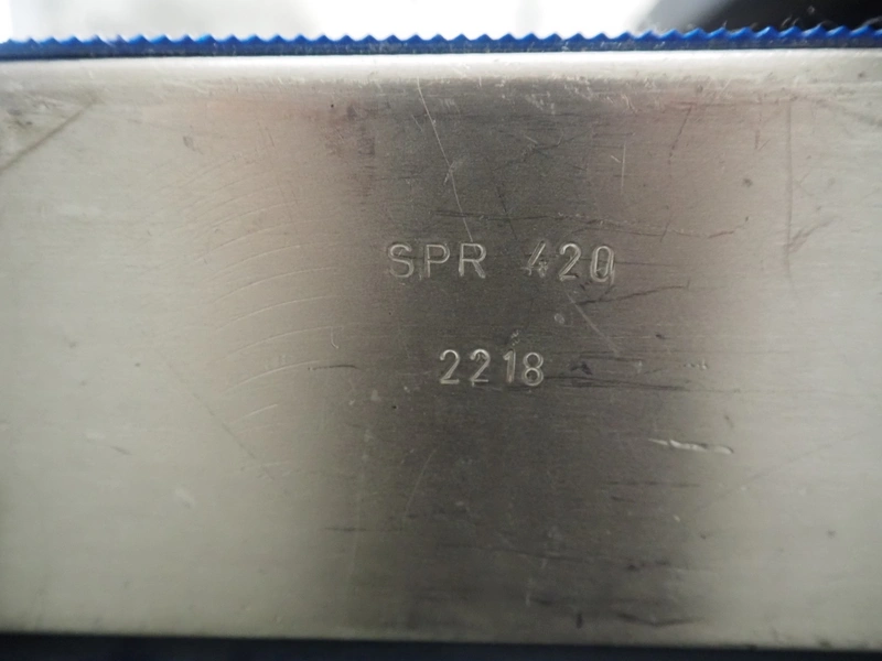 Glass mobile flattener, model: SPR 420, number: 2218, plastic belts, belt width: (2x) 420 mm, s/s mesh outfeed belt, belt width: 400 mm, total dimensions: 2200 mm x 710 mm x 1600 mm.