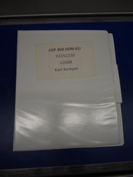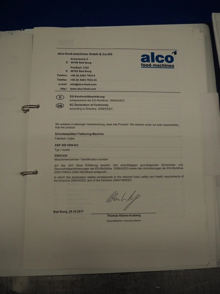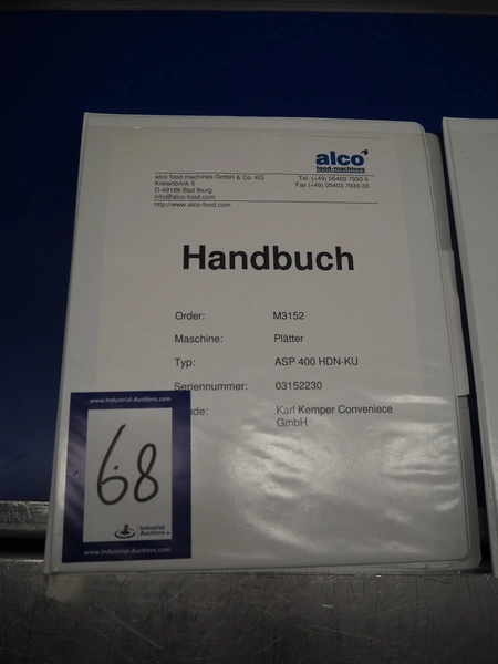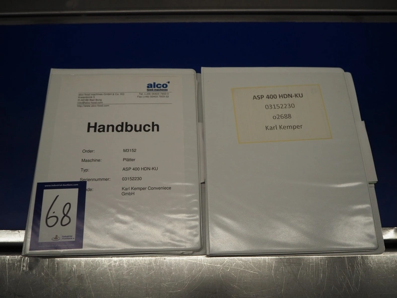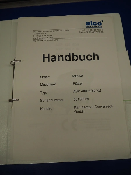 Alco Food Machines GmbH mobile flattener, type: ASP 400 HDN, serial number: 03152230, year of construction: 2019, 400 V, 50 Hz, 16 A, 4 kW, weight: 570 kg, s/s mesh belt, belt width: 400 mm, plastic belt, belt width: 410 mm, total dimensions: 2200 mm x 800 mm x 1450 mm.