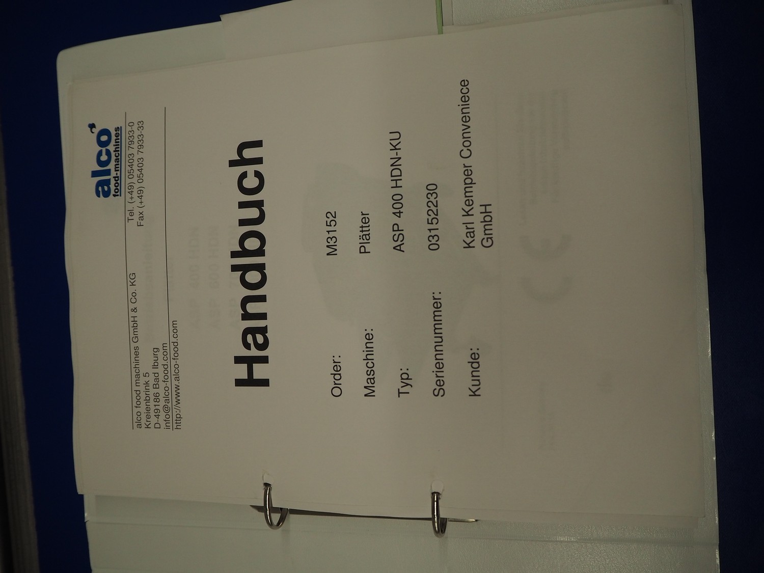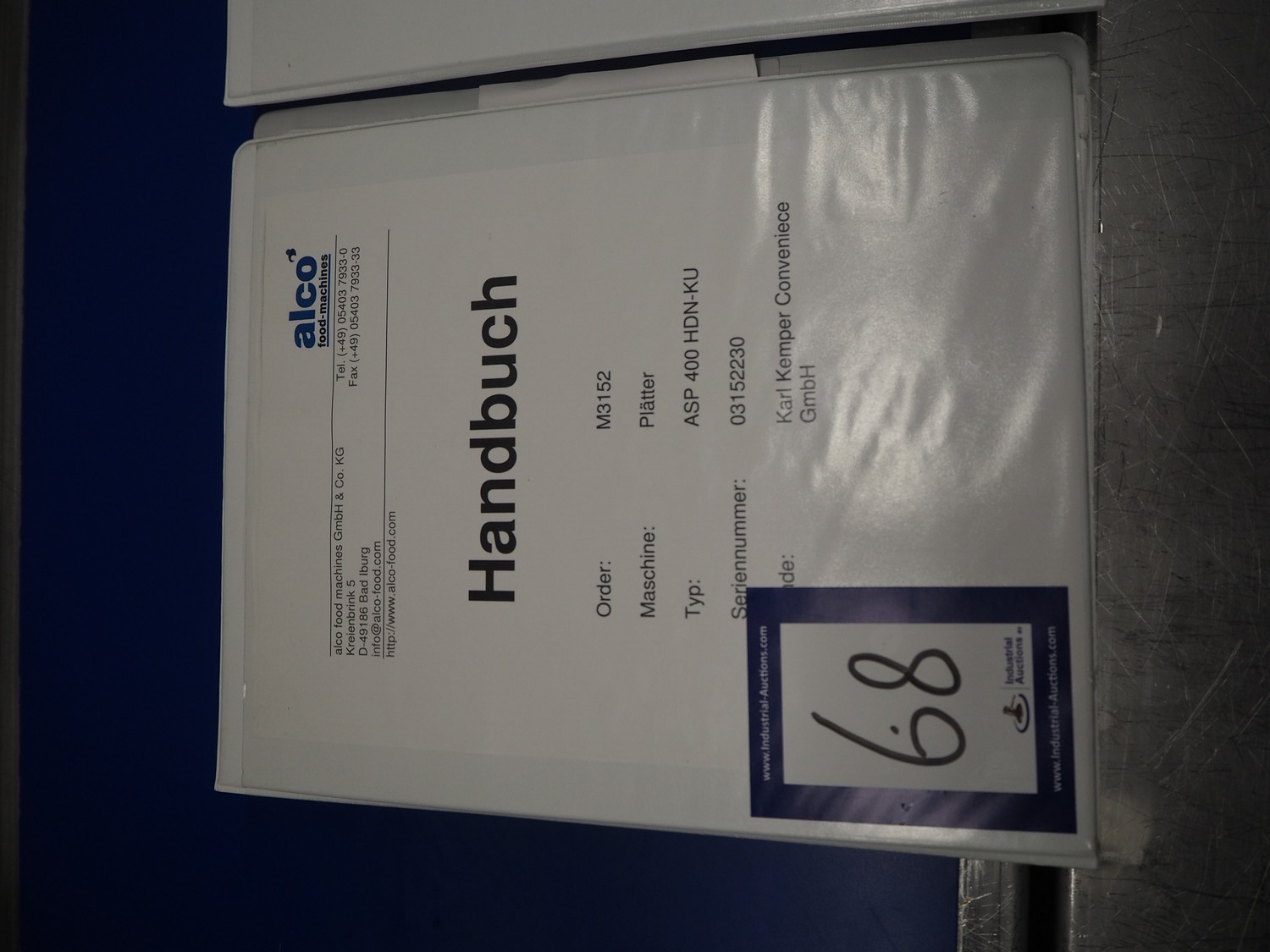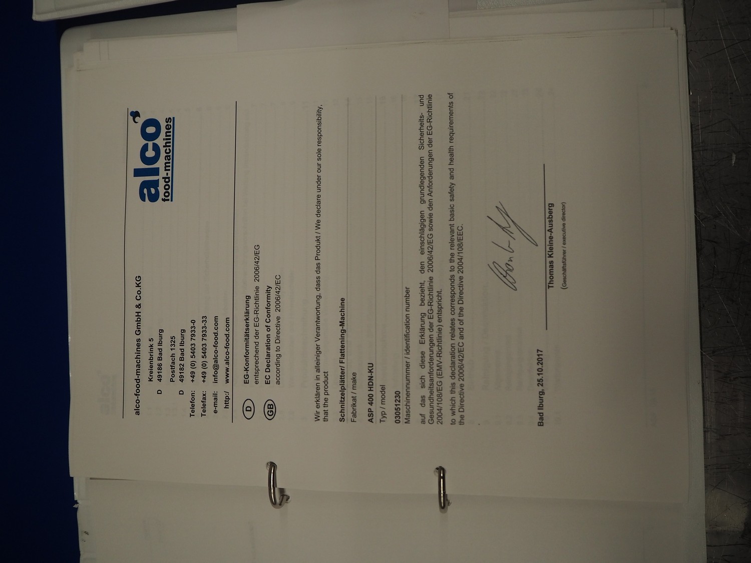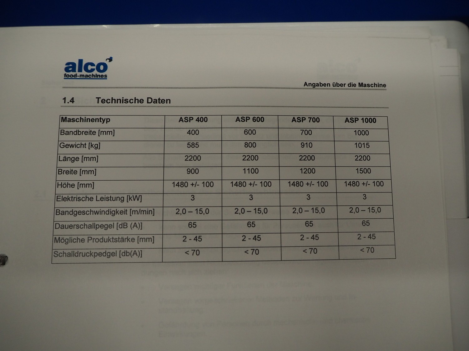 Alco Food Machines GmbH mobile flattener, type: ASP 400 HDN, serial number: 03152230, year of construction: 2019, 400 V, 50 Hz, 16 A, 4 kW, weight: 570 kg, s/s mesh belt, belt width: 400 mm, plastic belt, belt width: 410 mm, total dimensions: 2200 mm x 800 mm x 1450 mm.