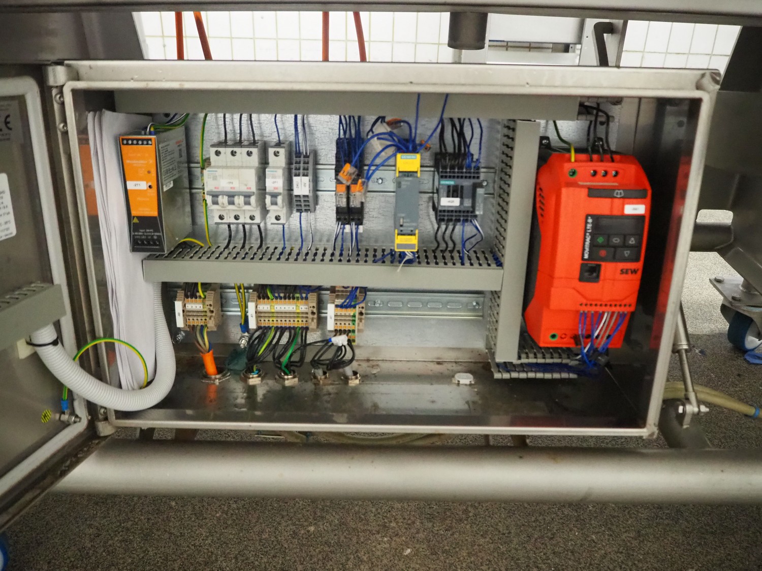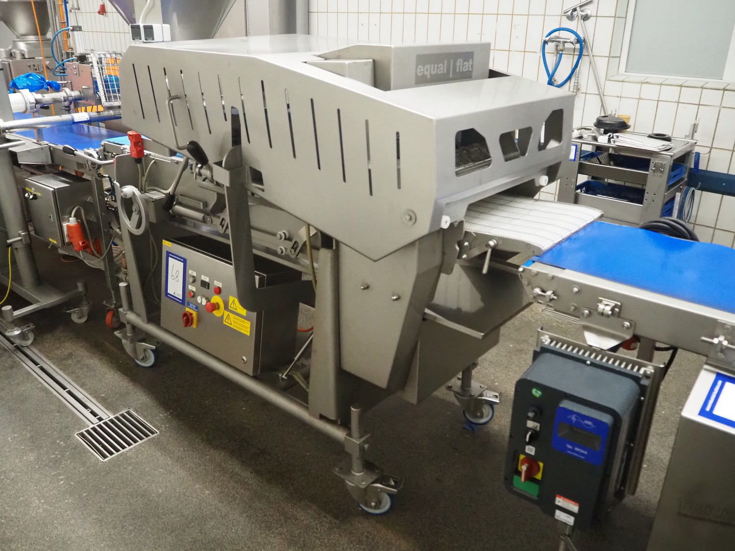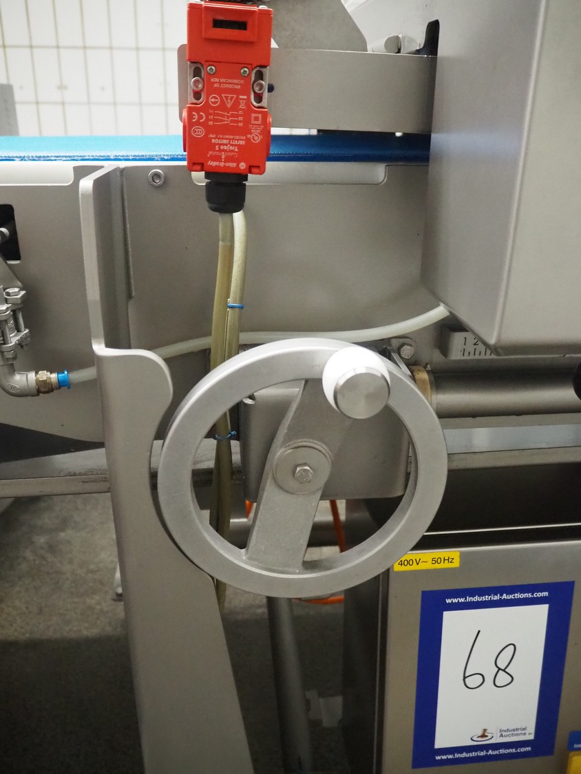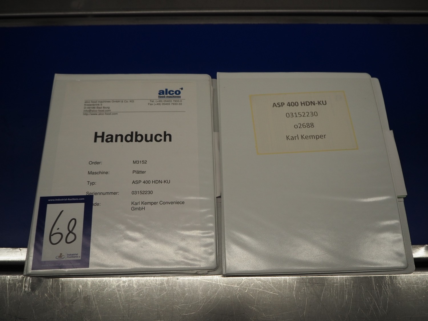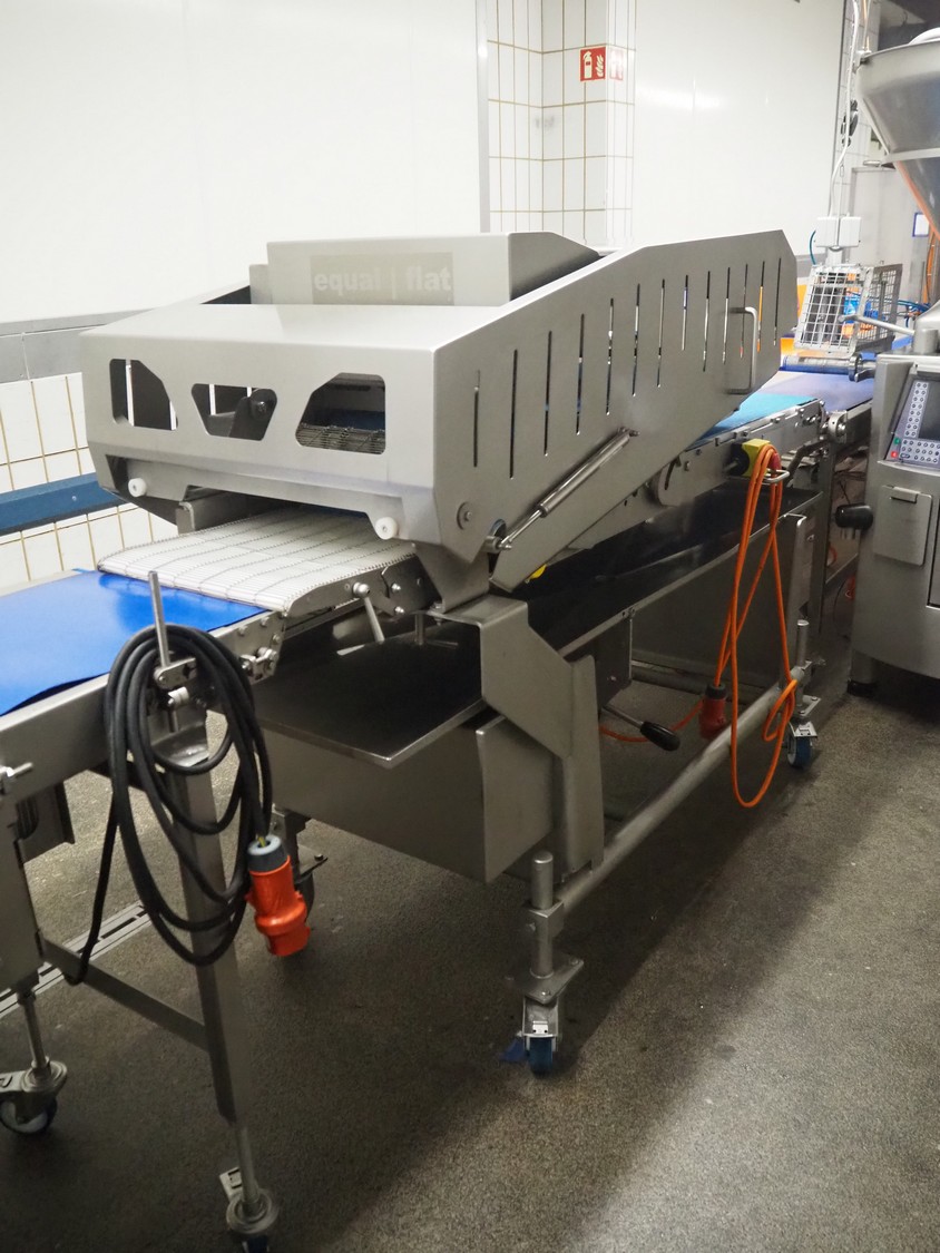 Alco Food Machines GmbH mobile flattener, type: ASP 400 HDN, serial number: 03152230, year of construction: 2019, 400 V, 50 Hz, 16 A, 4 kW, weight: 570 kg, s/s mesh belt, belt width: 400 mm, plastic belt, belt width: 410 mm, total dimensions: 2200 mm x 800 mm x 1450 mm.
