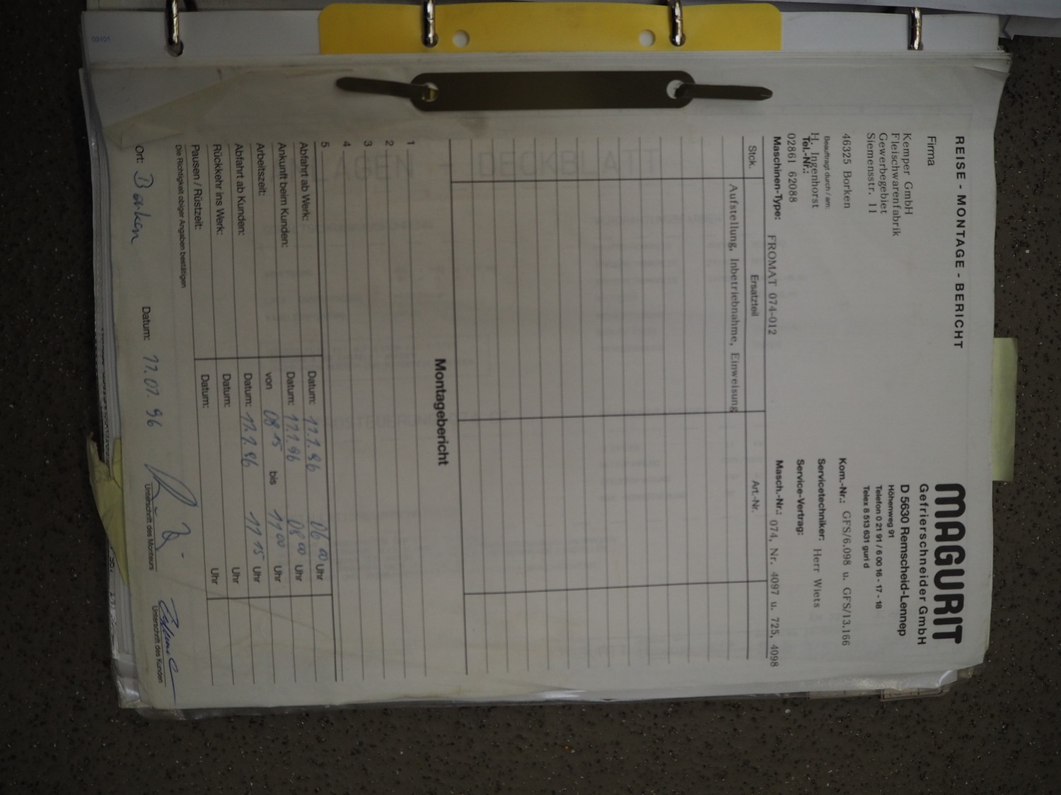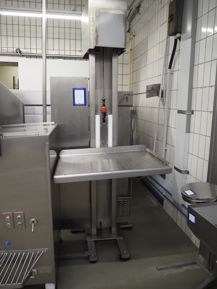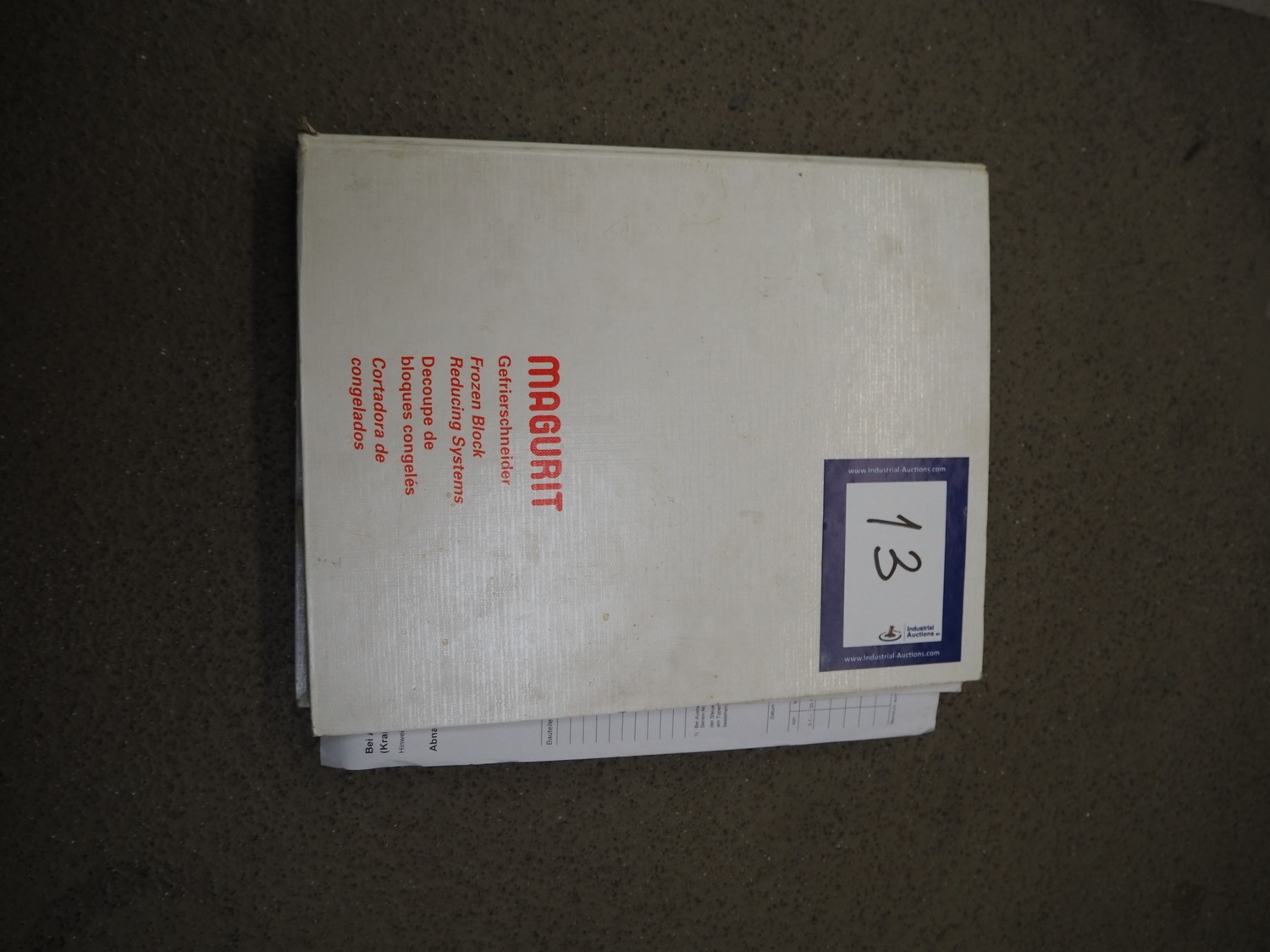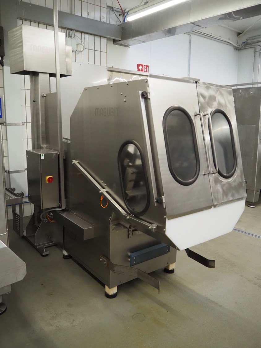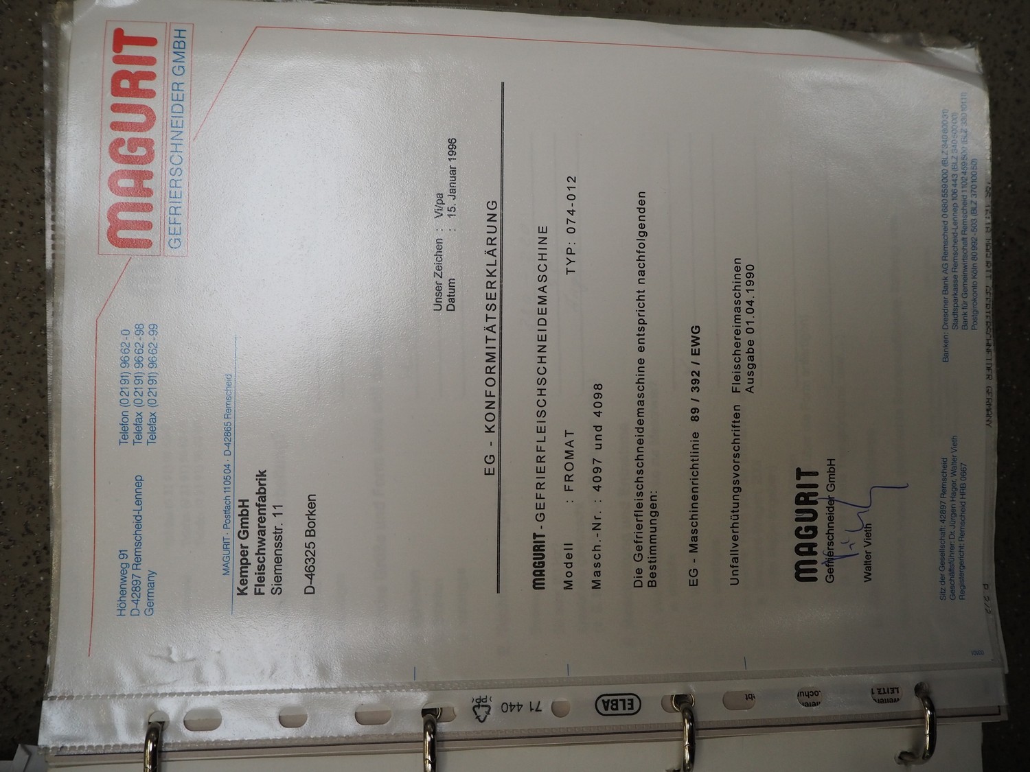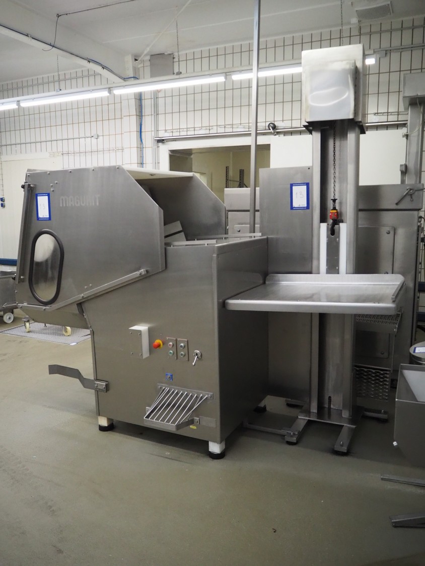 Magurit GmbH frozen block cutter with lifting platform, model: FROMAT, type: 074-012, machine number: 4097, year of construction: 1995, 380 V, 10 kW, maximum block size: 670 mm x 600 mm x 550 mm, working width: 730 mm, total dimensions frozen block cutter: 1800 mm x 1050 mm x 1900 mm, total dimensions lifting platform: 1200 mm x 1100 mm x 2610 mm.