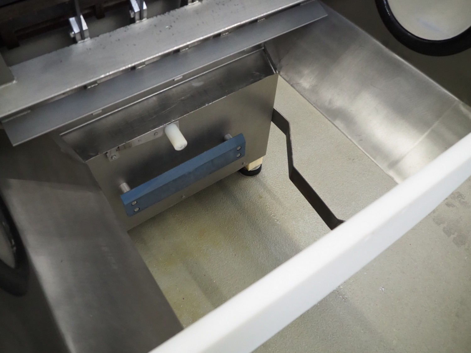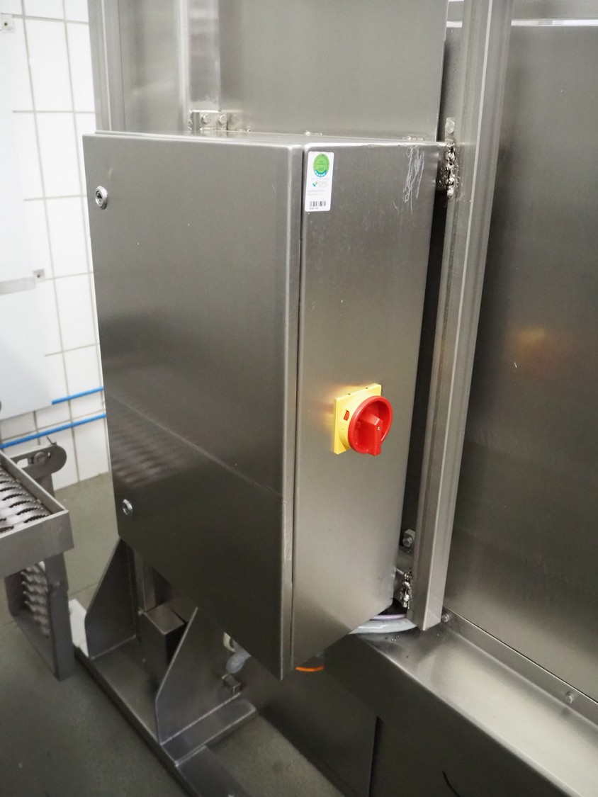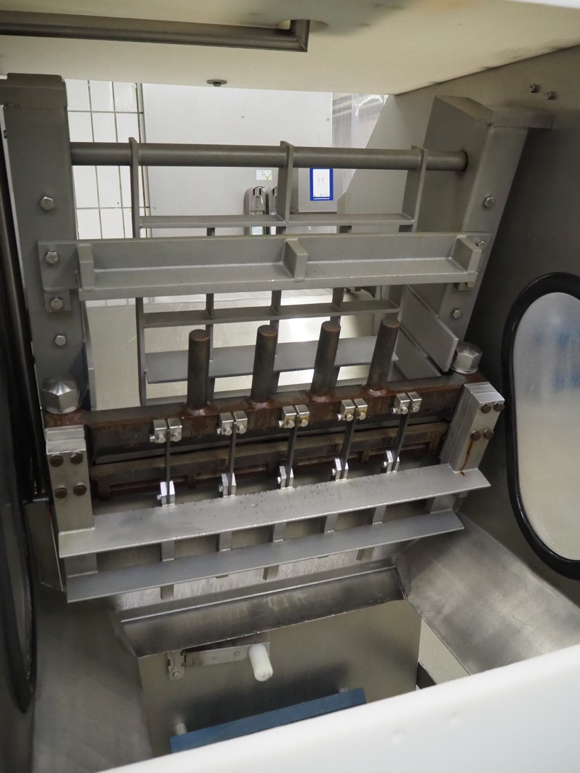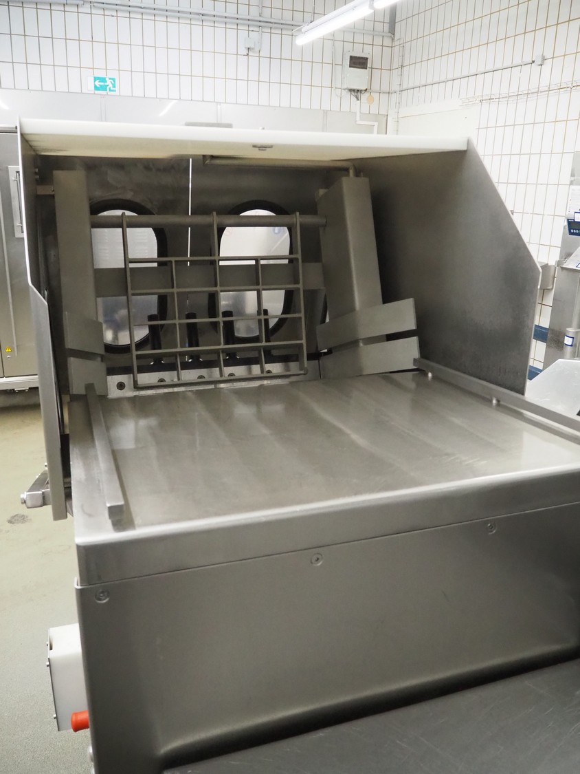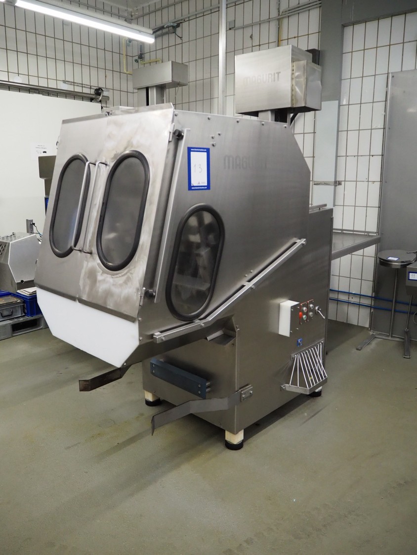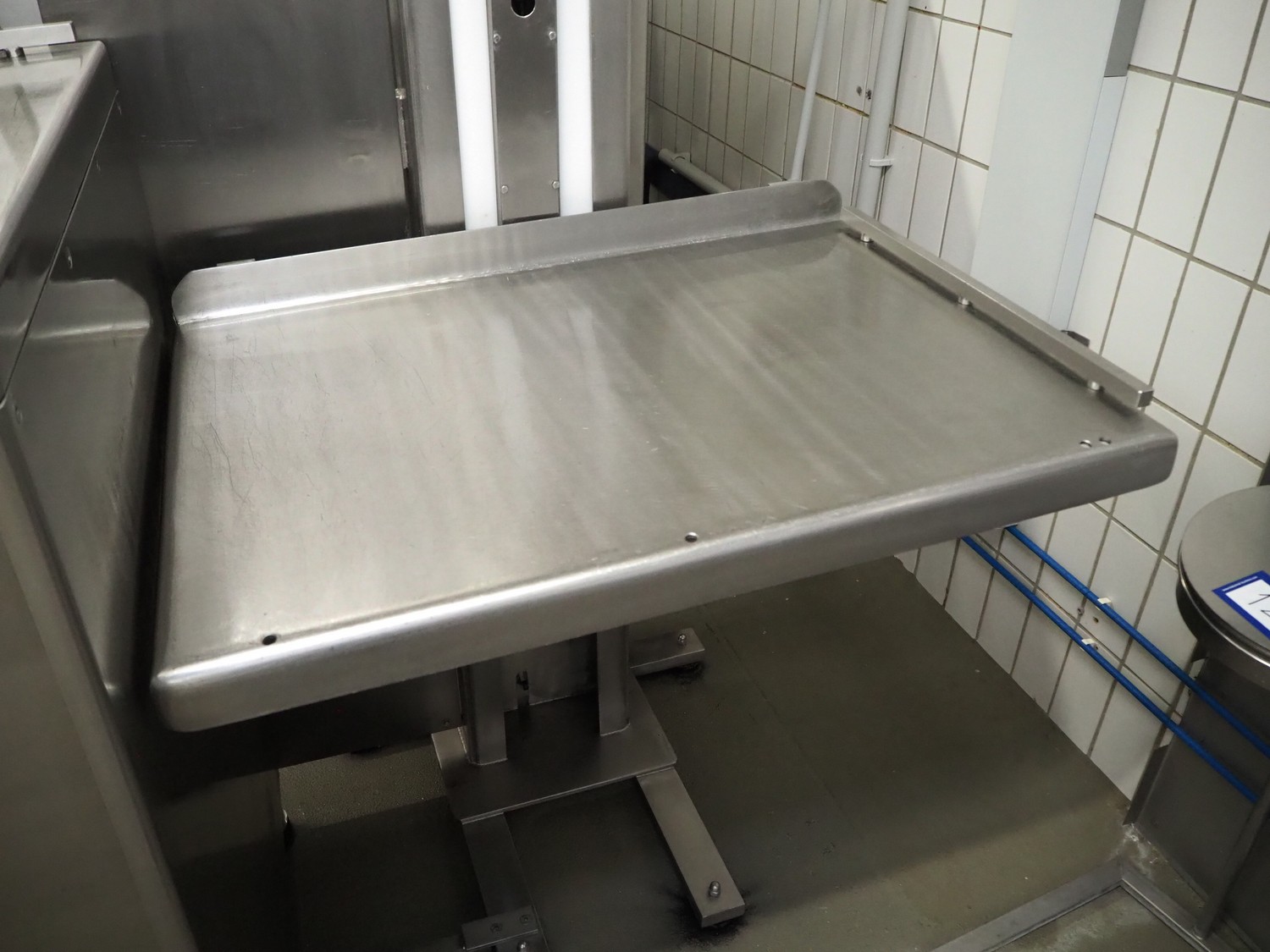 Magurit GmbH frozen block cutter with lifting platform, model: FROMAT, type: 074-012, machine number: 4097, year of construction: 1995, 380 V, 10 kW, maximum block size: 670 mm x 600 mm x 550 mm, working width: 730 mm, total dimensions frozen block cutter: 1800 mm x 1050 mm x 1900 mm, total dimensions lifting platform: 1200 mm x 1100 mm x 2610 mm.