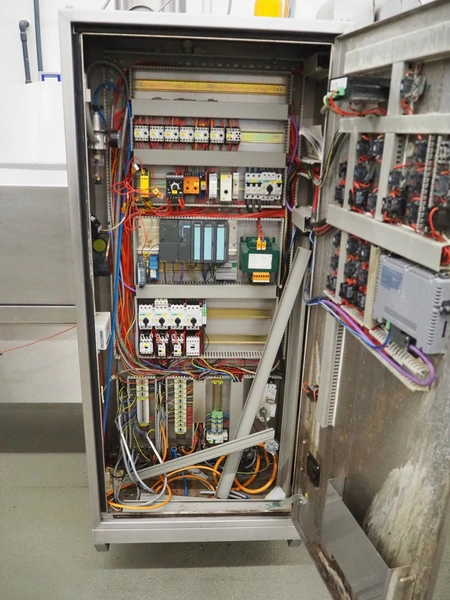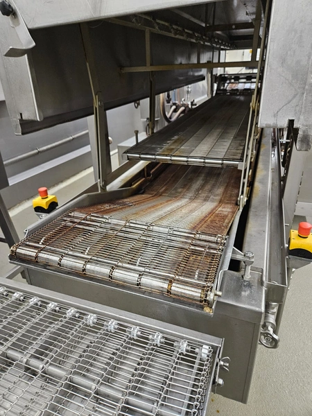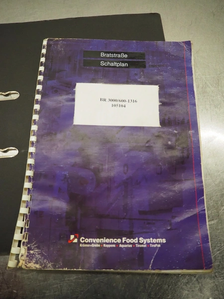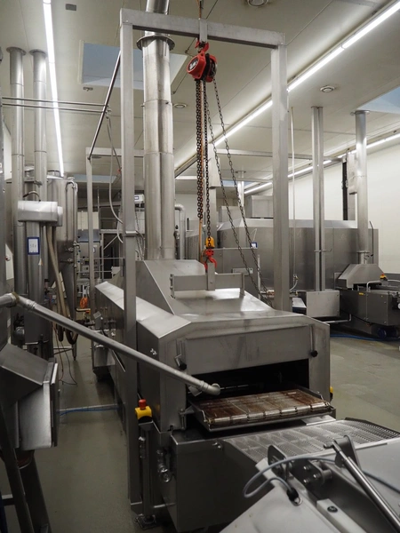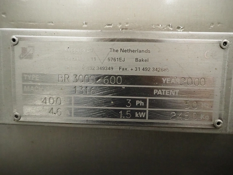 Koppens Machinefabriek B.V. fryer, type: BR 3000 / 600, machine number: 1316, year of construction: 2000, 400 V, 3 Ph, 50 Hz, 4.6 A, 1.5 kW, weight: 2450 kg, s/s mesh belt, belt width: 600 mm, frying length: 3000 mm, heating: thermic oil, manual hoists, total dimensions: 5400 mm x 1600 mm x 3200 mm, valve station, dimensions: 2200 mm x 600 mm x 2600 mm, thermic oil station with thermic oil pump, dimensions: 1300 mm x 800 mm x 2700 mm and s/s cabinet with 2 Ansul fire extinguishers, dimensions cabinet: 600 mm x 210 mm x 750 mm.