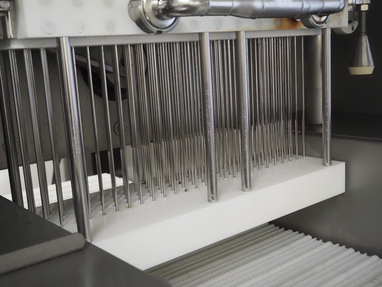 Günther Maschinenbau GmbH injector, type: PI 100, machine number: 23492, 380 V, 32 A, 100 needles, plastic mesh belt, belt width: 580 mm, clearance: 600 mm x 210 mm, total dimensions: 2450 mm x 1350 mm x 2200 mm. Including Günther Maschinenbau GmbH filter tub, type: GRF 400R, machine number: 23 492, 380 V, dimensions filter tub: 2100 mm x 700 mm x 770 mm and s/s trolley with parts, dimensions trolley: 1040 mm x 550 mm x 1930 mm.