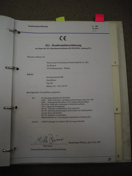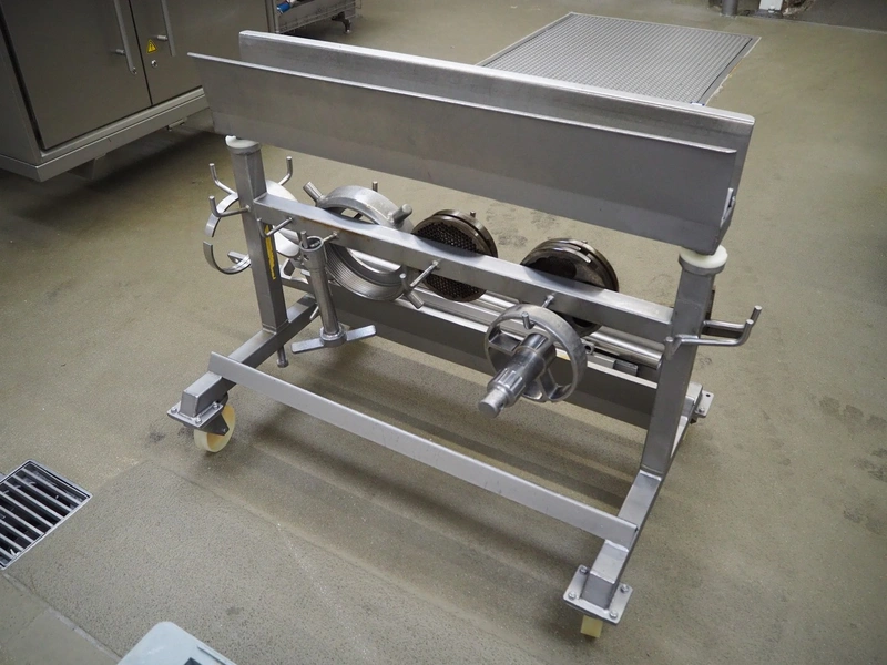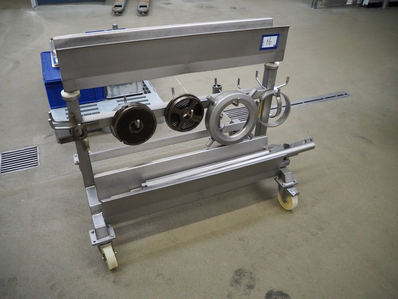 Tetra Laval Convenience Food GmbH grinder with lifter for meat bins, type lifter: Besch. machine number: 393/162, year of construction: 1997, lifting height: 1950 mm, total dimensions lifter: 900 mm x 900 mm x 2900 mm, type grinder: AM200, machine number: 361/125, year of construction: 1997, 400 V, 3 Ph, 50 Hz, 130 A, plate diameter: 200 mm, total dimensions grinder: 2550 mm x 1150 mm x 1800 mm, s/s tool trolley, dimensions: 1200 mm x 700 mm x 1200 mm, pallet with additional knives and plates.