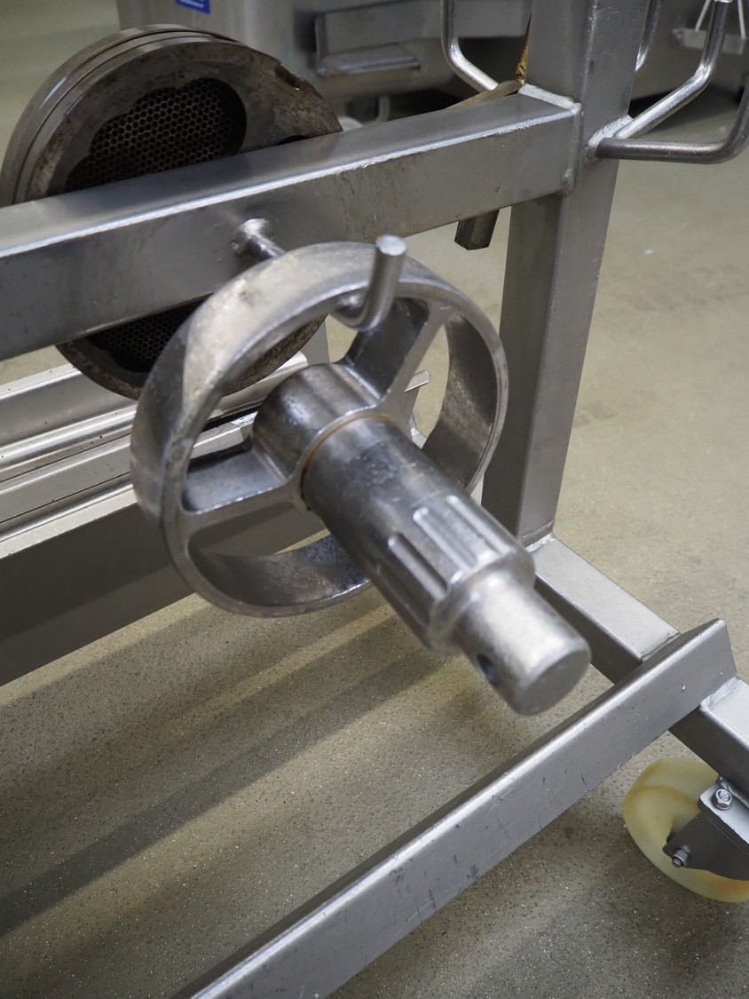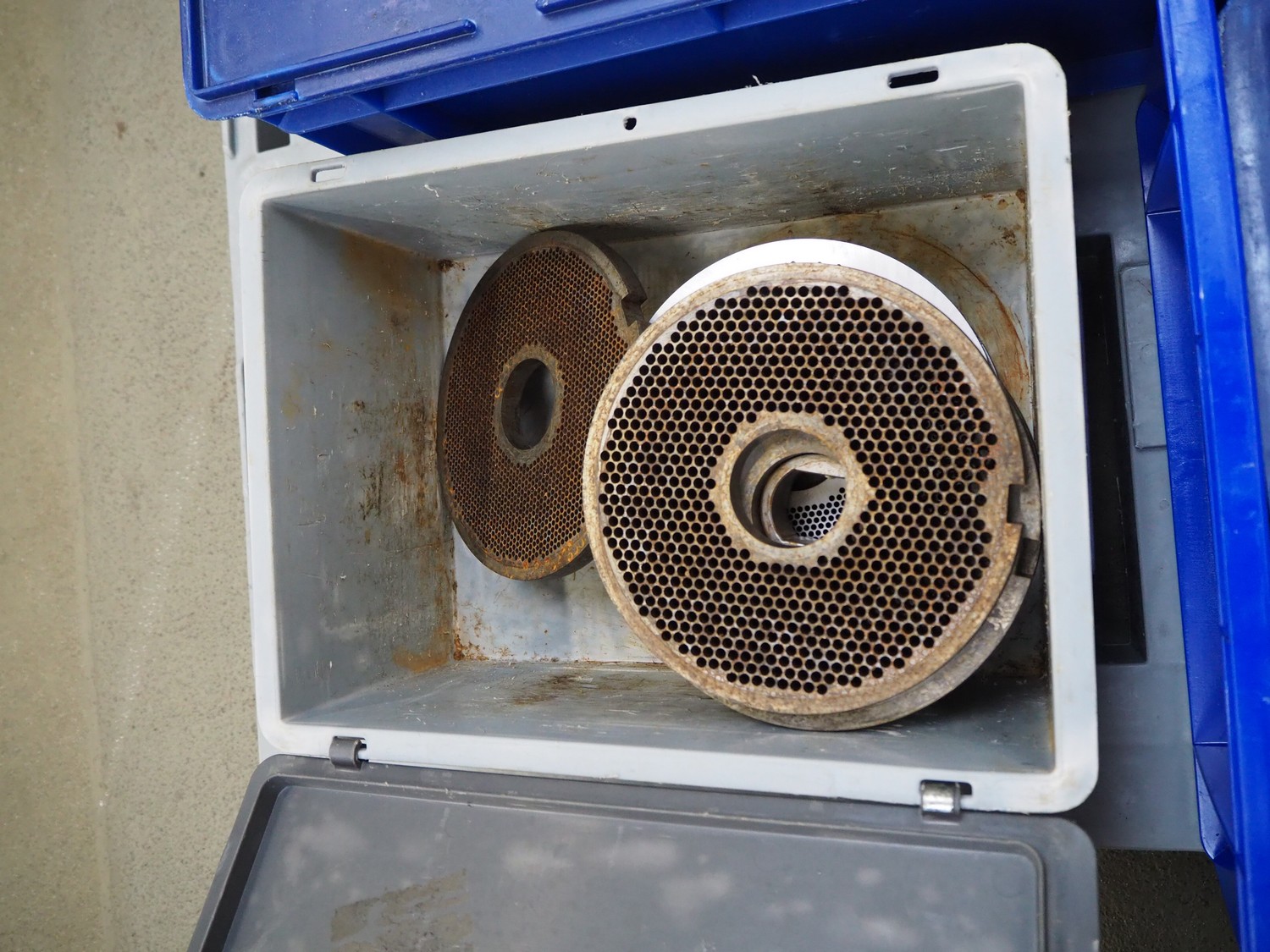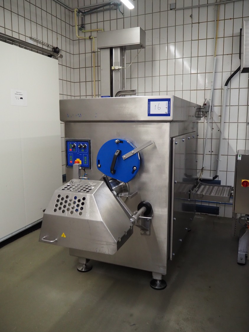 Tetra Laval Convenience Food GmbH grinder with lifter for meat bins, type lifter: Besch. machine number: 393/162, year of construction: 1997, lifting height: 1950 mm, total dimensions lifter: 900 mm x 900 mm x 2900 mm, type grinder: AM200, machine number: 361/125, year of construction: 1997, 400 V, 3 Ph, 50 Hz, 130 A, plate diameter: 200 mm, total dimensions grinder: 2550 mm x 1150 mm x 1800 mm, s/s tool trolley, dimensions: 1200 mm x 700 mm x 1200 mm, pallet with additional knives and plates.