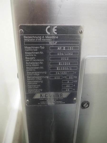 K+G Wetter grinder, type: AW E 130, machine number: 404/1062, year of construction: 2012, 400 V, 3 Ph, 50 Hz, 20 A, 9 kW, plate diameter: 130 mm, total dimensions: 1500 mm x 800 mm x 1300 mm. Including crate with plates and knifes.