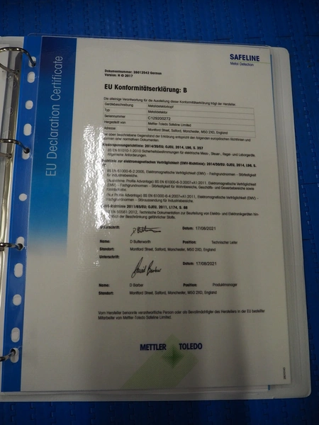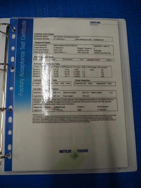 Mettler Toledo GmbH mobile metal detector, type: Metalldetektor, serial number: C129200272, year of construction: 09-2021, plastic belt, belt width: 500 mm, clearance: 550 mm x 170 mm, total dimensions: 1600 mm x 1200 mm x 1430 mm.