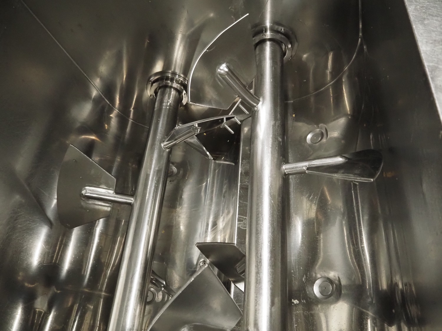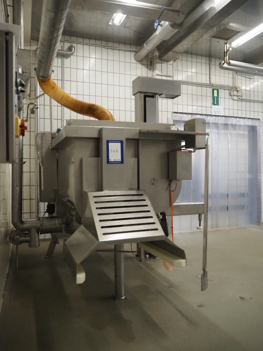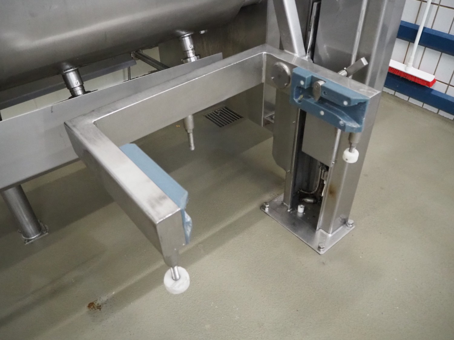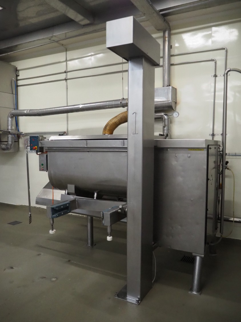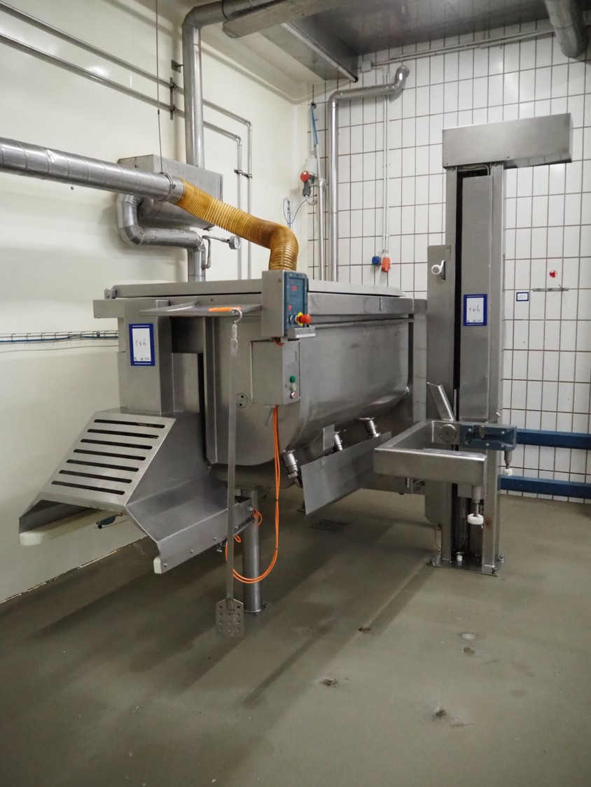 Risco double shaft paddle mixer with lifter for 200 liter meat bins, model: RS 1300, serial number: 1395007, year of construction: 1997, 380 V, 3 Ph, 50 Hz, 15 kW, steam injection, volume: 1300 liter, lifting height: 1900 mm, dimensions lifter: 1200 mm x 650 mm x 2750 mm, dimensions mixer: 3100 mm x 1100 mm x 1800 mm.