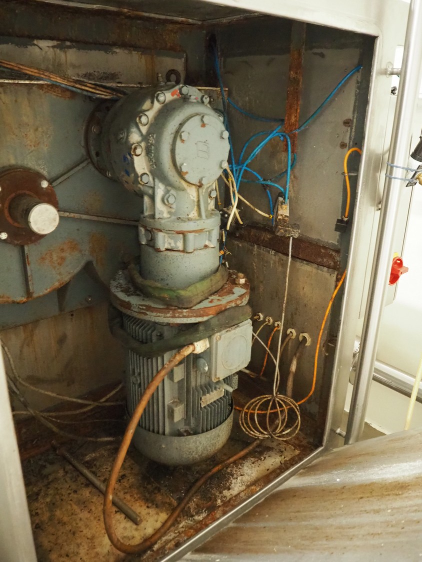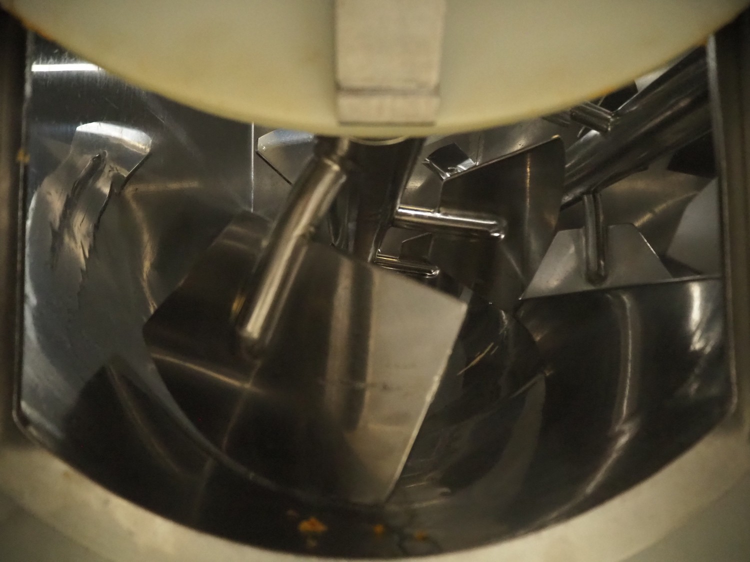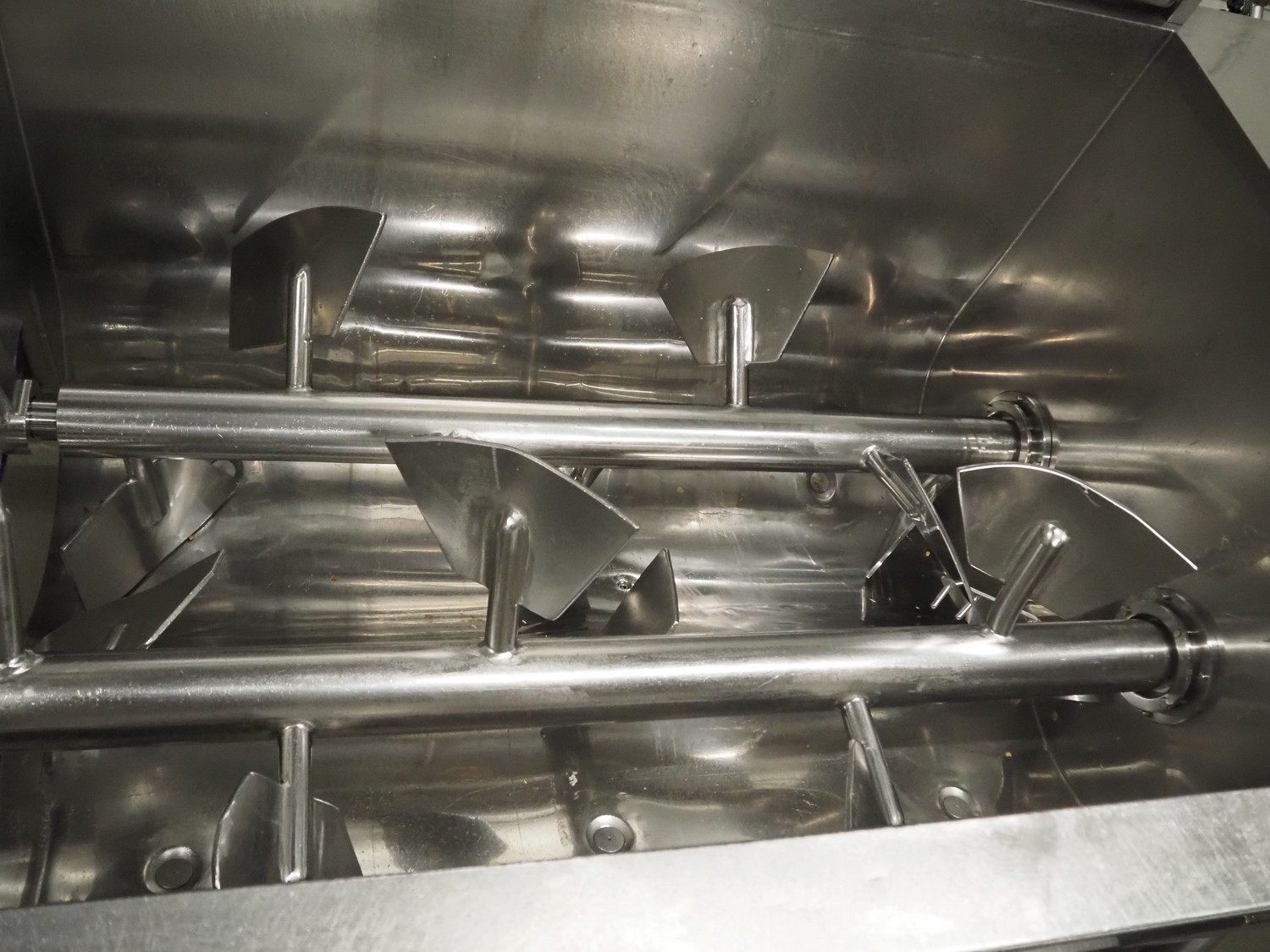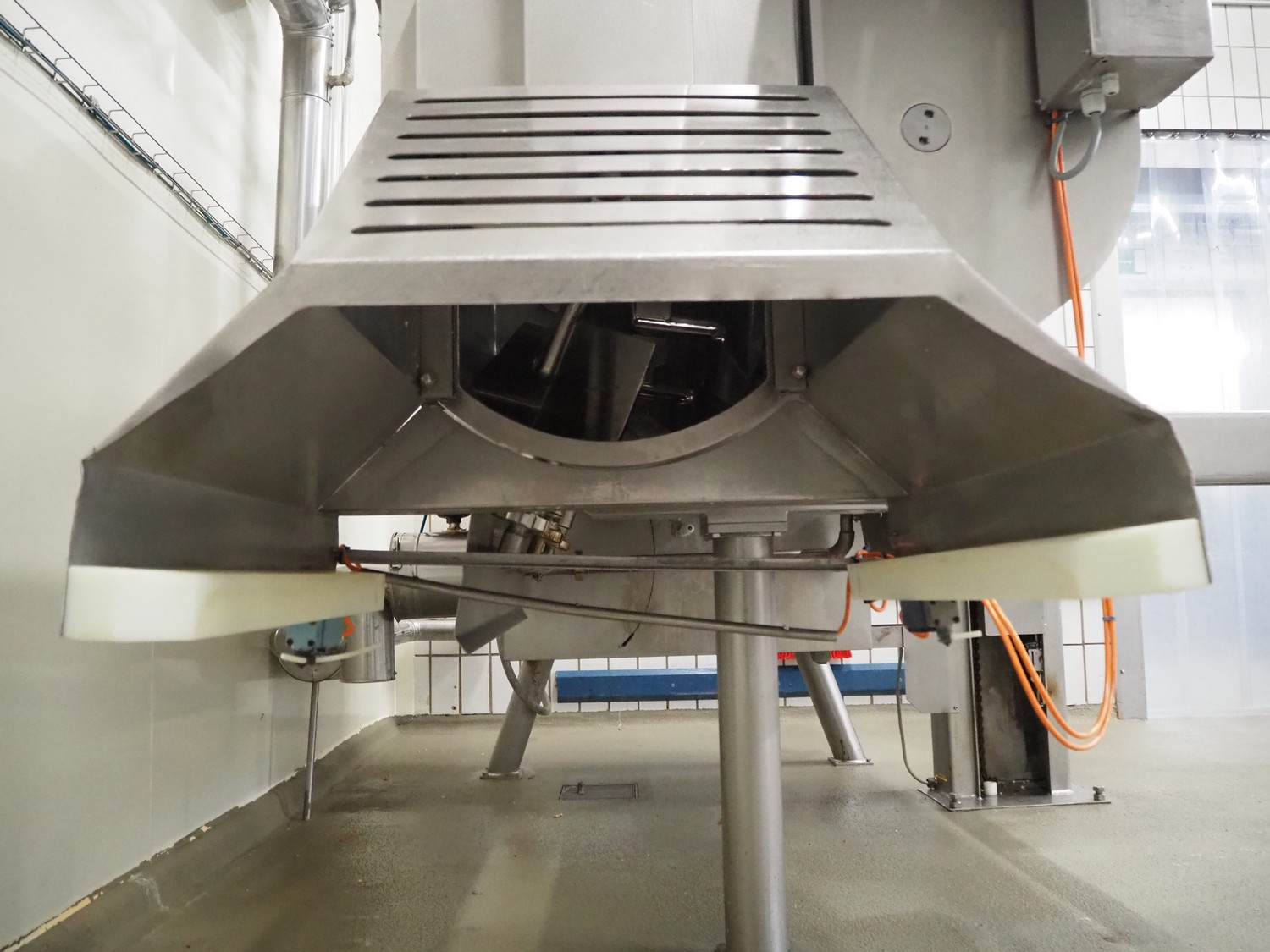 Risco double shaft paddle mixer with lifter for 200 liter meat bins, model: RS 1300, serial number: 1395007, year of construction: 1997, 380 V, 3 Ph, 50 Hz, 15 kW, steam injection, volume: 1300 liter, lifting height: 1900 mm, dimensions lifter: 1200 mm x 650 mm x 2750 mm, dimensions mixer: 3100 mm x 1100 mm x 1800 mm.