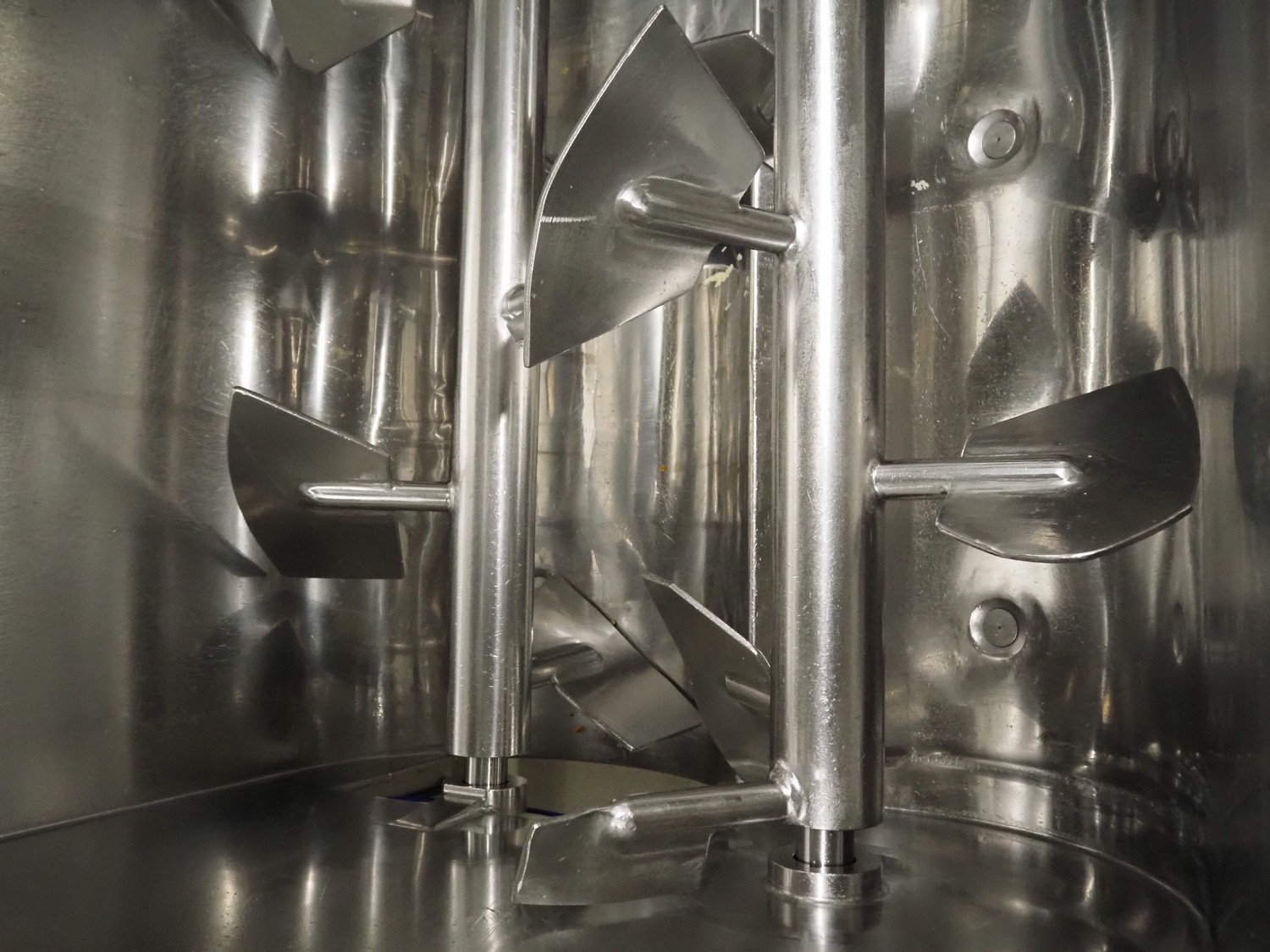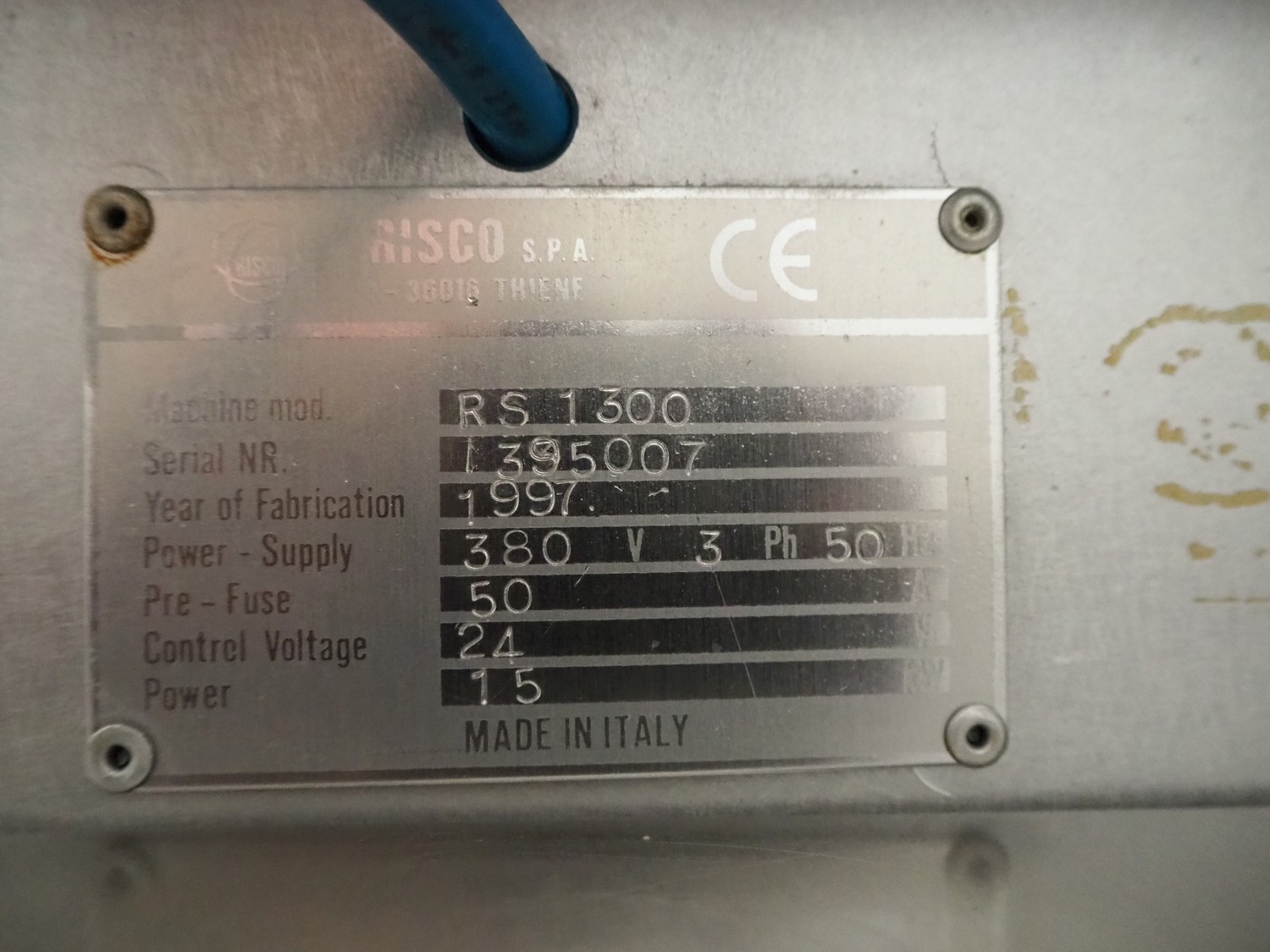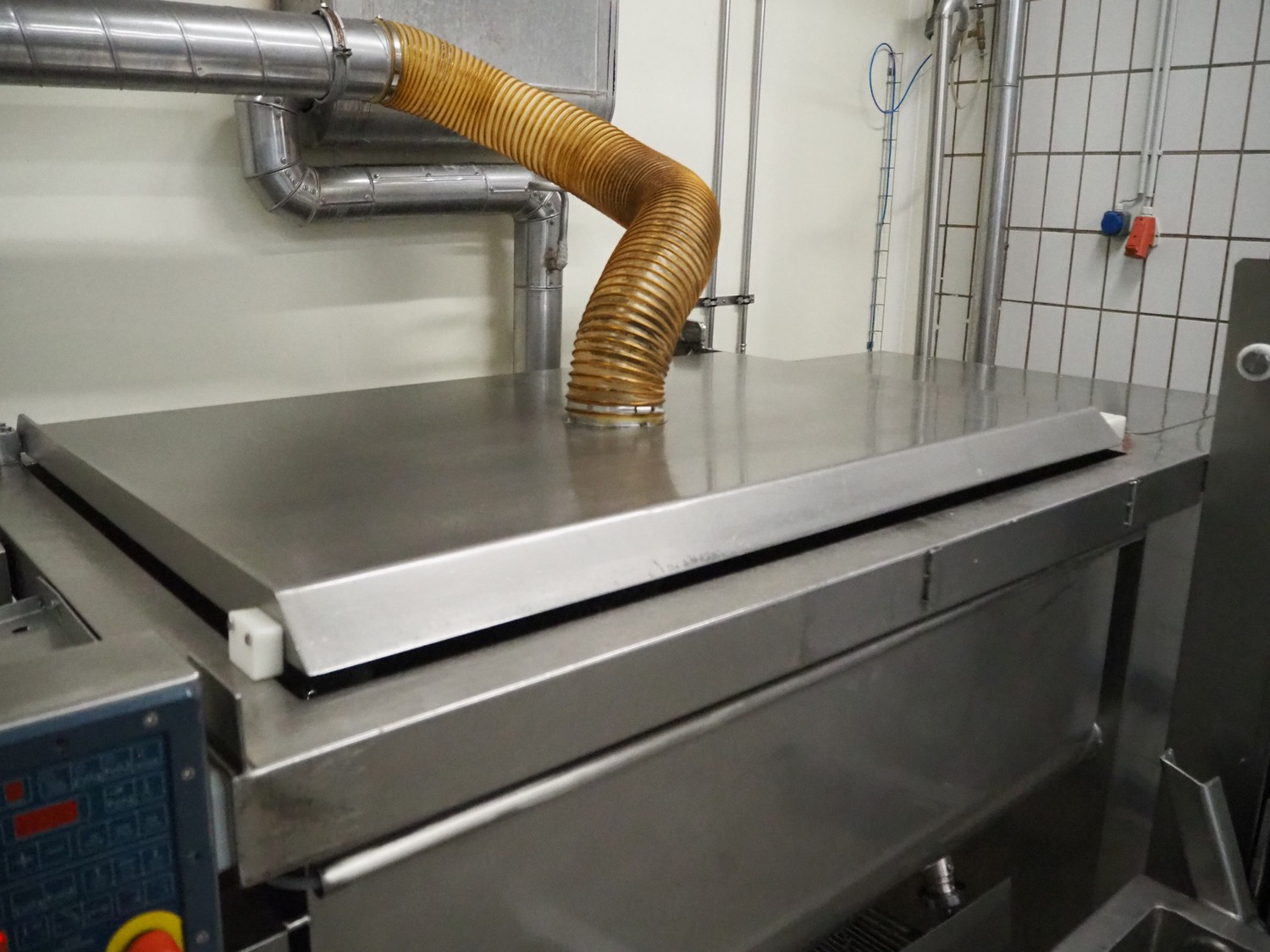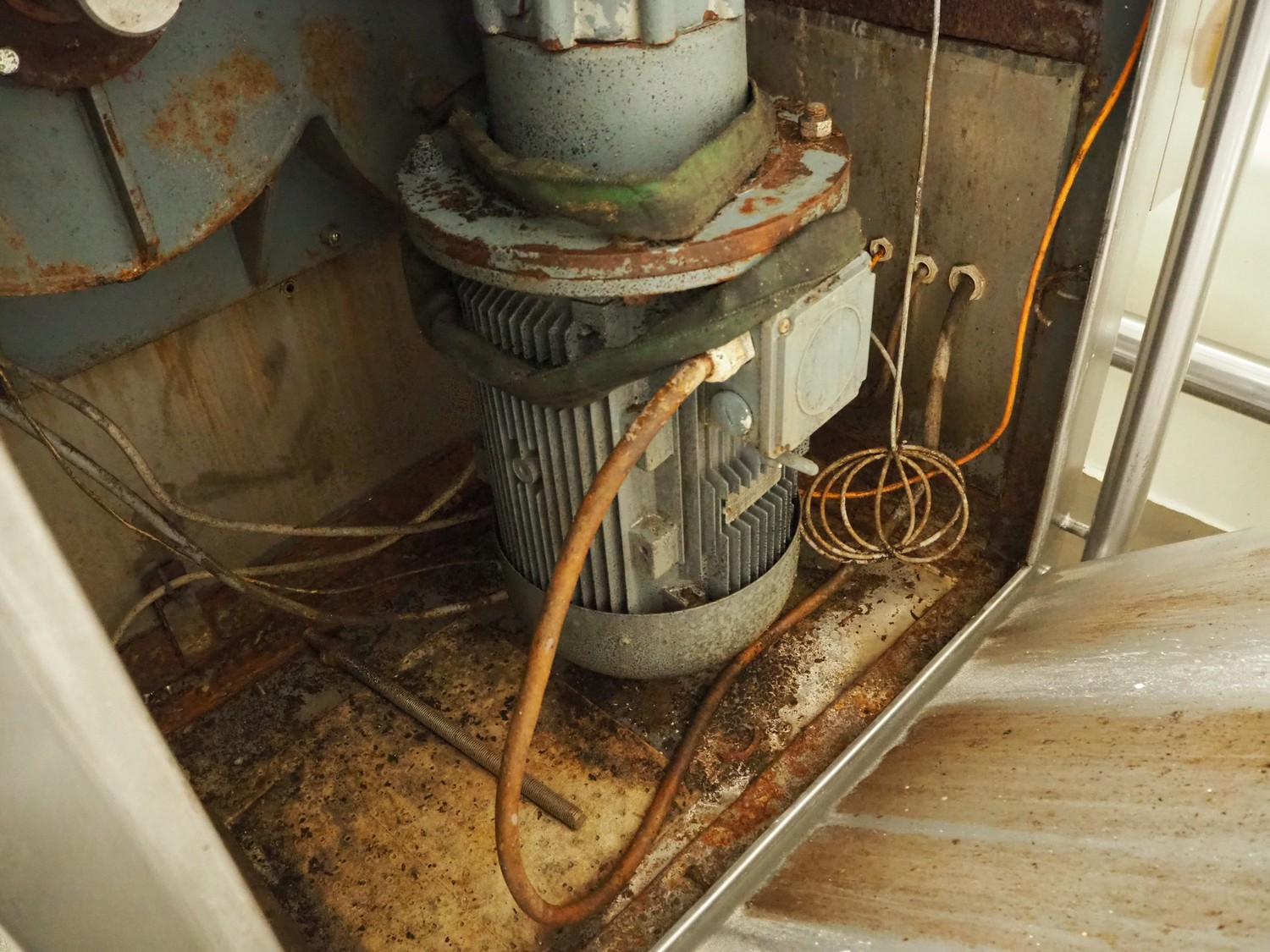 Risco double shaft paddle mixer with lifter for 200 liter meat bins, model: RS 1300, serial number: 1395007, year of construction: 1997, 380 V, 3 Ph, 50 Hz, 15 kW, steam injection, volume: 1300 liter, lifting height: 1900 mm, dimensions lifter: 1200 mm x 650 mm x 2750 mm, dimensions mixer: 3100 mm x 1100 mm x 1800 mm.