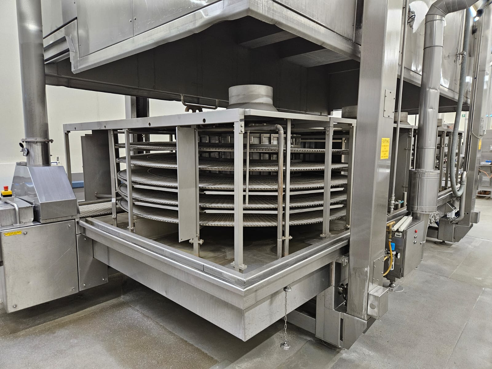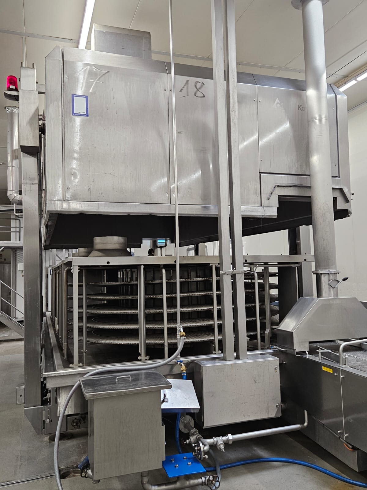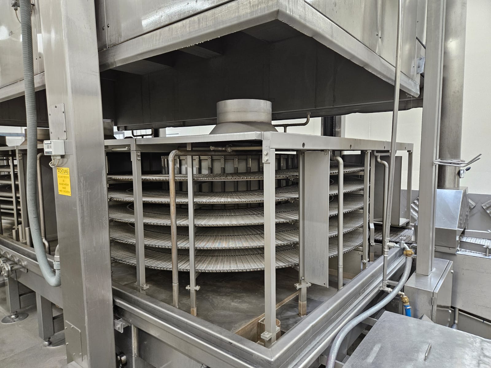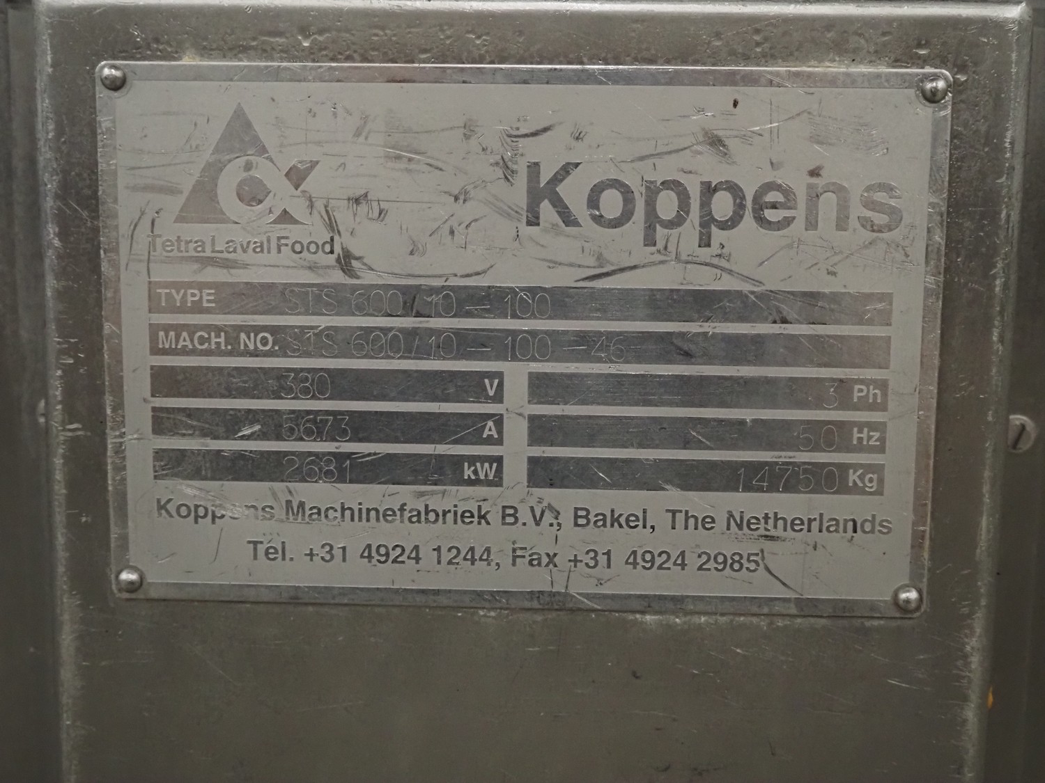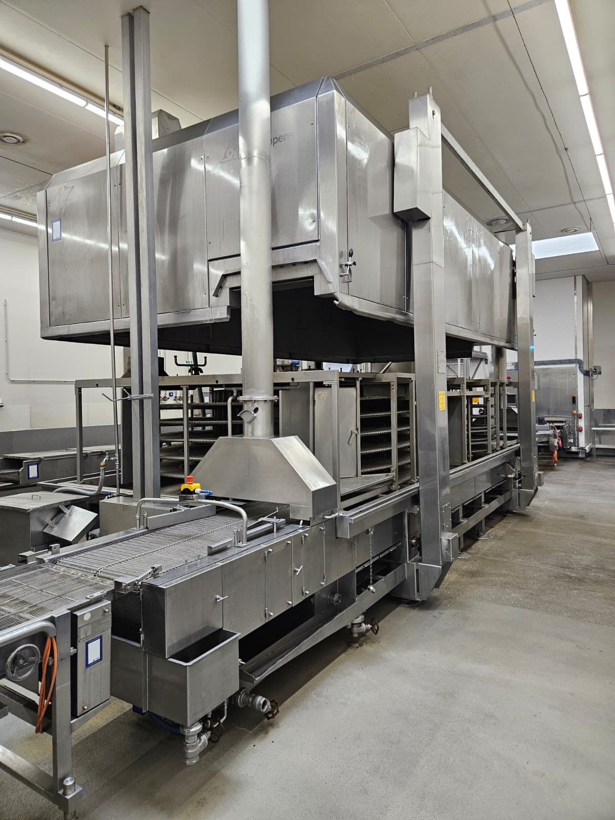 Koppens Machinefabriek B.V. steam heated twin drum spiral oven, type: STS 600/10-100, machine number: STS 600/10-100-46, 380 V, 3 Ph, 50 Hz, 56.73 A, 26.81 kW, weight: 14750 kg, 2 x 5 floors, total belt width: 660 mm, usable belt width: 600 mm, s/s mesh outfeed belt, belt width: 600 mm, total dimensions spiral oven: 9250 mm x 3900 mm x 4300 mm, dimensions switch cabinet: 2000 mm x 400 mm x 2000 mm. Covers spiral oven damaged at lifting points.