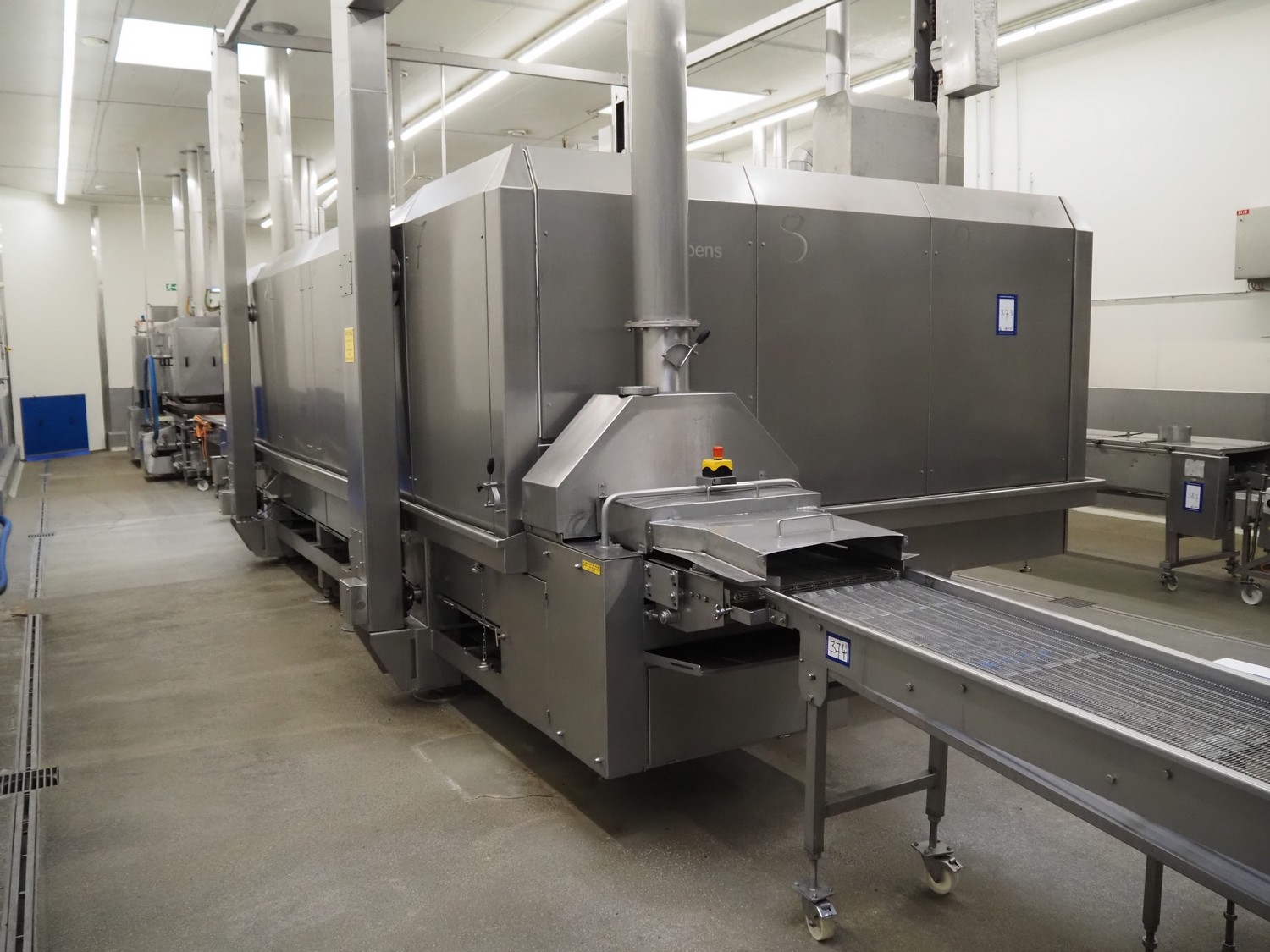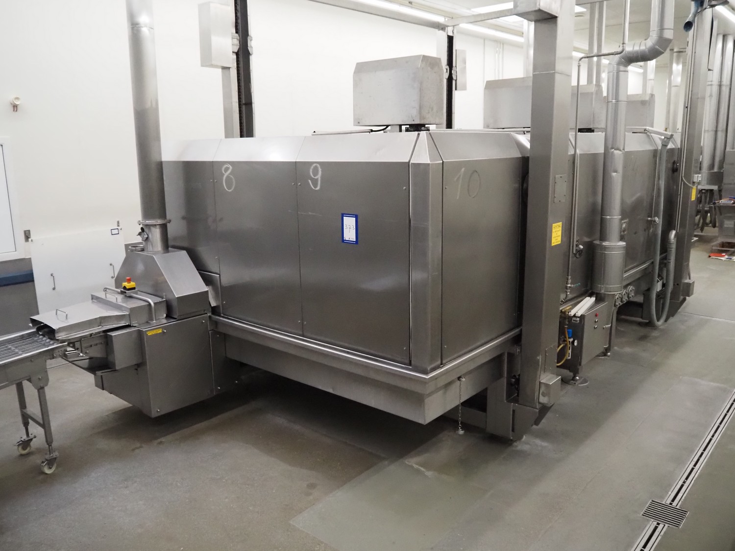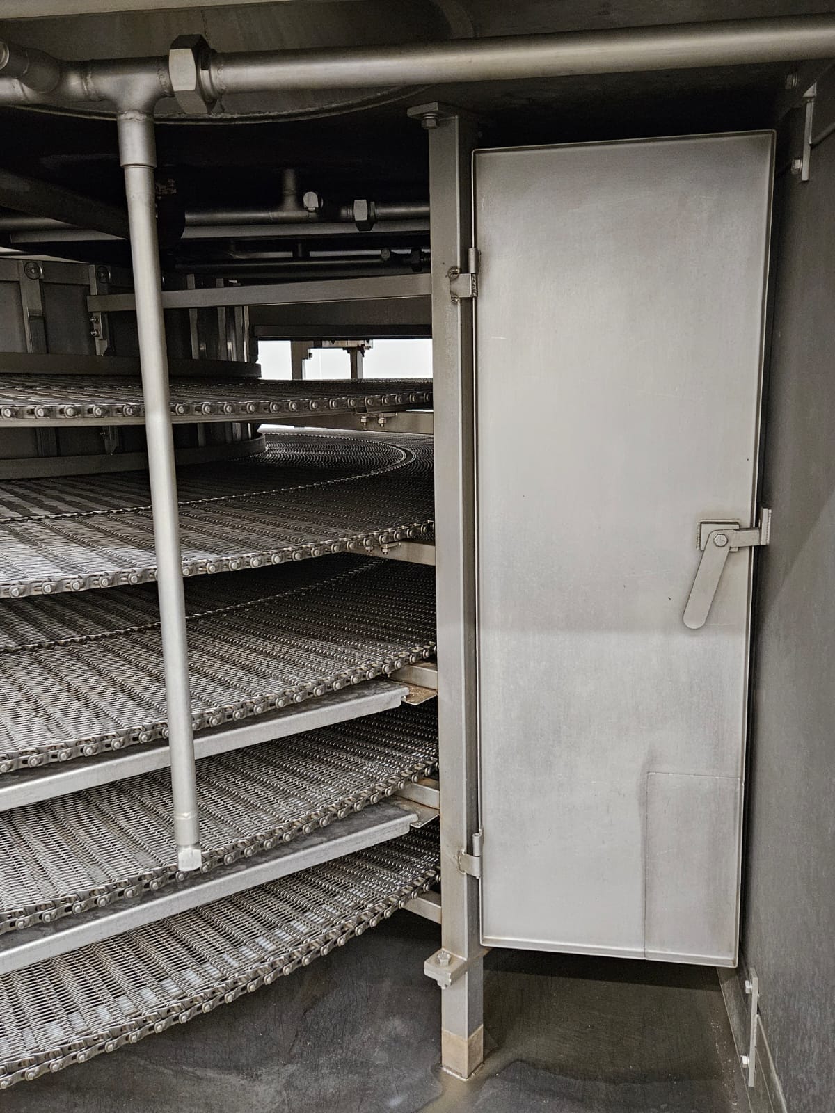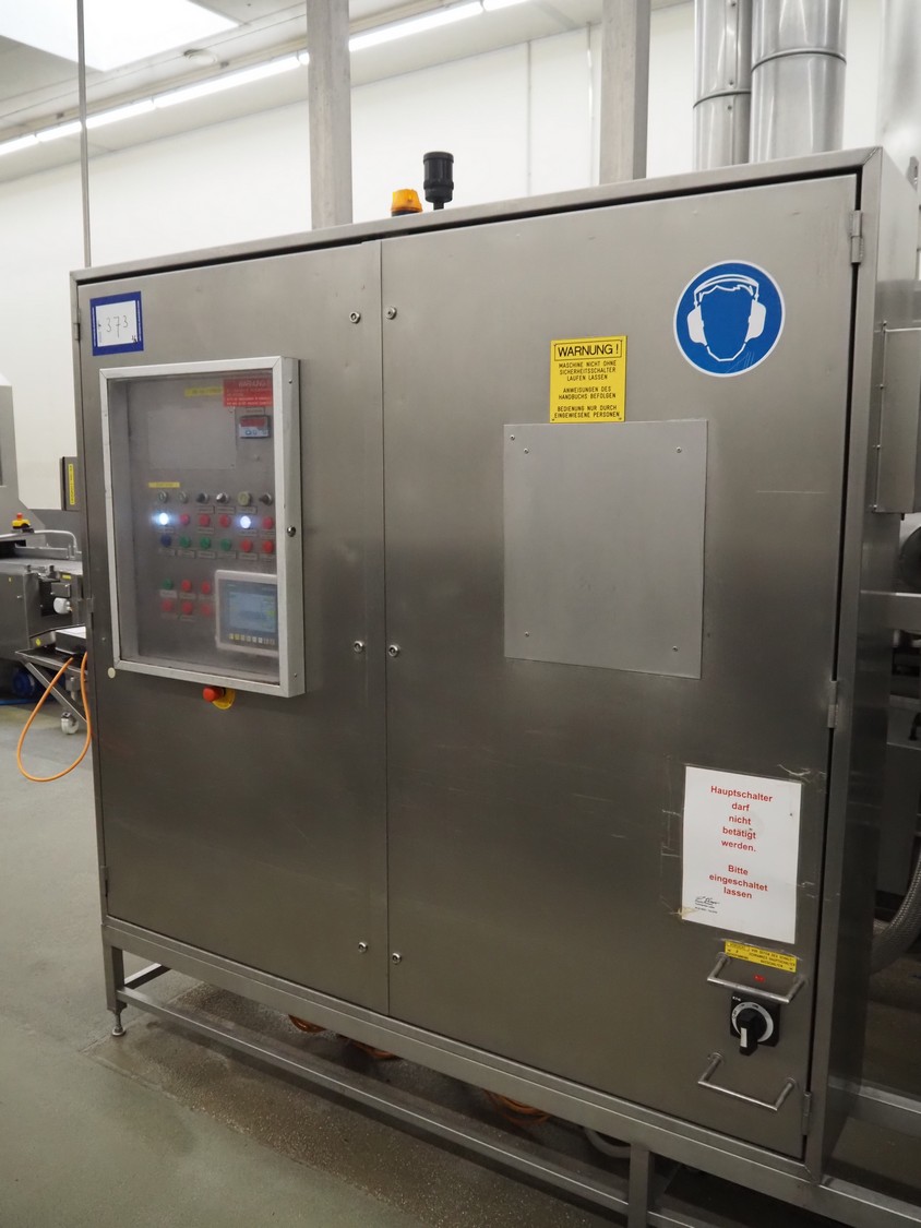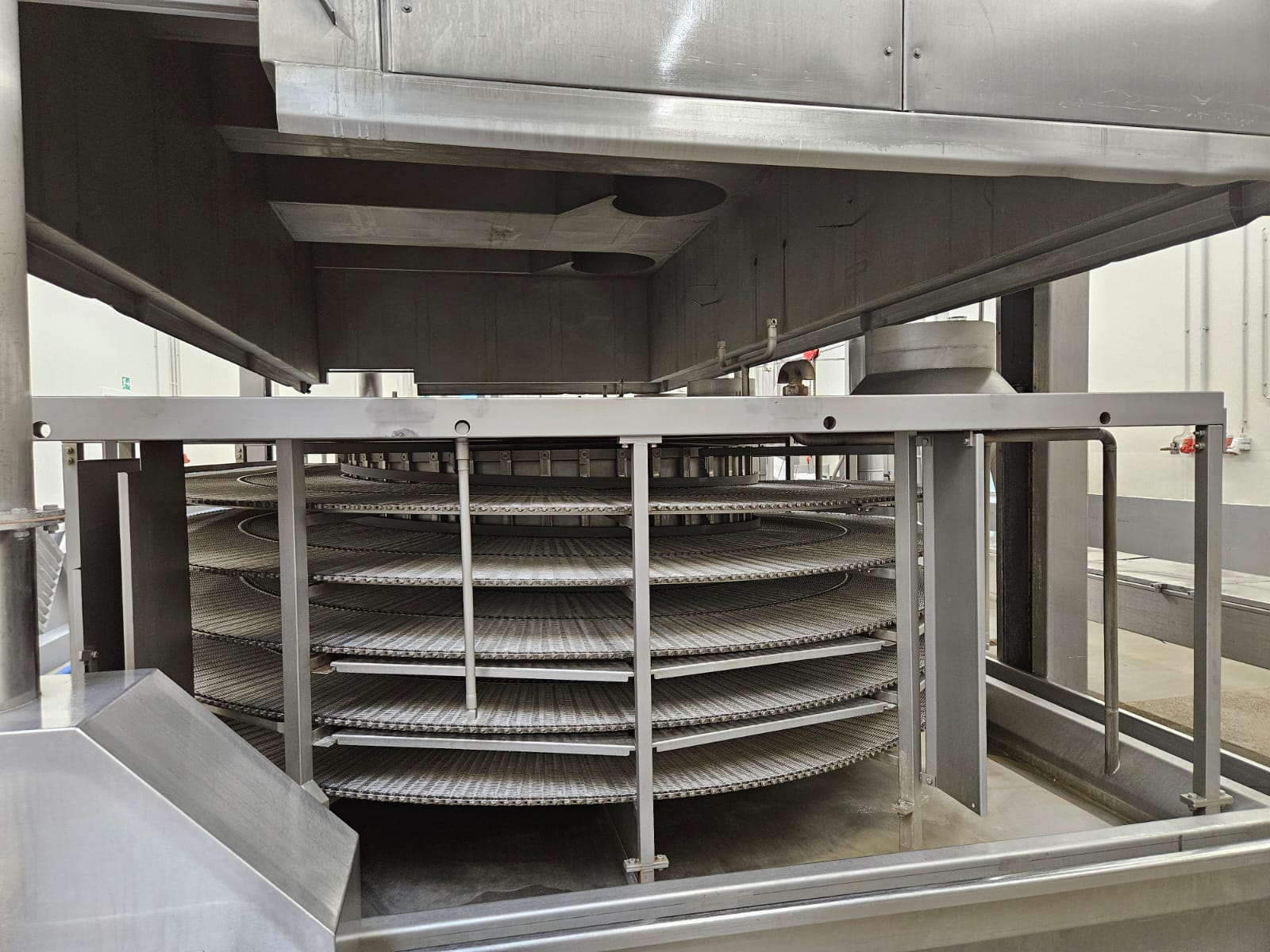 Koppens Machinefabriek B.V. steam heated twin drum spiral oven, type: STS 600/10-100, machine number: STS 600/10-100-46, 380 V, 3 Ph, 50 Hz, 56.73 A, 26.81 kW, weight: 14750 kg, 2 x 5 floors, total belt width: 660 mm, usable belt width: 600 mm, s/s mesh outfeed belt, belt width: 600 mm, total dimensions spiral oven: 9250 mm x 3900 mm x 4300 mm, dimensions switch cabinet: 2000 mm x 400 mm x 2000 mm. Covers spiral oven damaged at lifting points.