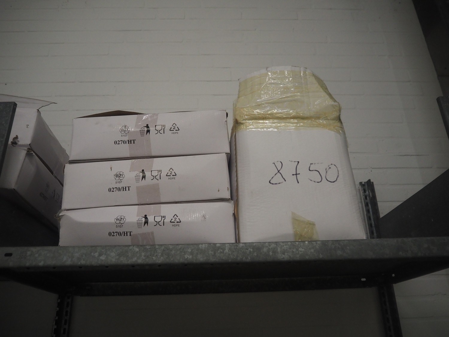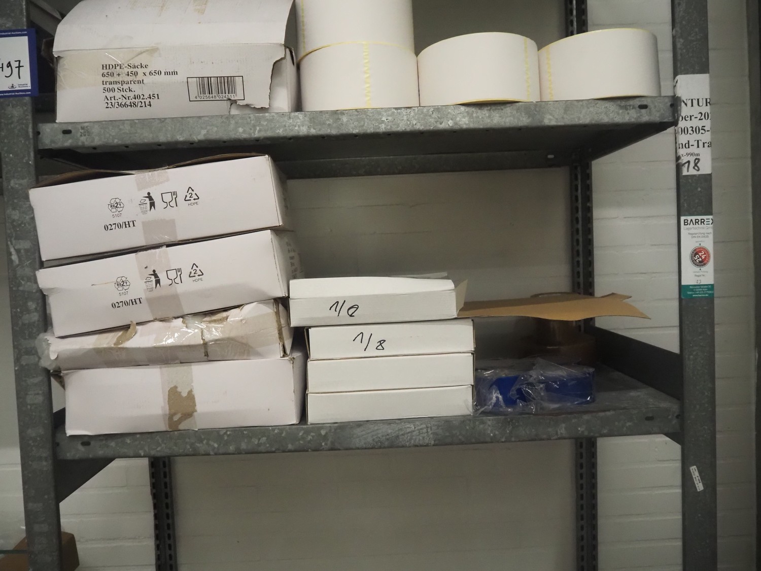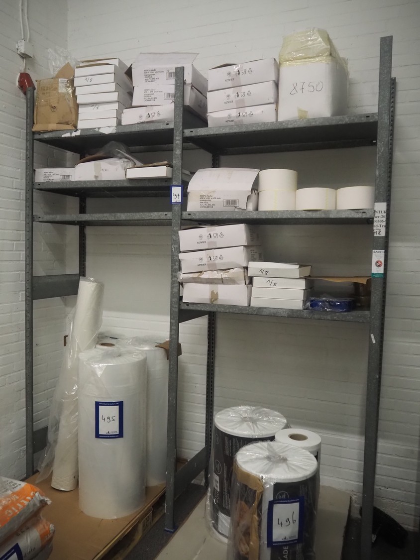 Steel rack with various packaging materials, amongst other bags and labels, dimensions rack: 2070 mm x 540 mm x 2500 mm.