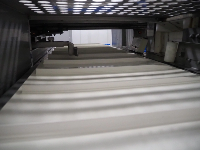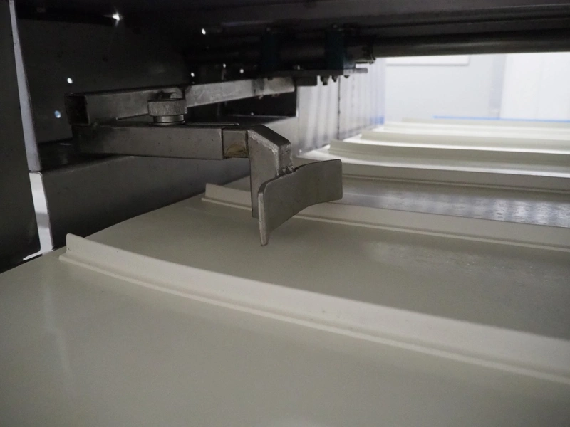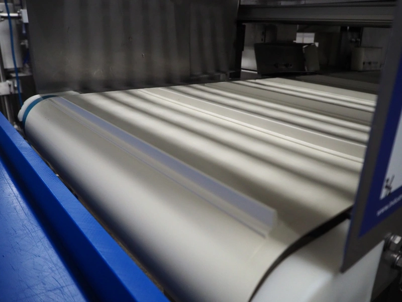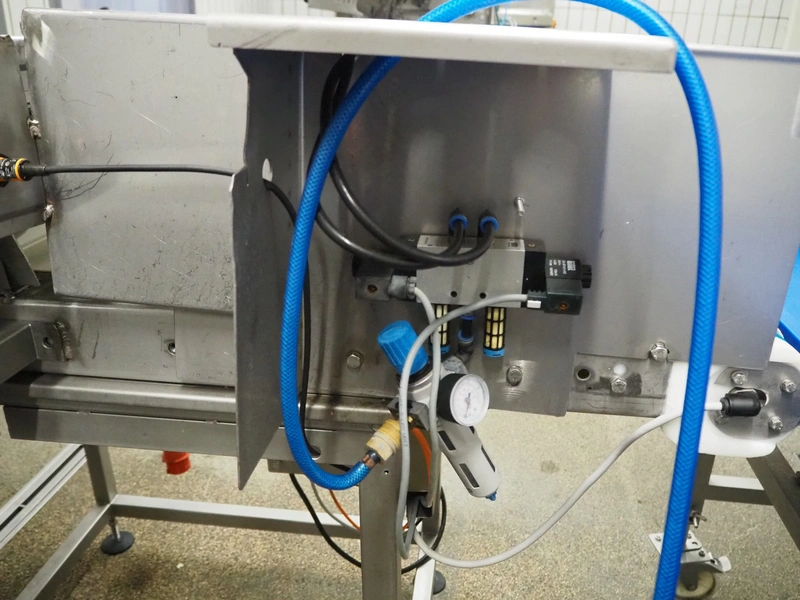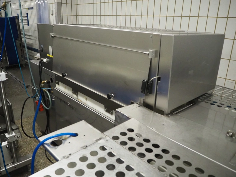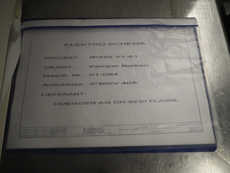 Hoegger meat press, type: IP 320, fabrication number: 01-064, year of construction: 2002, 50/60 Hz, 14 kW, chamber dimensions: 770 mm x 140 mm x 110 mm, total dimensions: 2350 mm x 750 mm x 1700 mm, with outfeed belt, plastic belt with dividers, belt width: 600 mm, divider height: 20 mm, distance between dividers: 300 mm, total dimensions: 2000 mm x 1100 mm x 1200 mm. Mechanical revision in 2024.