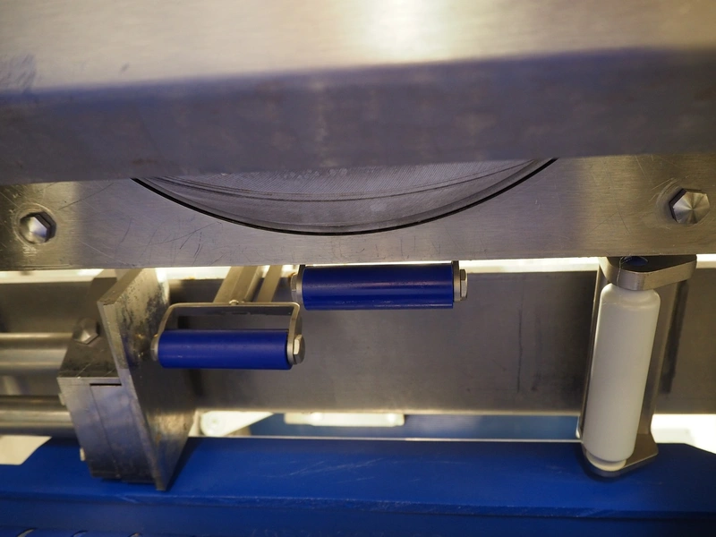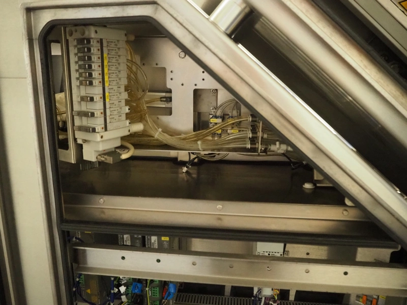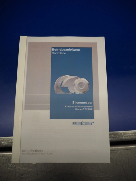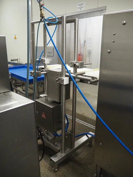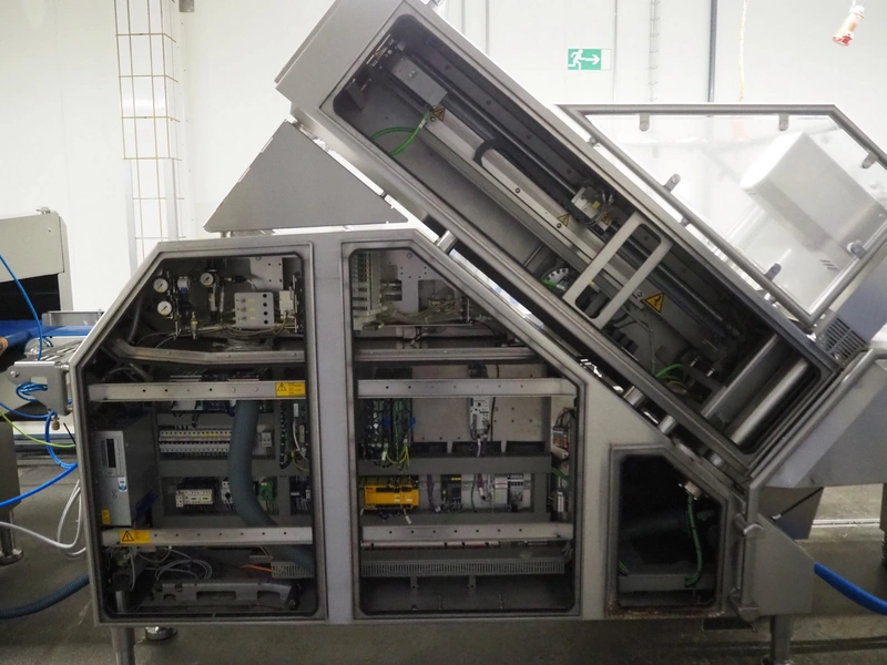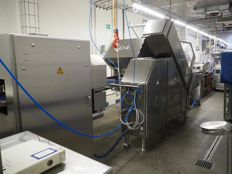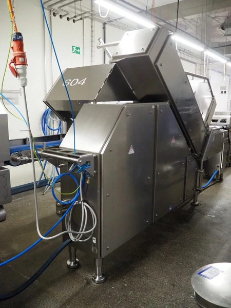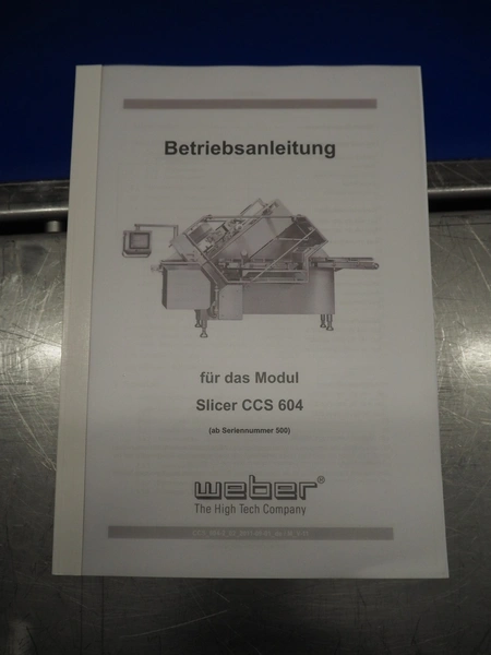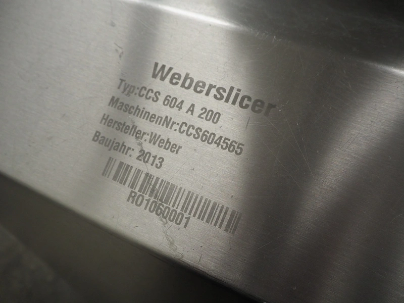 - Weber Maschinenbau GmbH slicer, type: CCS 604 A 200, number: CCS 604-565, year of construction: 06/2013, 400 V, 50 Hz, 10 kW, 6 bar, 80 l/min, weight: 2300 kg, plastic belt, belt width: 440 mm, string outfeed belt, belt width: 330 mm, total dimensions: 4000 mm x 1350 mm x 2450 mm.